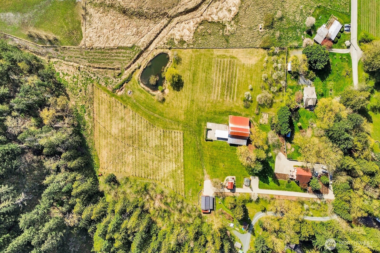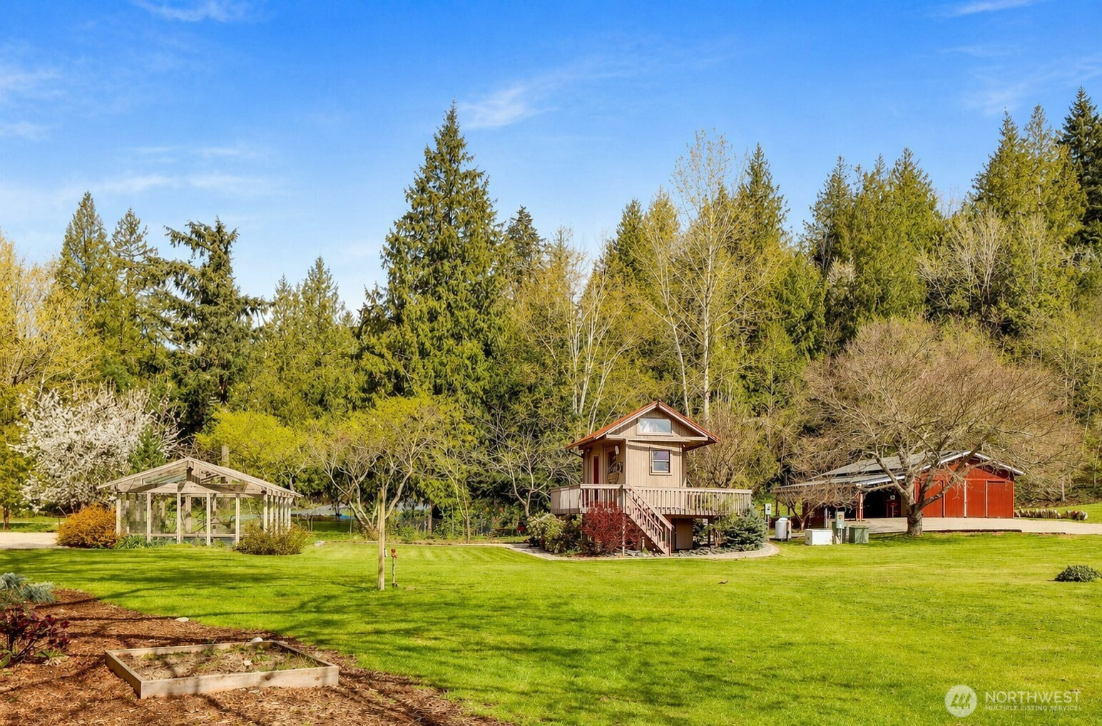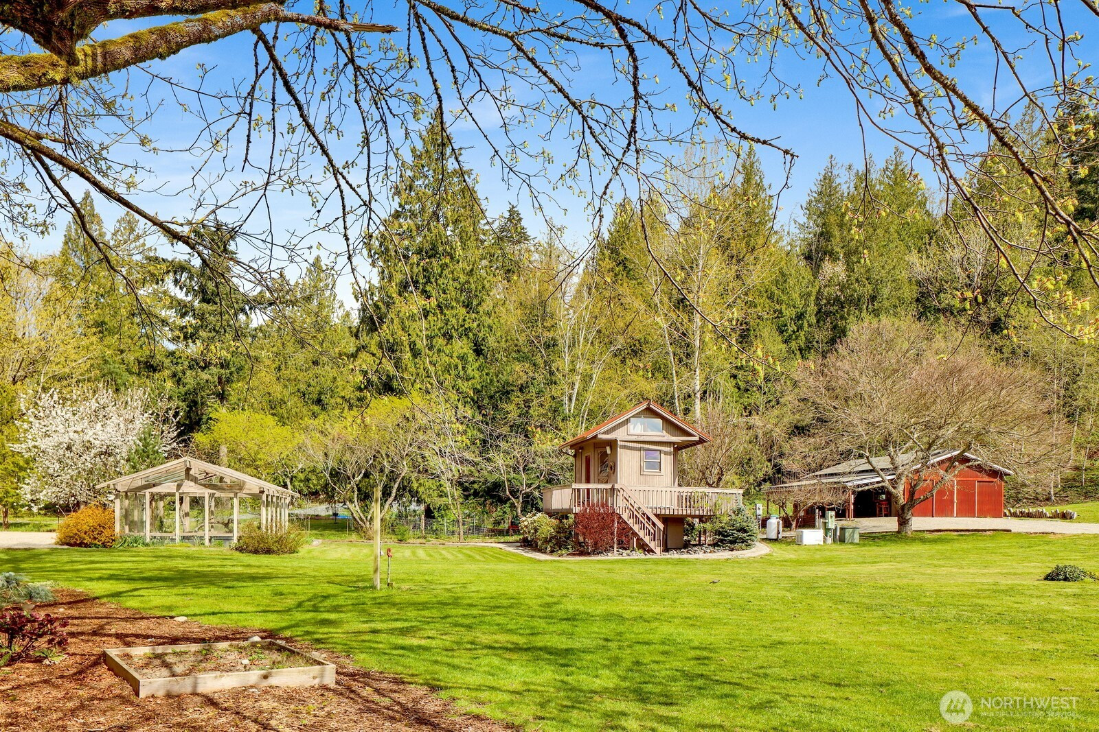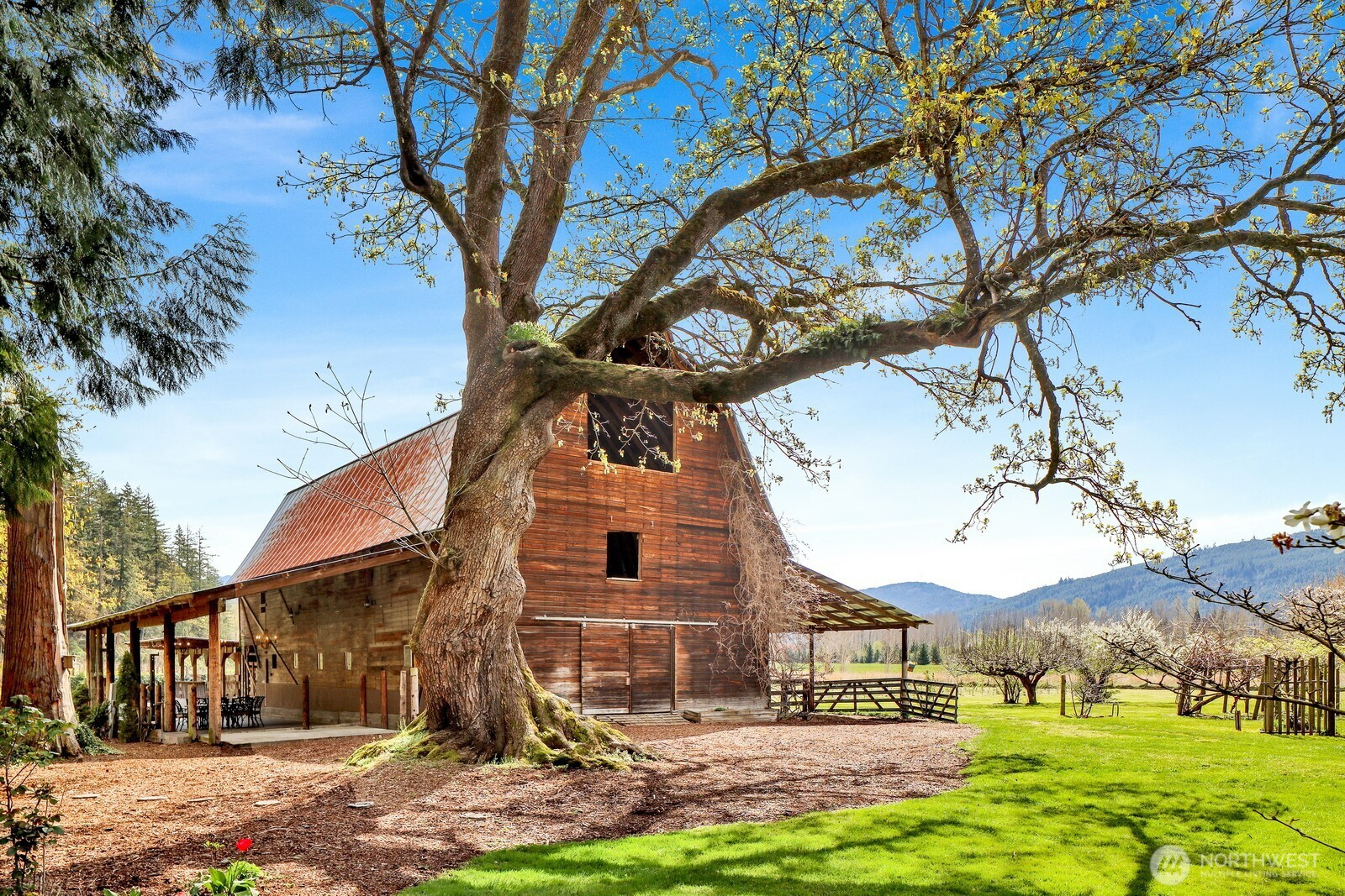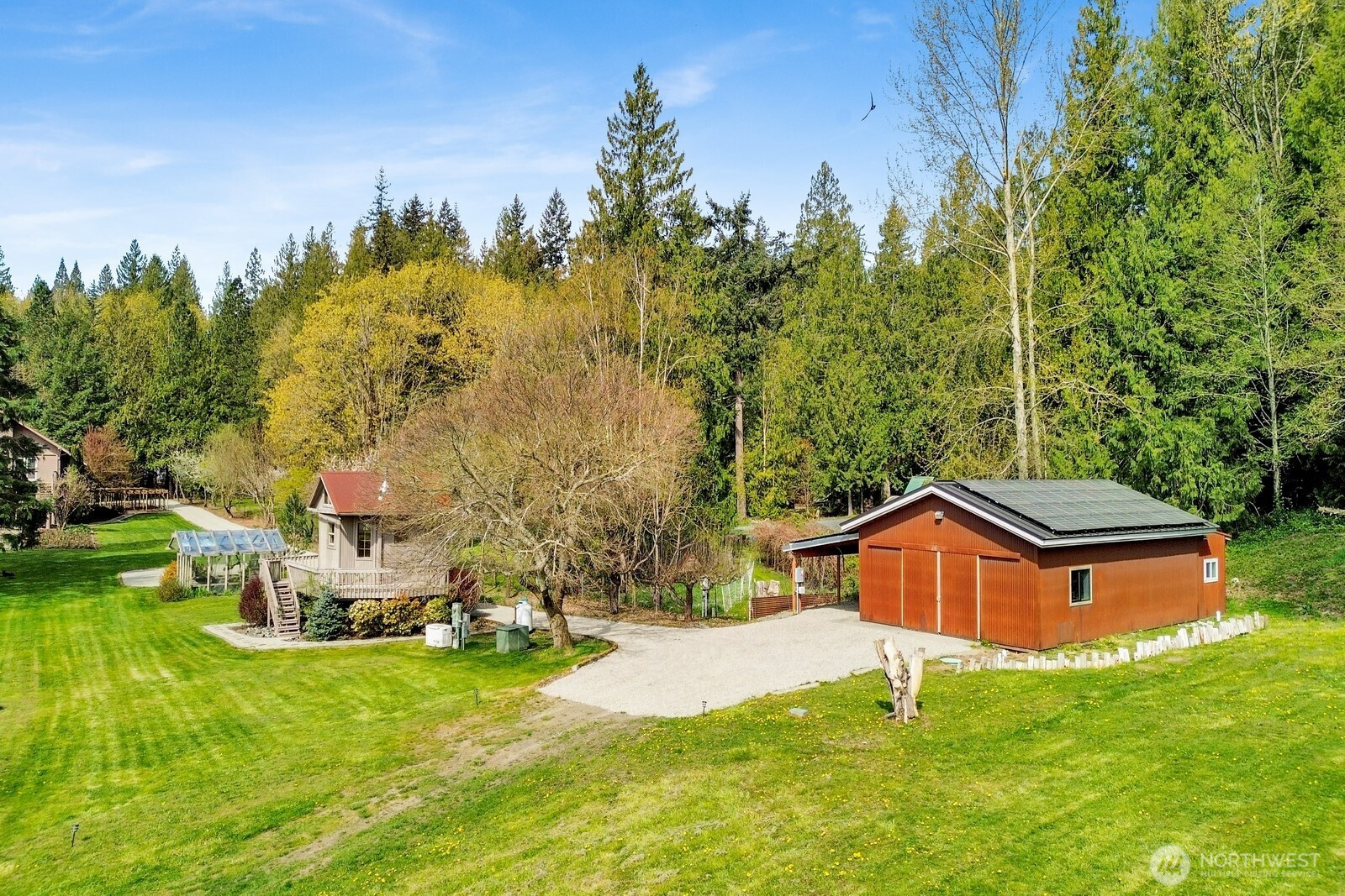 Fifteen self-sustaining acres in the Nooksack Valley, just off Mount Baker Highway and only 12 miles from Bellingham. True energy independence starts with a solar array sized to power the entire estate, backed by a whole-property generator and full irrigation infrastructure. A producing orchard of perennial fruit trees, established gardens, greenhouse, and vineyard — featuring some of the oldest Pinot Noir vines in the Puget Sound AVA — create a foundation for agricultural, lifestyle, or income-producing ventures that is already thriving. The Twin Sisters glacial peaks rise above the valley, visible from nearly every corner of the property. A tranquil pond and hillside forest complete a landscape that feels untouched. A historic barn built in the 1800s adds heritage and authenticity that cannot be replicated. Its covered outdoor space, dressed with chandeliers and framed by the vineyard and valley views, has hosted weddings and candlelit dinners under the stars. The main home features refinished hardwood floors, vaulted ceilings, and exposed beams. A separate cabin offers flexible space — guest quarters, private office, or creative studio. A commercially permitted 1,100 sq ft shop with bathroom adds serious functionality for business or hobbies. Whether you envision a boutique winery, working farm, or private legacy estate — the life you’ve been imagining is already here. It’s just waiting for you.
