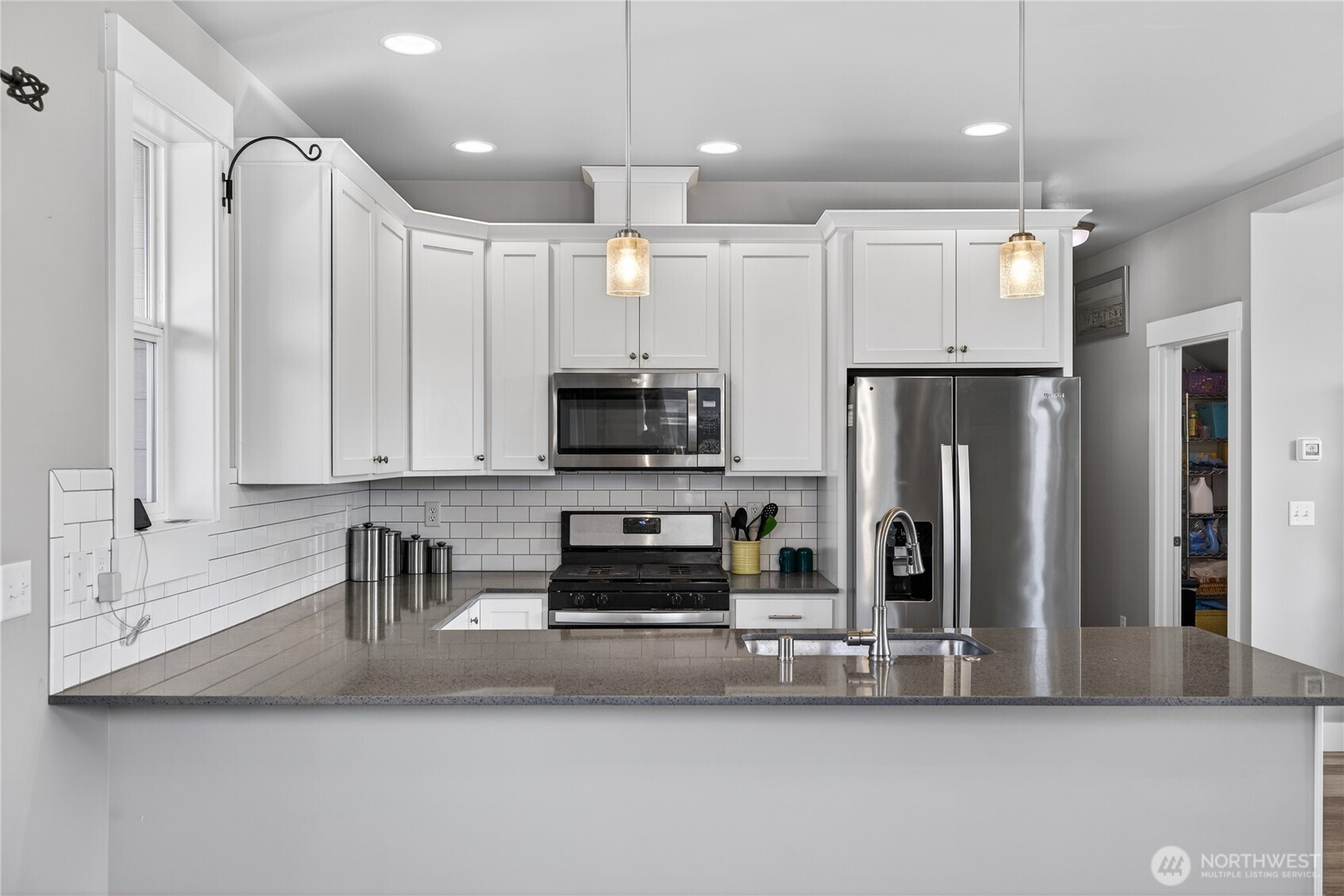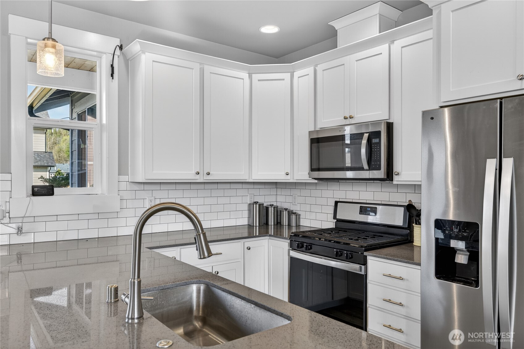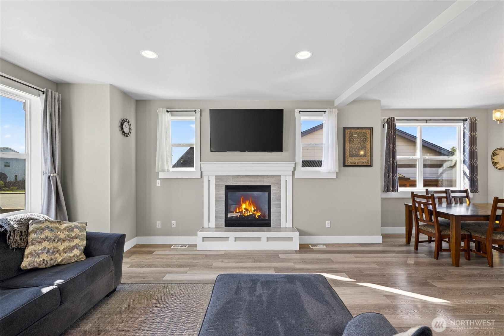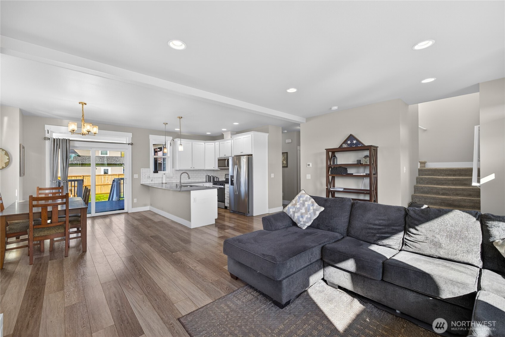 Welcome home to bright, open living filled with natural light and thoughtful design throughout. The main level features a spacious great room with a cozy gas fireplace and seamless flow into the dining area and beautifully appointed kitchen, complete with quartz countertops, stainless steel appliances, ample cabinetry, and a large island perfect for gathering and everyday living. The main floor primary suite offers comfort and privacy with vaulted ceilings, a generous walk-in closet, and a stylish ensuite featuring a custom tile shower and dual vanity. Additional flexible living spaces provide room for guests, work-from-home setups, or hobbies. Upstairs, you’ll find well-sized rooms with great light and versatility to fit your lifestyle. Storage is abundant with multiple closets and a centrally located laundry area for convenience. Step outside to enjoy a fully usable, level backyard with a cedar privacy fence, ideal for entertaining, pets, or relaxing evenings. The covered front porch and back deck extend your living space year-round. An attached two-car garage offers plenty of room for parking and storage. Clean, modern finishes, a functional layout, and easy access to nearby parks, dining, and daily amenities make this home a standout opportunity.