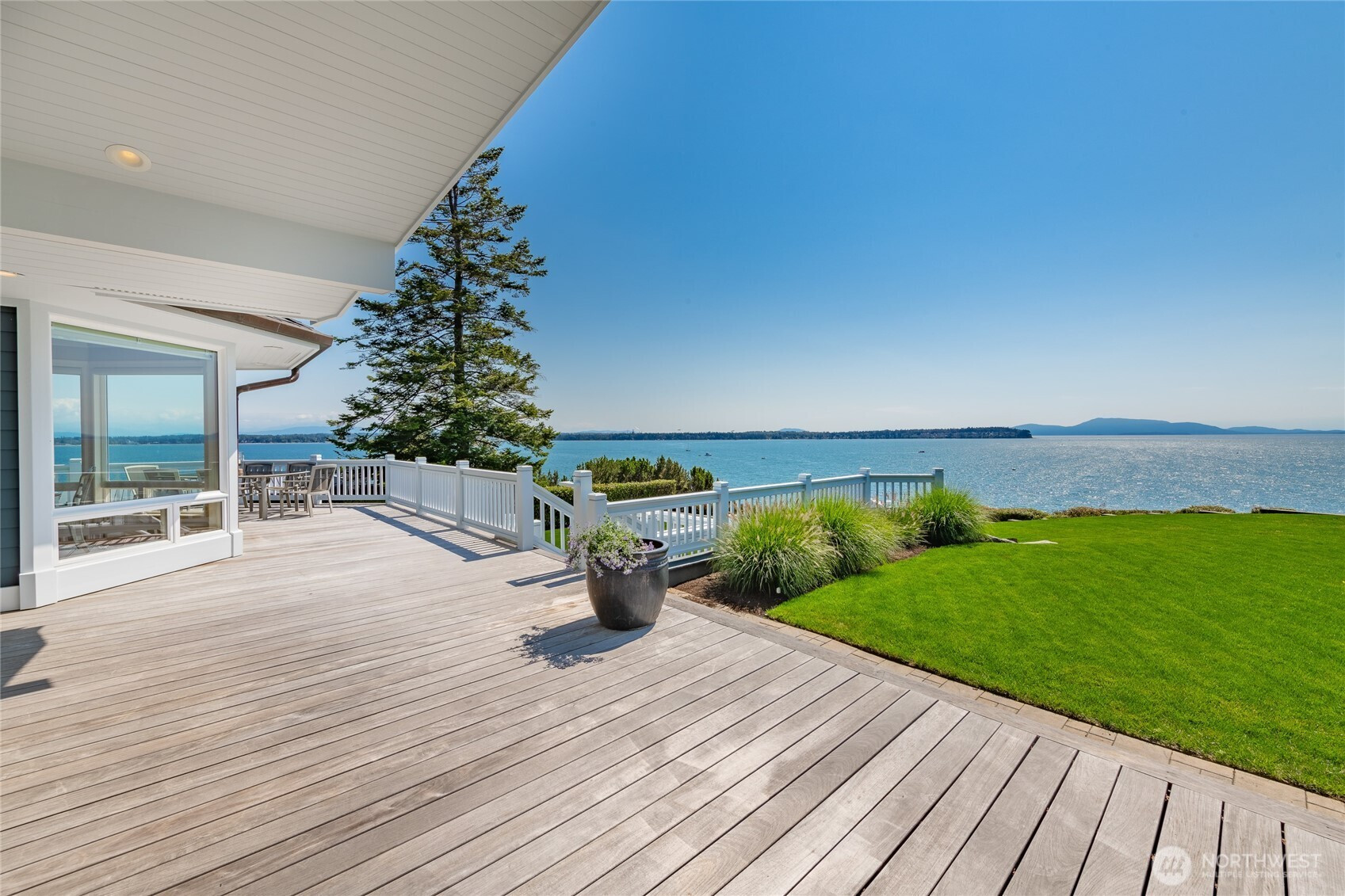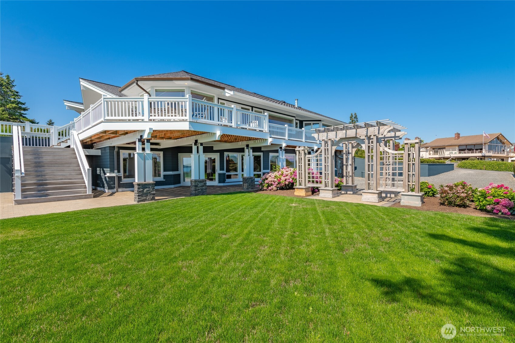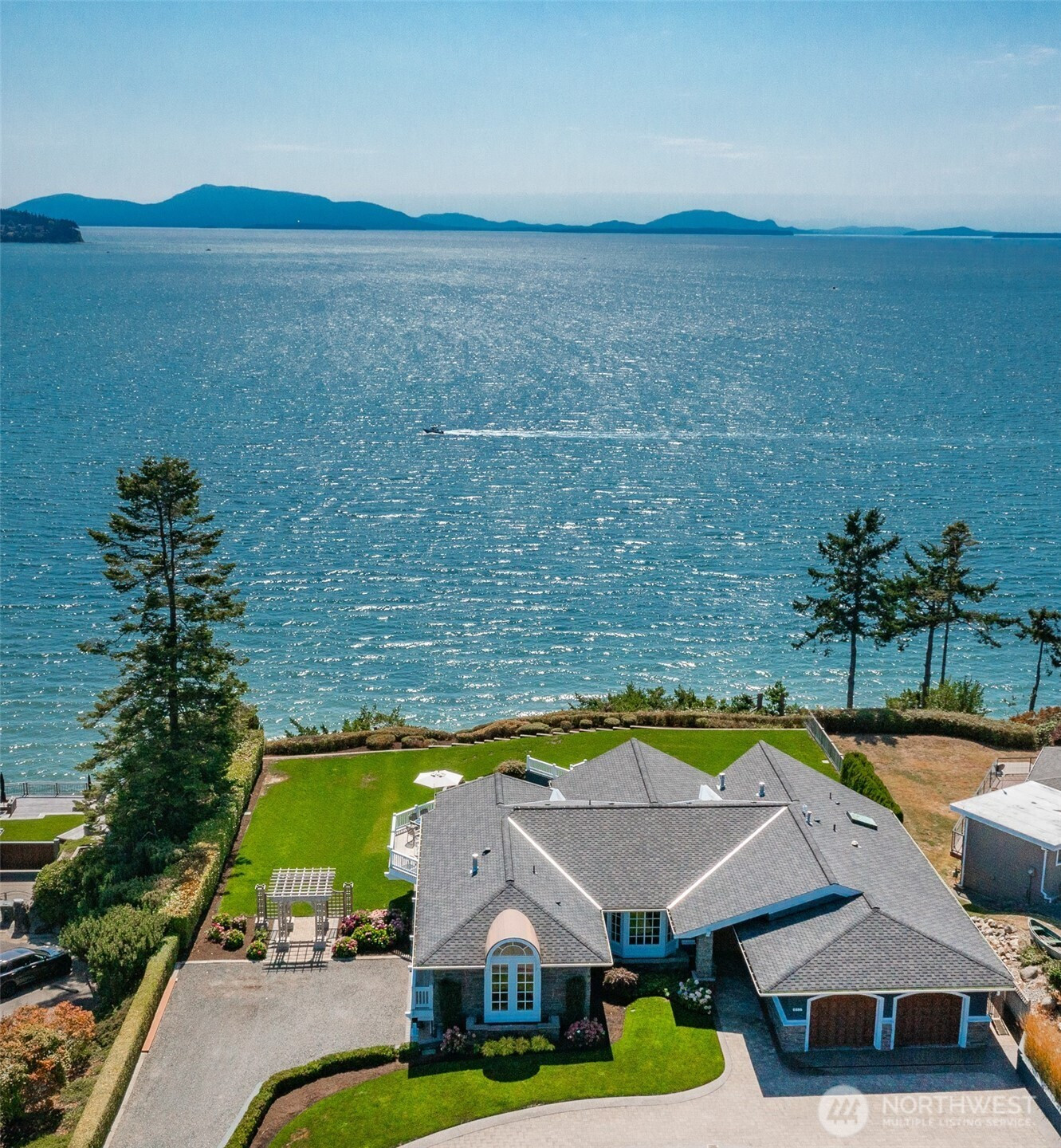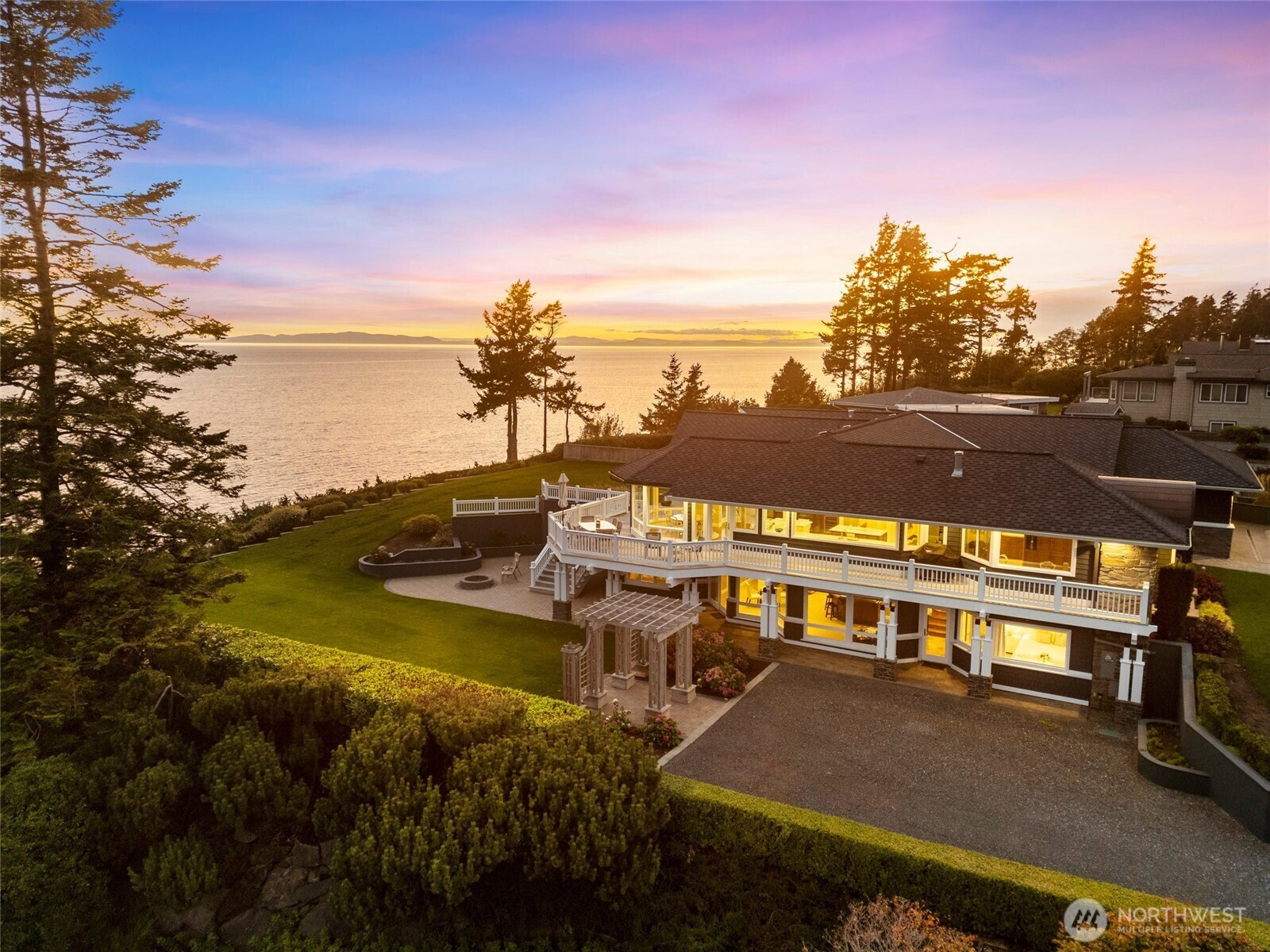 Over 270 degree stunning views of Mt. Baker, Birch Bay, San Juan & Gulf Islands. Elegant retreat offers rare opportunity on .55 acre lot w/123' of waterfront. Exquisite blend of sophistication & tranquility. Designed to perfection, featuring seamless flow for ambiance of refined living. Gourmet kitchen is a culinary delight, Miele/Sub-zero & custom cabinetry. Primary bed w/luxurious retreat, walk-in closet w/private laundry. Main floor guest En-suite/office. Lower level boasts impressive media room/cherrywood bar/2 guest rooms & full bath/utility. Expansive deck for endless entertaining. RV parking & steps to the beach! This home is a masterpiece, that equals the epitome of waterfront living. Private marina, golf, beach and security gate.