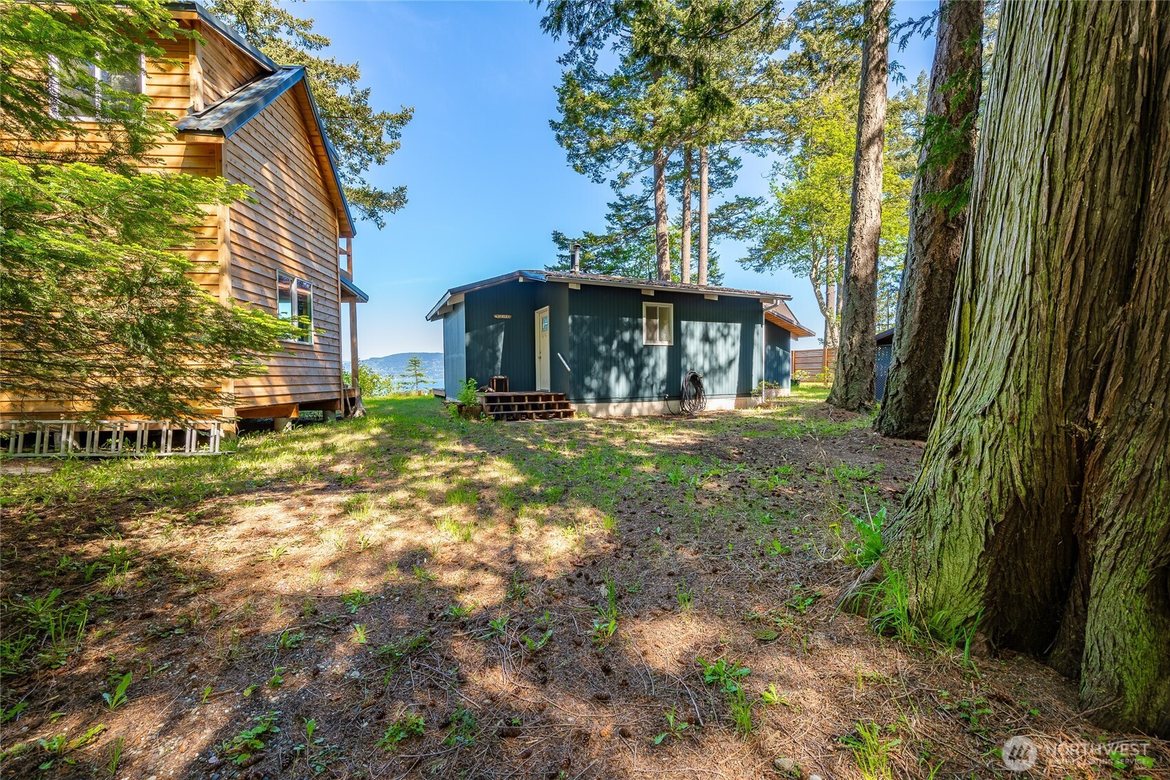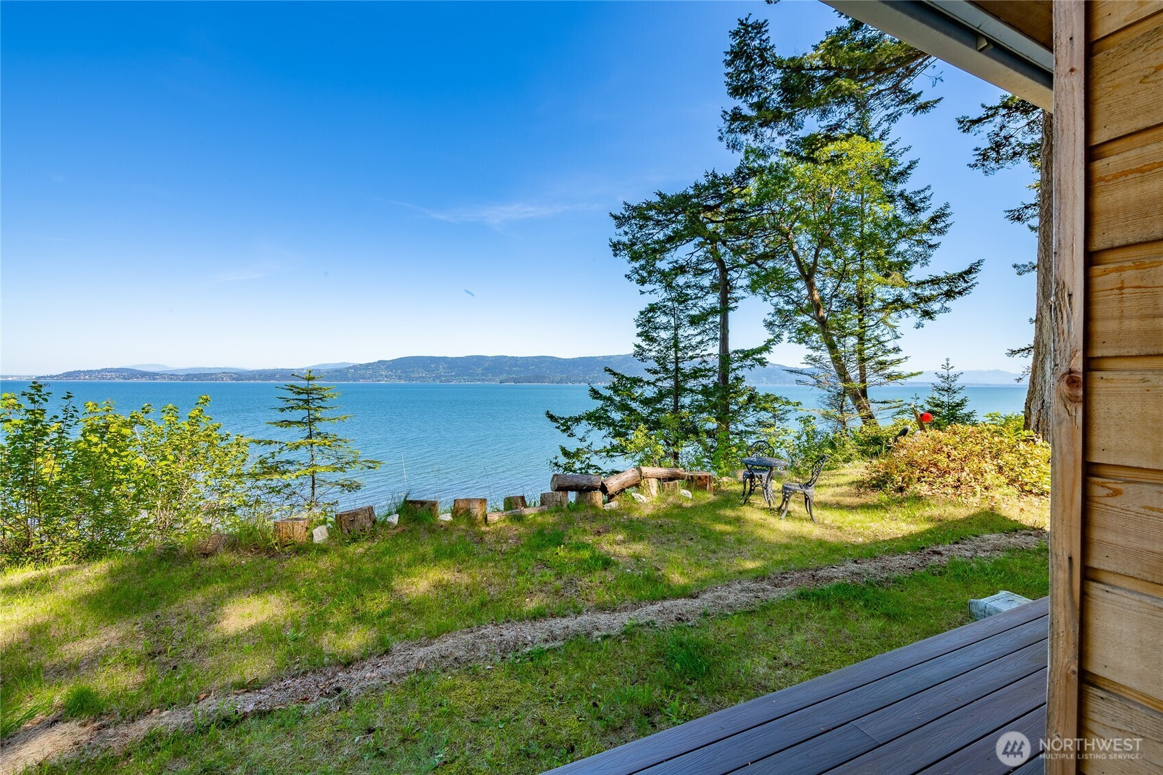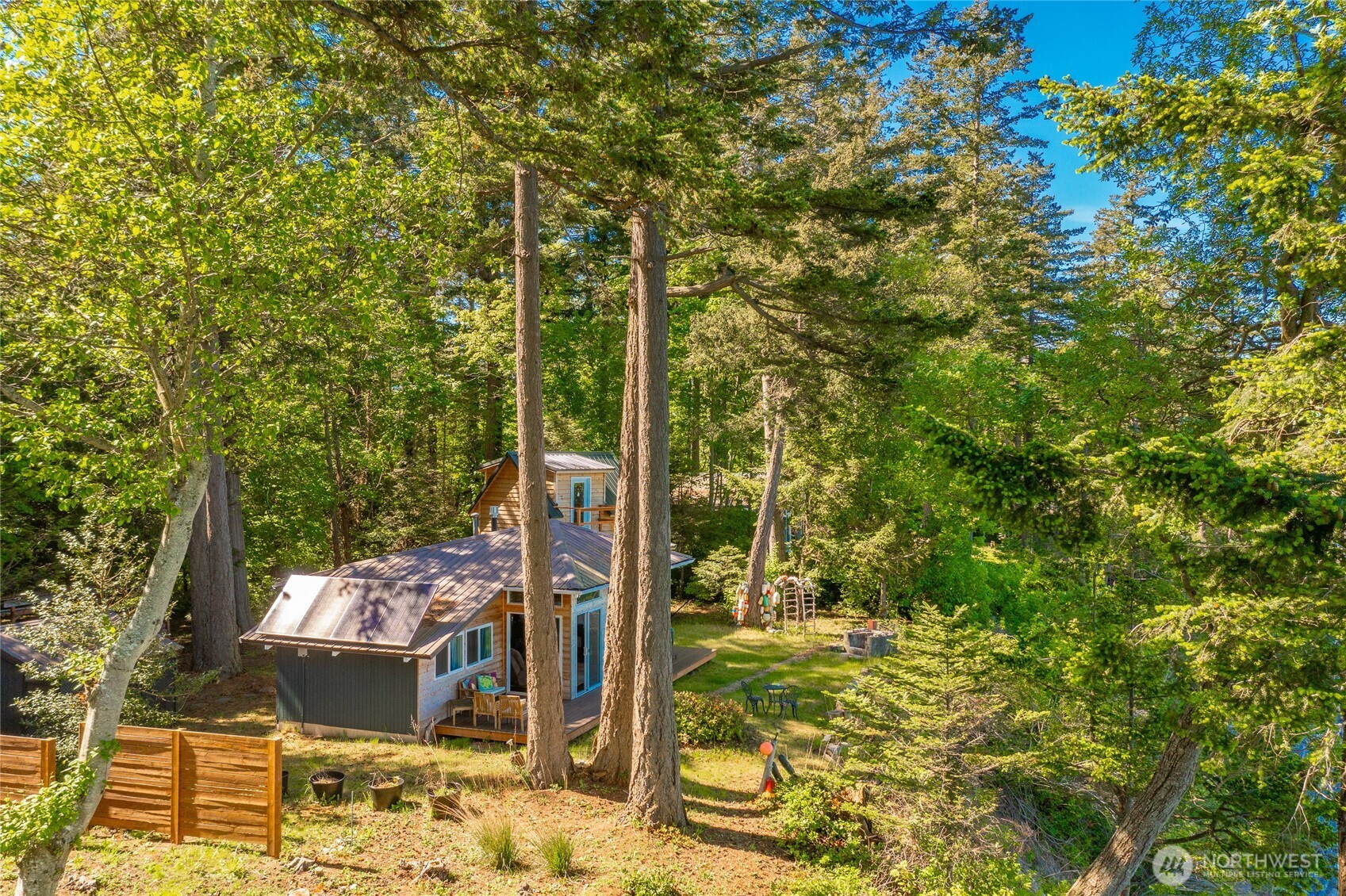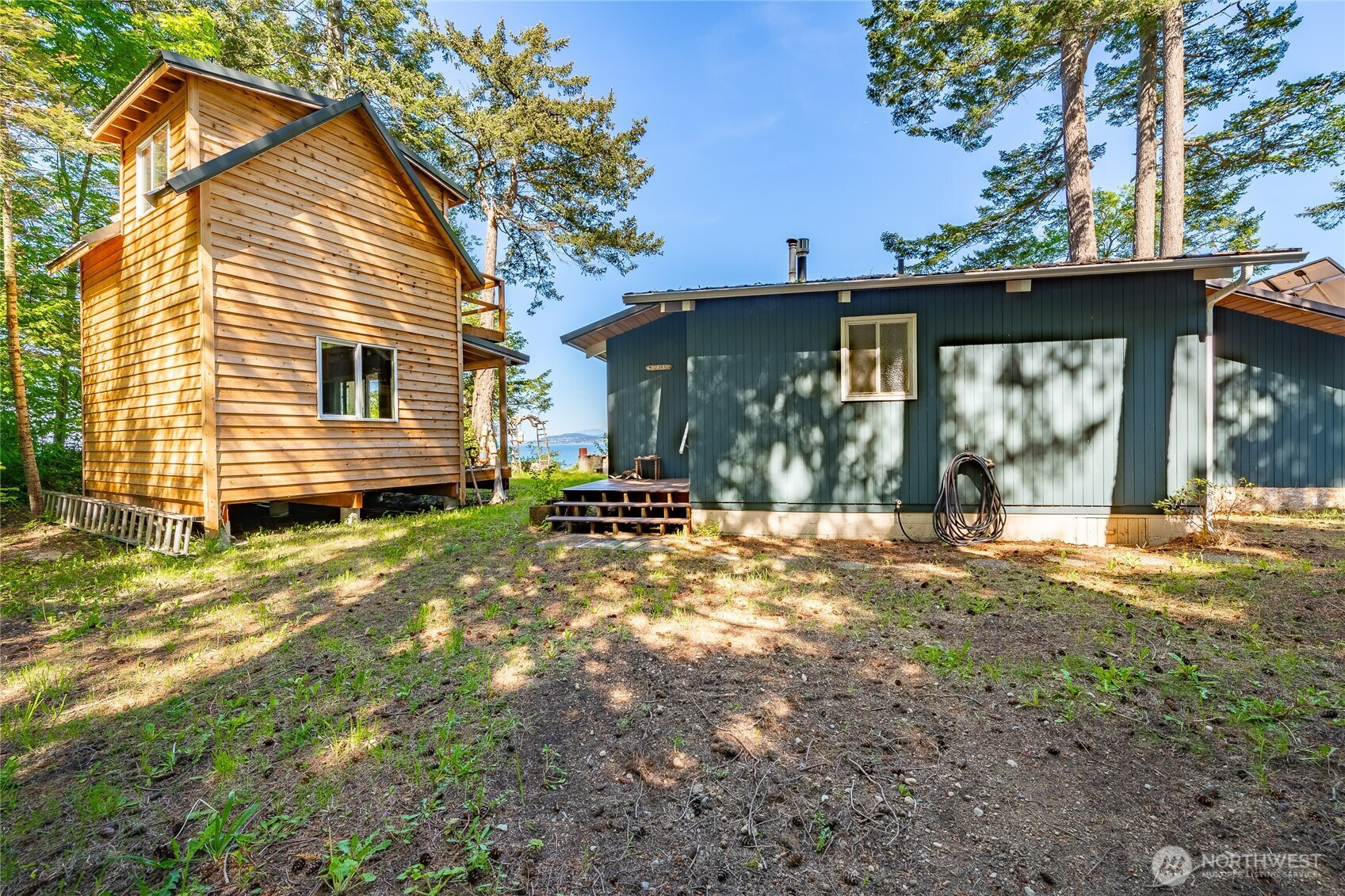 High bank waterfront cabin on private Eliza Island, just off the coast of Bellingham in Whatcom County. This 2-bedroom retreat captures sweeping eastern views of Bellingham Bay, the Canadian mountain range, and Chuckanut, with stunning sunrise exposure that fills the home with natural light. The cabin features natural wood interior paneling and vaulted ceilings that create a warm, open feel. A propane stove adds comfort year-round, while the propane paired with a solar and battery-powered inverter supports easy off-grid living. An additional unfinished outbuilding offers flexibility to make it your own—ideal for a bunkhouse, storage, an office, or a creative space. There is no direct beach access from the lot, but nearby access points are just a short walk or golf cart ride away, making it easy to enjoy. This property is well-suited for shared ownership—consider partnering with friends, or colleagues to create a private island retreat and maximize use throughout the year. While short-term rentals are not allowed on Eliza Island, co-ownership provides a smart and enjoyable way to experience island living. Island amenities include a full-time caretaker, tideland rights, beach access points, park areas, and a private airstrip (WA93), making it a great option for aviation enthusiasts or those seeking a true Pacific Northwest island escape. Located approximately 20 minutes from Bellingham by boat, with walk-on water taxi access available. No rentals allowed.