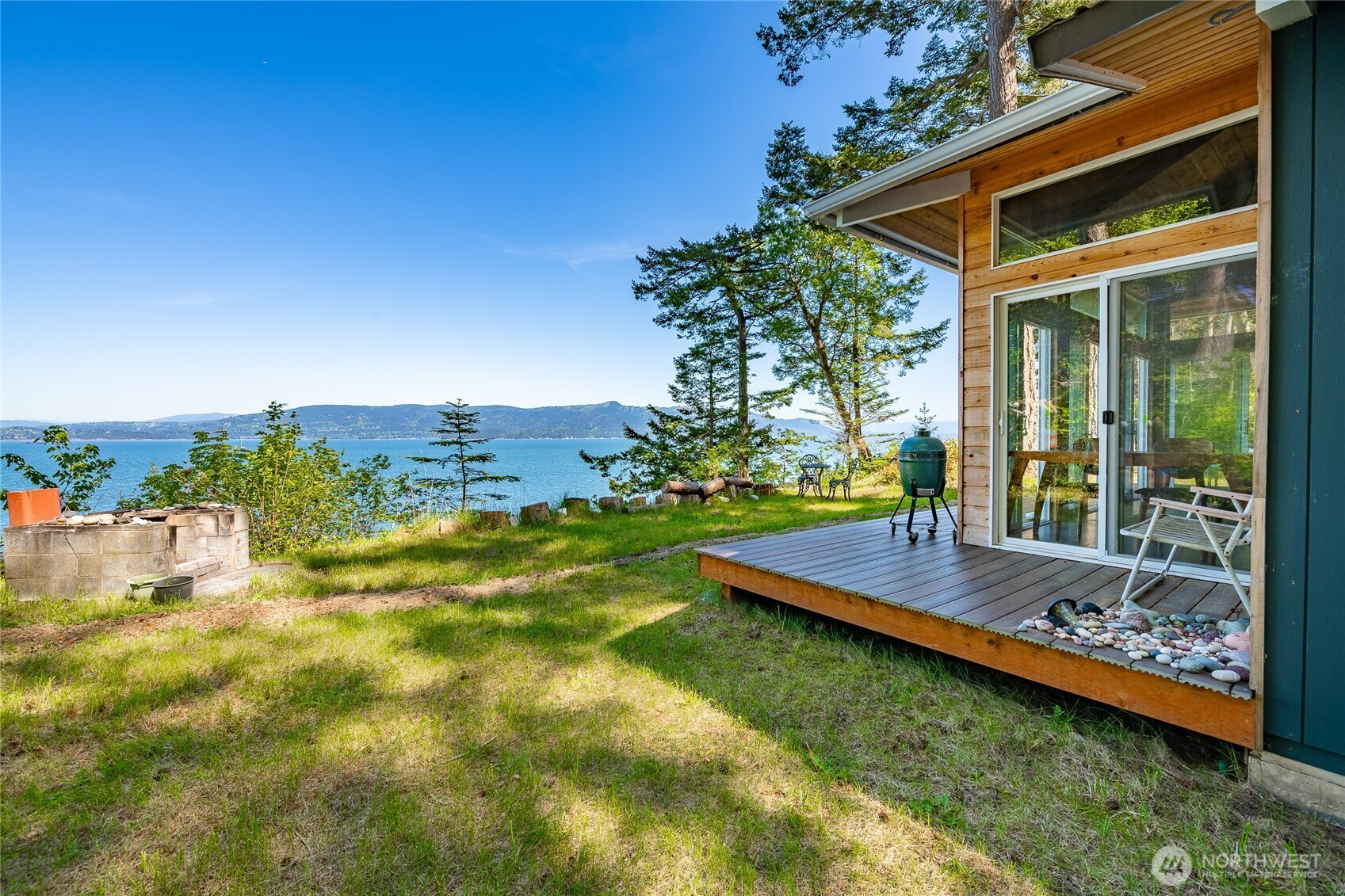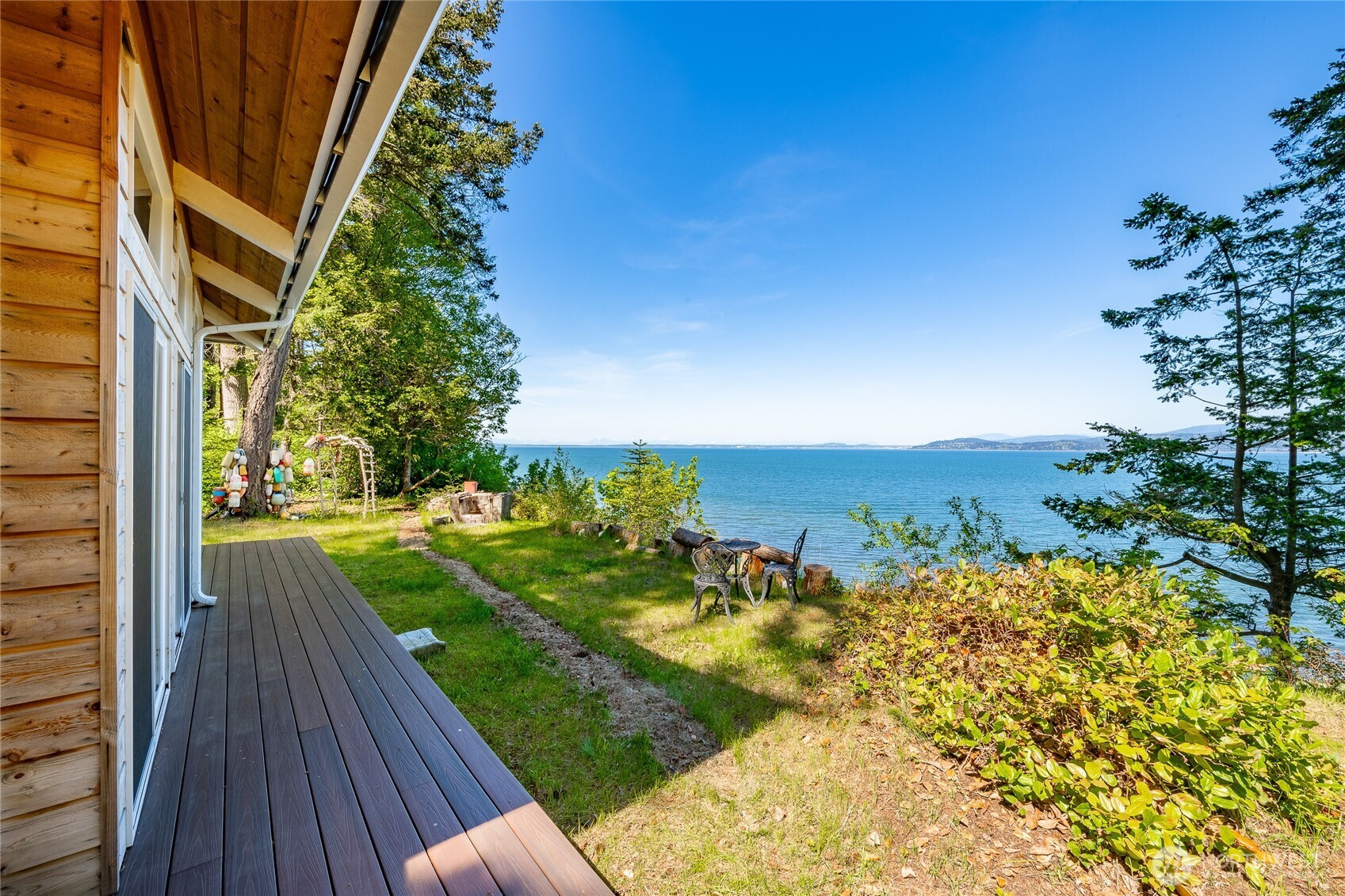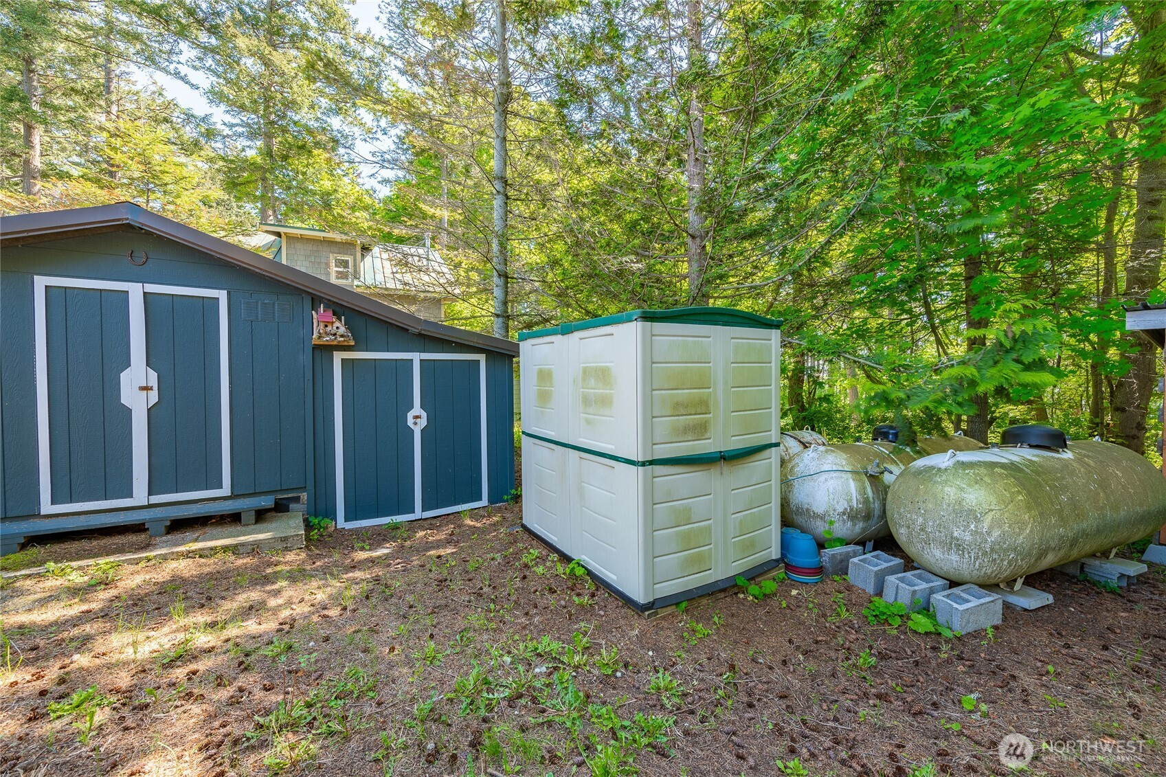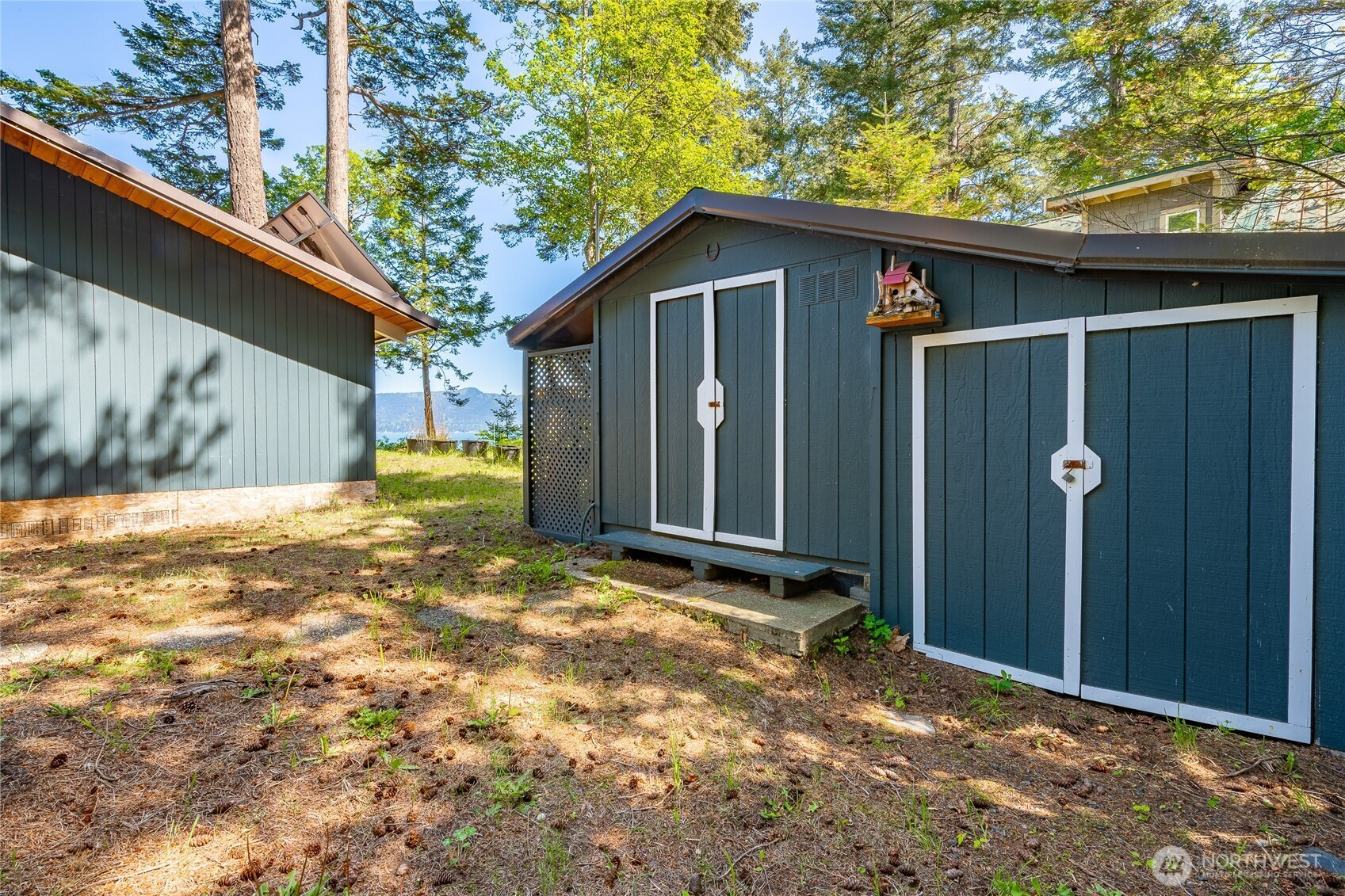 High bank waterfront cabin on private Eliza Island, just off the coast of Bellingham in Whatcom County. This 2-bedroom retreat captures sweeping eastern views of Bellingham Bay, the Canadian mountain range, and Chuckanut, with stunning sunrise exposure that fills the home with natural light. The cabin features natural wood interior paneling and vaulted ceilings that create a warm, open feel. A propane stove adds comfort year-round, while the propane paired with a solar and battery-powered inverter supports easy off-grid living. An additional unfinished outbuilding offers flexibility to make it your own—ideal for a bunkhouse, storage, an office, or a creative space. There is no direct beach access from the lot, but nearby access points are just a short walk or golf cart ride away, making it easy to enjoy. This property is well-suited for shared ownership—consider partnering with friends, or colleagues to create a private island retreat and maximize use throughout the year. While short-term rentals are not allowed on Eliza Island, co-ownership provides a smart and enjoyable way to experience island living. Island amenities include a full-time caretaker, tideland rights, beach access points, park areas, and a private airstrip (WA93), making it a great option for aviation enthusiasts or those seeking a true Pacific Northwest island escape. Located approximately 20 minutes from Bellingham by boat, with walk-on water taxi access available. No rentals allowed.