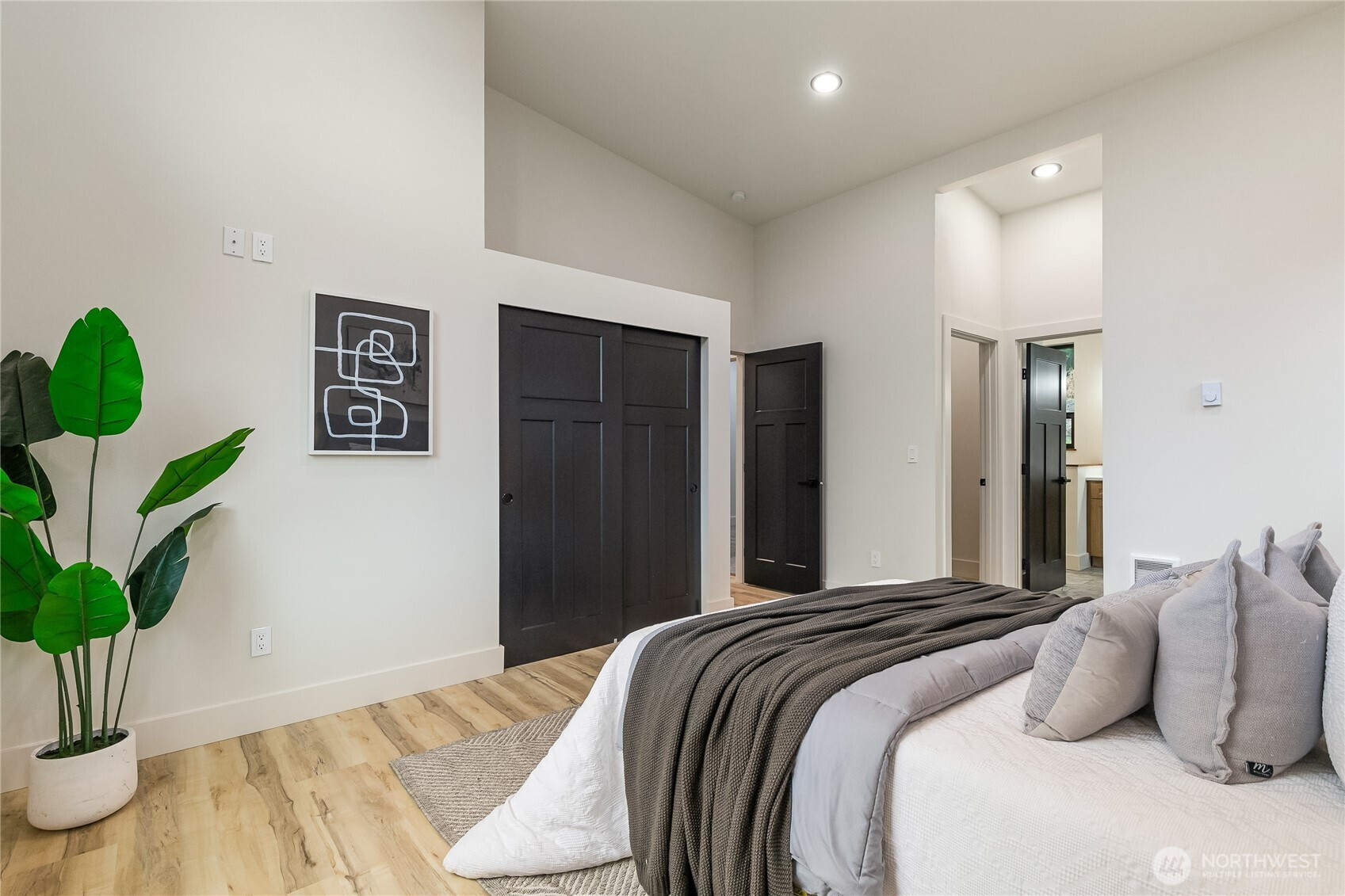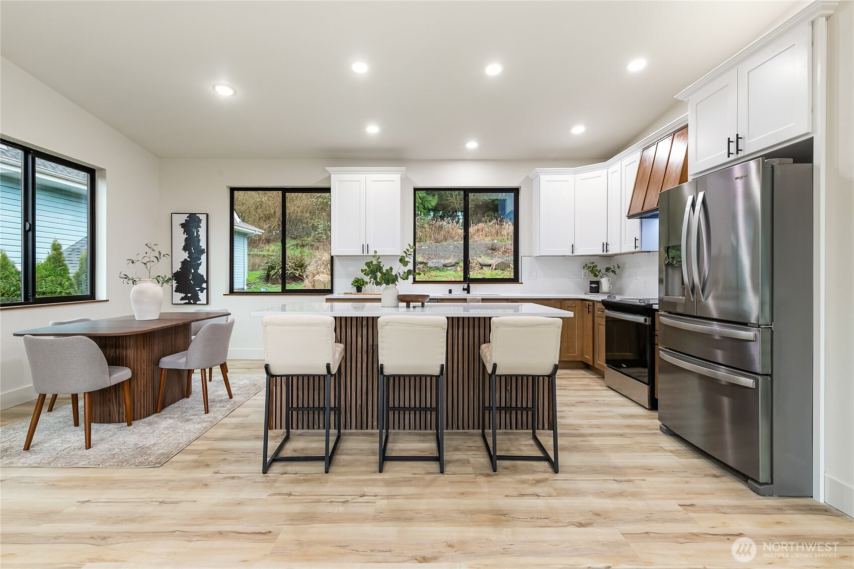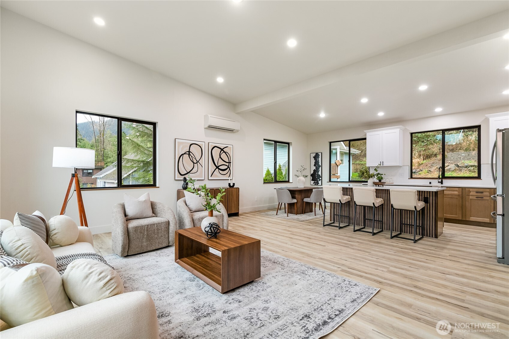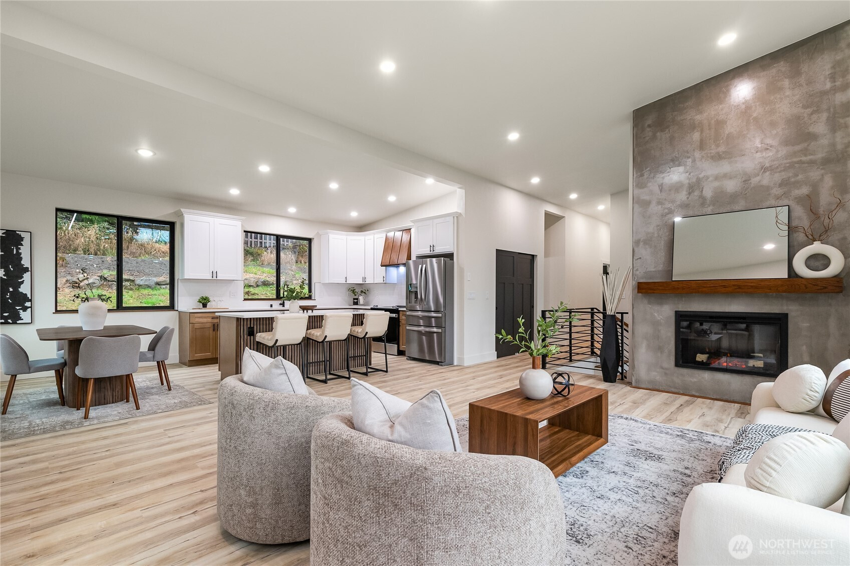 Welcome to this stunning new construction home in the desirable Glenhaven Community. Offering 2,433 square feet of thoughtfully designed living space, this 3-bedroom, 3-bathroom home showcases clean lines, high-end finishes, and an abundance of natural light throughout. Tall ceilings and a bright, open layout enhanced by sleek LED lighting. The spacious living room serves as the heart of the home, featuring an inviting electric fireplace and partial views of Reed Lake—perfect for relaxing or entertaining. The well-appointed kitchen is designed to impress, complete with a large island with seating, ample cabinetry, and a seamless flow into the dining area. Whether hosting gatherings or enjoying a quiet night in, this space offers both style and practicality. The primary suite is a true retreat, featuring two closets and a beautifully designed en-suite bathroom with dual vanities and a walk-in shower. Each additional bedroom is generously sized, providing flexibility for guests, a home office, or hobbies. Comfort is ensured year-round with energy-efficient ductless mini-split systems on each level, providing both heating and air conditioning. Outside, the home’s striking curb appeal is highlighted by a durable metal roof, modern black vinyl windows, and an oversized 700 square foot two-car garage offering plenty of storage and workspace. This home combines contemporary living with a peaceful setting!