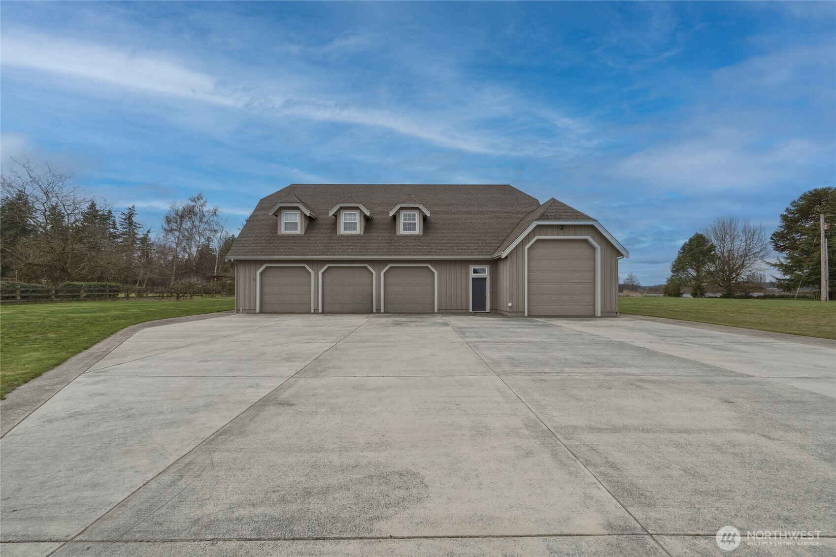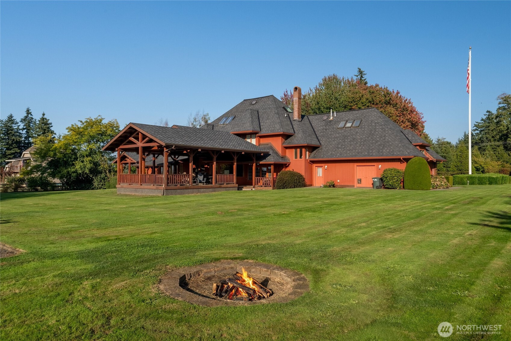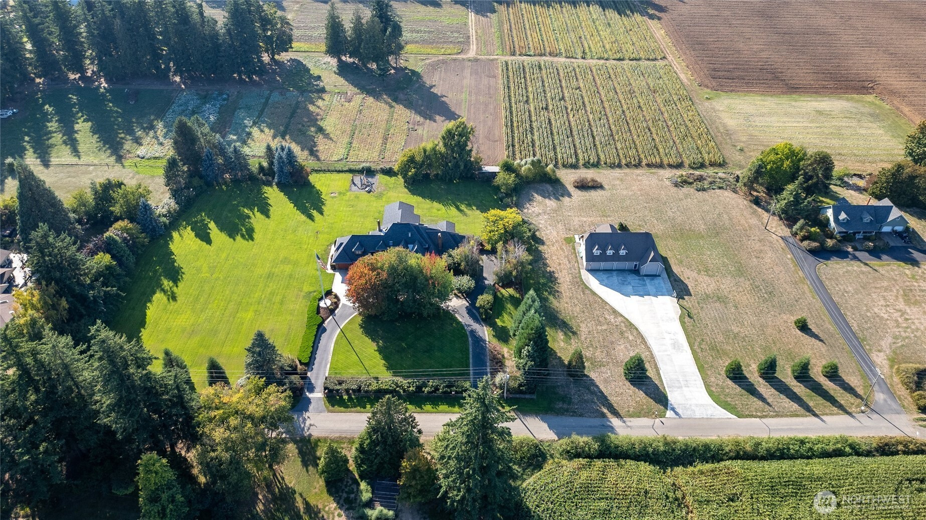 Welcome to your private Pacific Northwest retreat-nearly 5 acres at the end of a quiet dead-end road, where privacy and craftsmanship unite. A gated entry opens to an expansive paver driveway with circular approach, framed by mature trees and landscaping, leading to a covered arched portico. Inside, a dramatic 24-foot two-story foyer and sweeping curved staircase make a stunning first impression. Main level offers a formal living room with arched window and gas fireplace, formal dining provides the perfect setting for memorable gatherings, and a well-appointed kitchen with stainless appliances, granite counters, walk-in pantry, built-in desk, bar seating, and breakfast nook flowing into the great room with French doors and wood-burning fireplace. The large primary suite on the main offers a tray ceiling, French doors to the covered deck, and a spacious walk-in closet. Also downstairs are a dedicated den/office and a dreamy laundry room. Upstairs are four bedrooms with Jack-and-Jill baths, three featuring walk-in closets and charming window seating. An expansive rec room serves as the ultimate hangout destination, and a third-level flex space with storage adds versatility. Outdoor living shines with a covered timber-framed deck, vaulted wood ceiling, irrigated and fenced yard. A heated 3-car garage with half bath, basement garage, 4-bay shop with 44-foot RV bay and 3/4 bath, and a 1,000+ sq ft ADU with kitchen, bath, and covered balcony complete this exceptional gated estate.