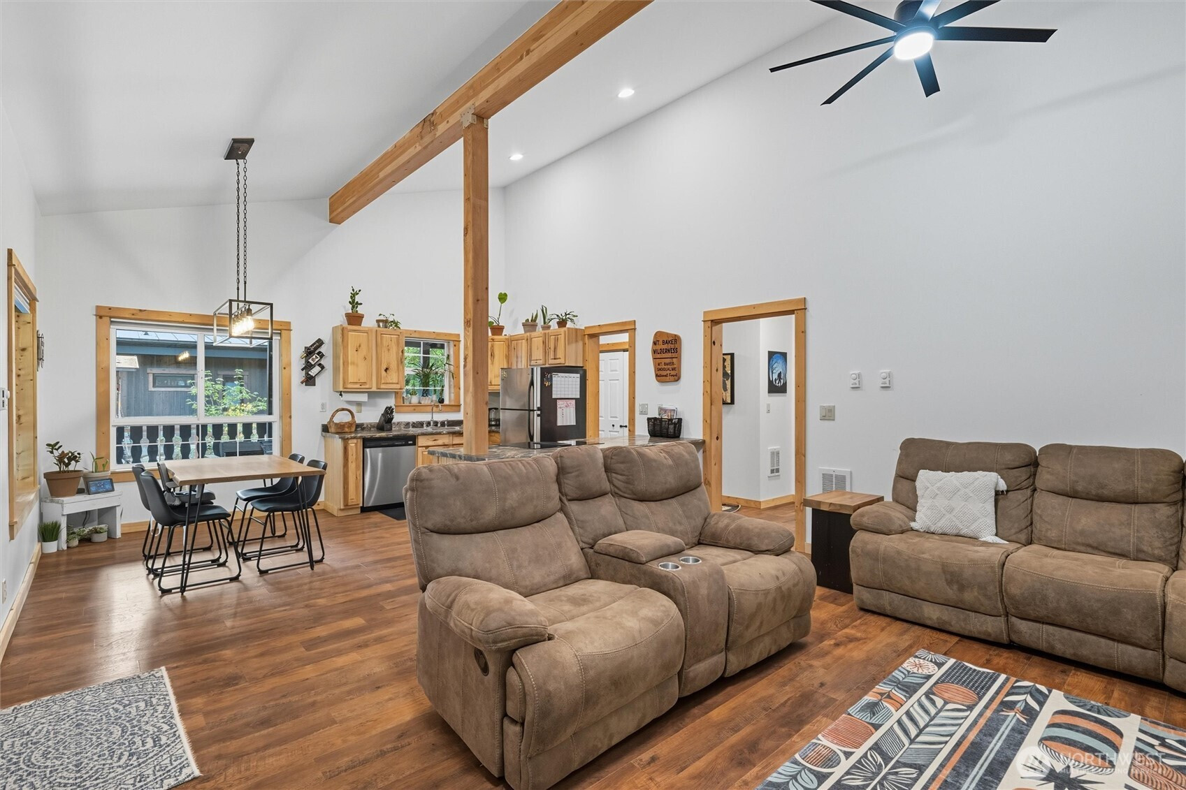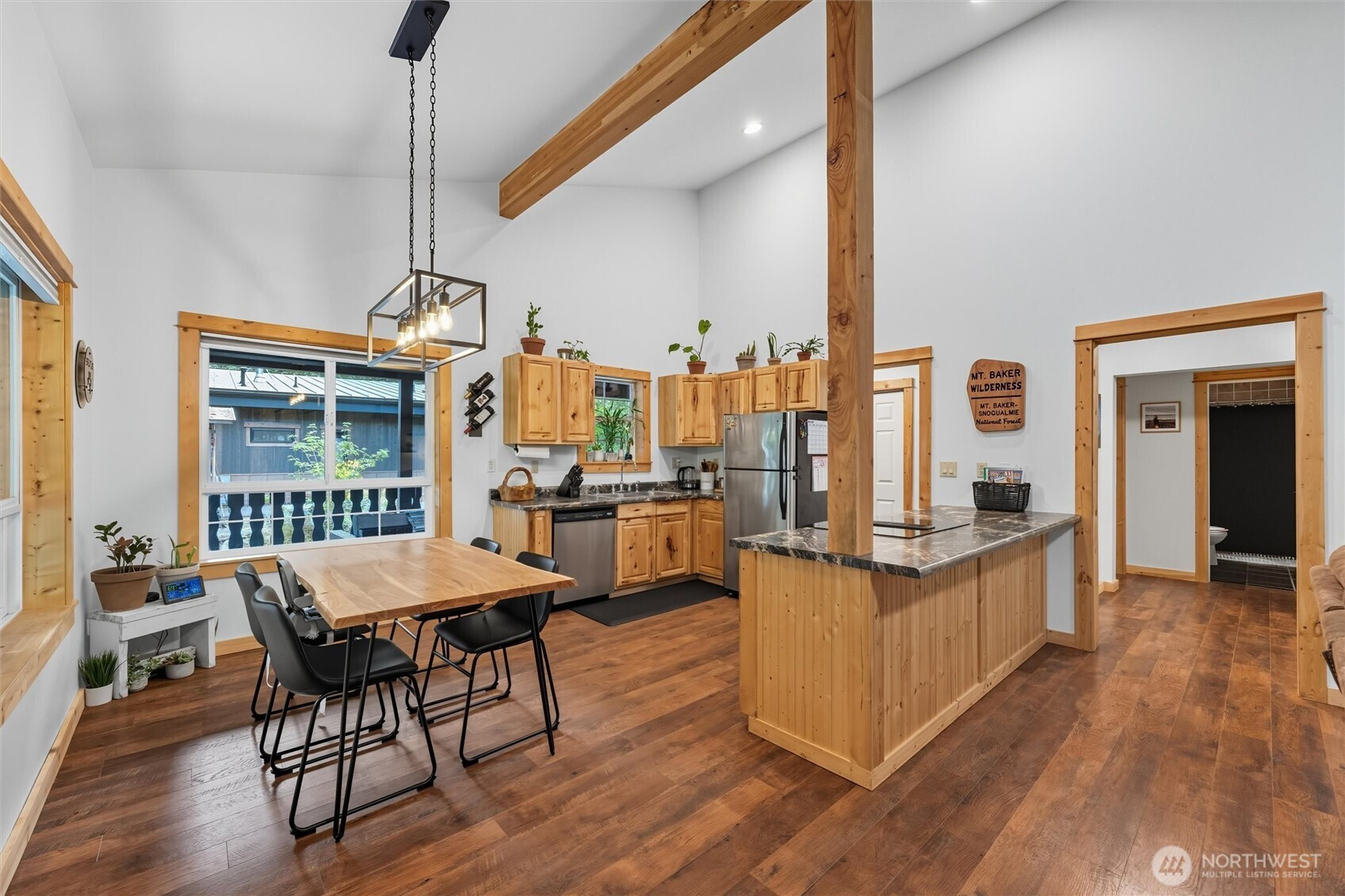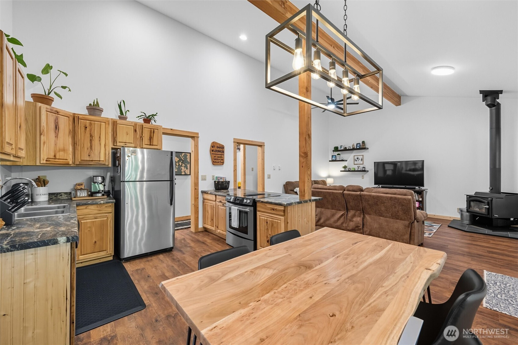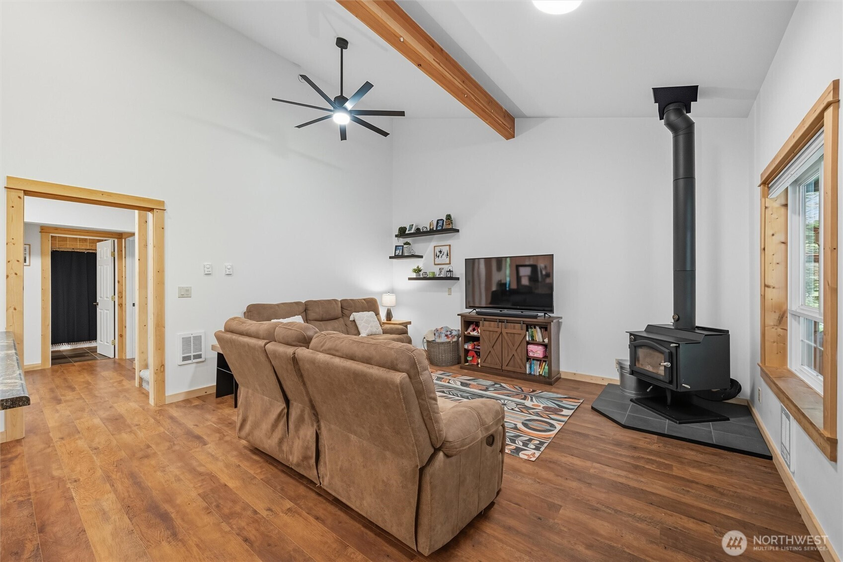 The mountains are calling! This beautifully updated Glacier Springs home is the perfect destination for year-round living, days on the slopes & easy outdoor recreation. Step inside this open-concept contemporary cabin with vaulted ceilings, wood beams & knotty pine finish work throughout. Thoughtfully designed with two large bedrooms & tiled full bathroom on the main floor. Upstairs loft space with 3/4 bath, oversized storage closet, & bonus space perfect for a home office, media room, or additional sleeping space. Spend winters cozied up by the 2022 Kuma, energy efficient wood stove & summers on the wrap around porch looking out over manicured grounds complete with a fenced yard & fire pit area. With a newer roof & a whole house UV water filtration system, look no further!