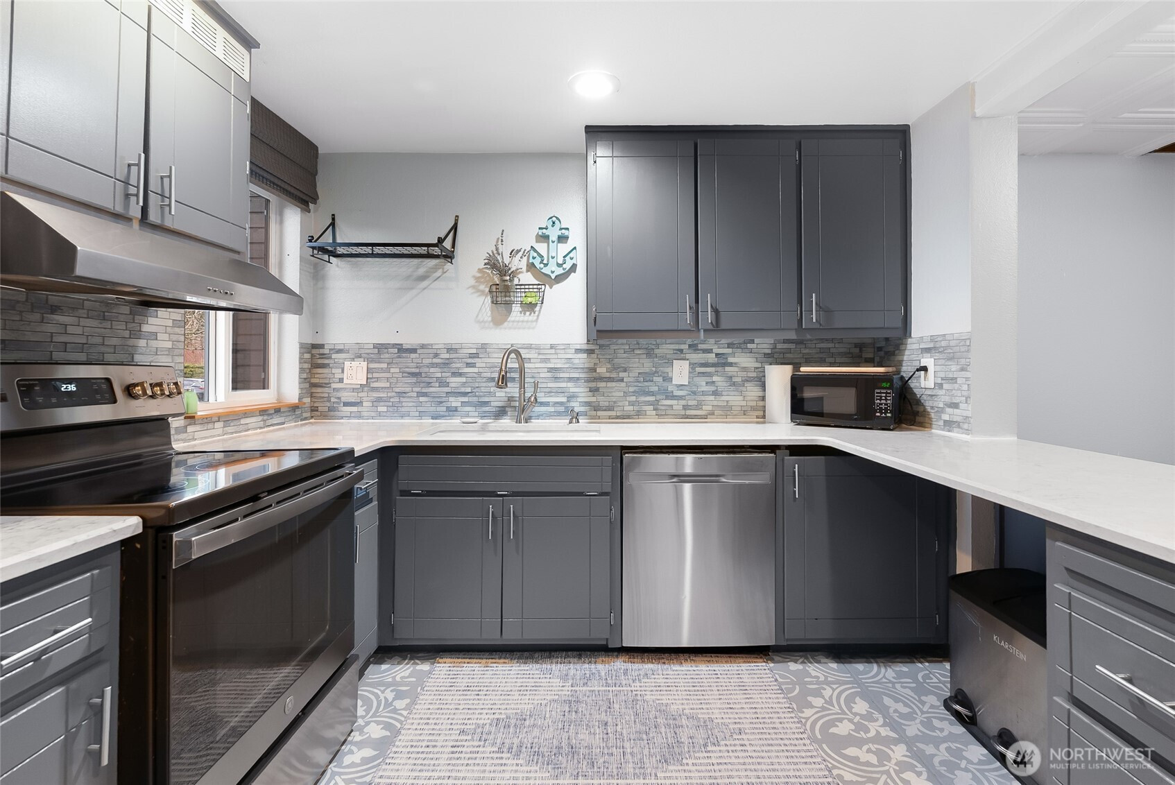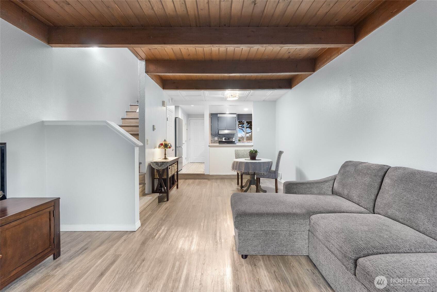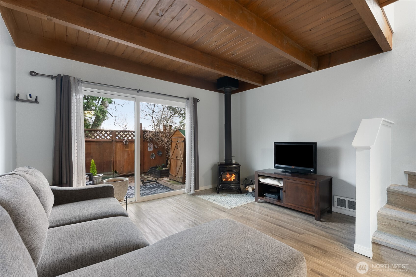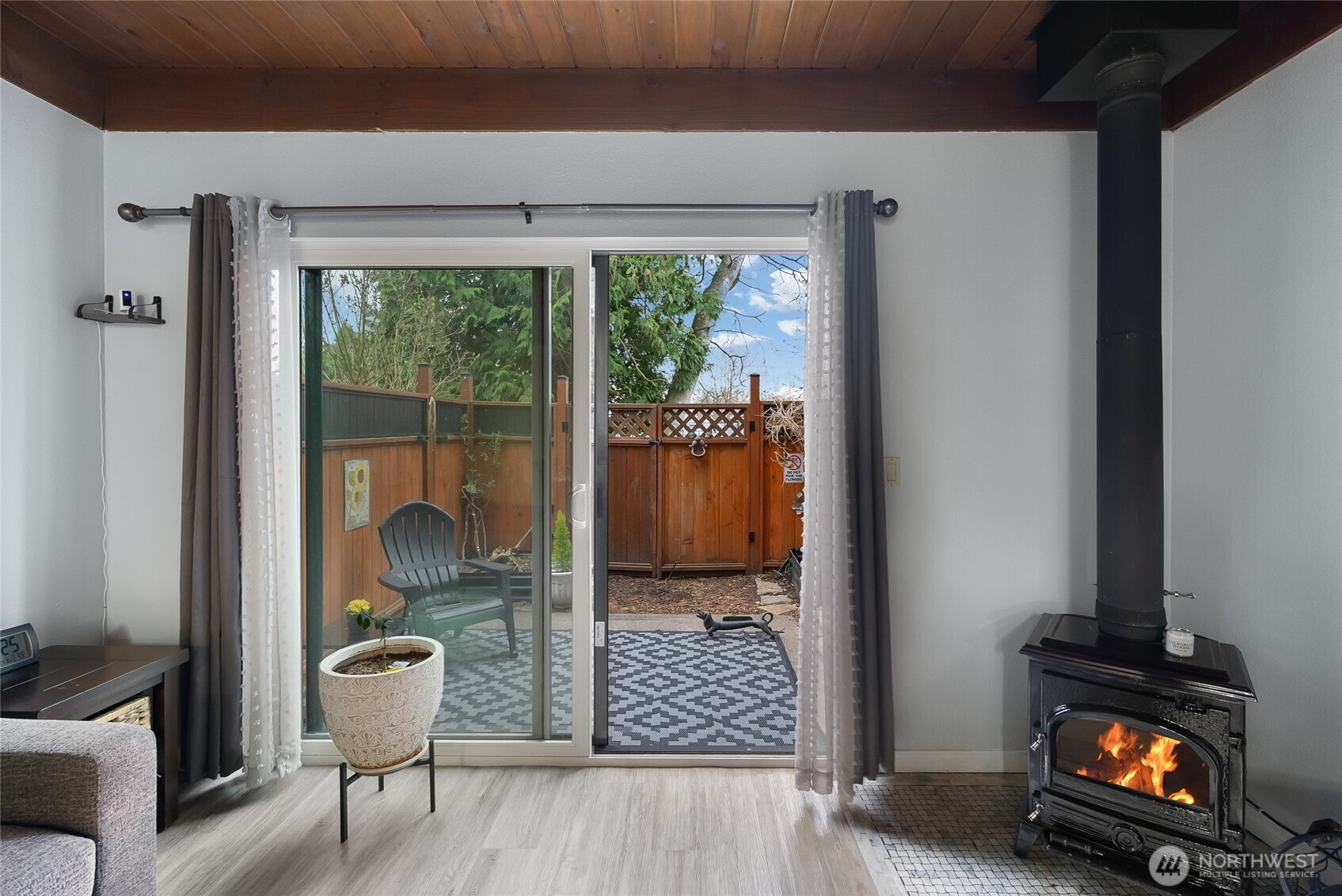 Enjoy living across the street from Birch Bay! This end unit townhome is the perfect home away from home. Enter into the bright, spacious kitchen with quartz counters, newer appliances and plenty of storage. The living room features a cozy wood burning stove and a slider leading to the rare fully fenced, private patio. Upstairs you will find two spacious bedroom, remodeled bathroom and washer/dryer. The Bay Rim community features a heated pool, reserved parking right by the unit. Private beach has chairs, picnic tables, a fire pit and everything you need to enjoy Birch Bay. Minutes from restaurants, Birch Bay State Park, and the C shop, this is the affordable vacation home or full time beach residence you've been waiting for.