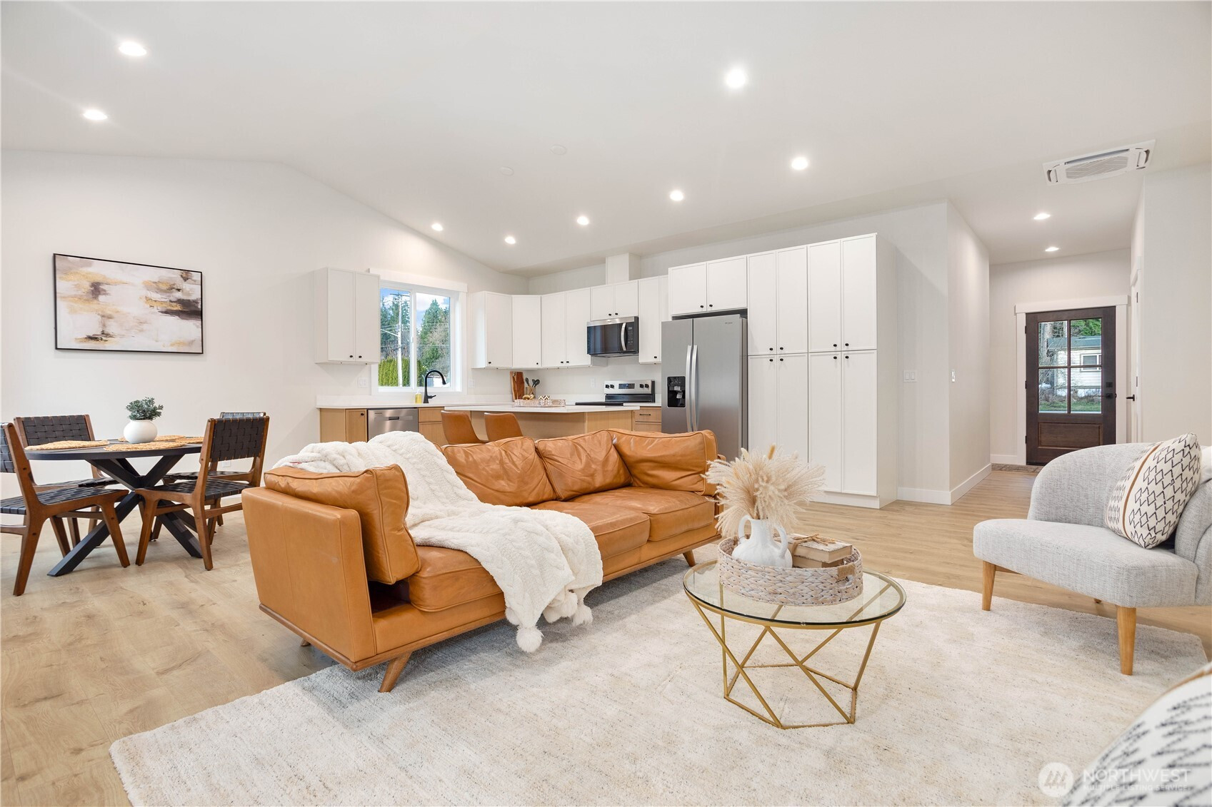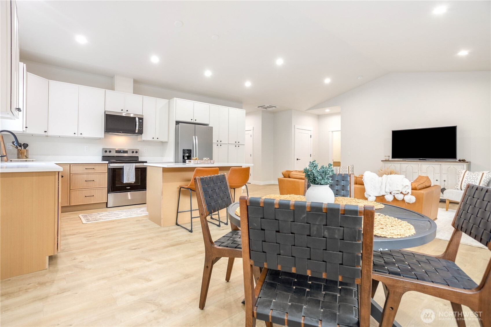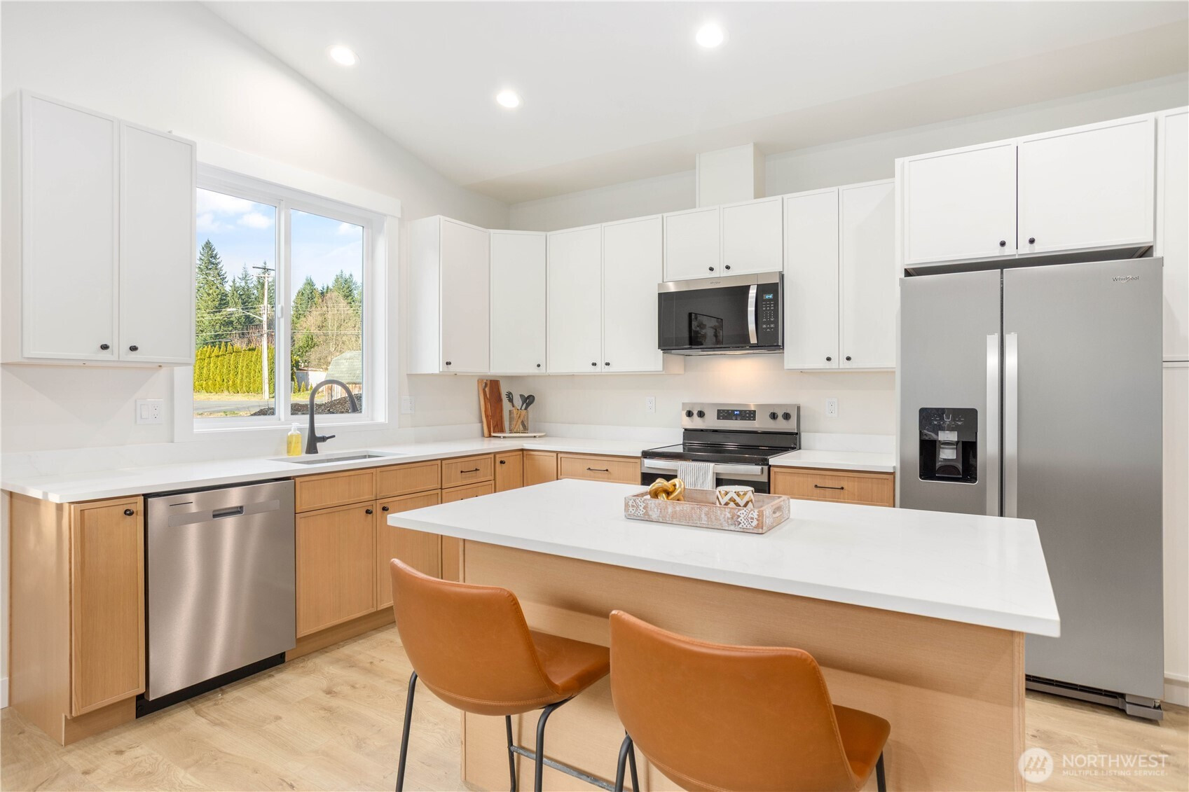Some homes just make daily life easier — this is one of them. Designed for effortless one-level living, this thoughtfully crafted home features an open layout with vaulted ceilings that create a bright, expansive feel. The kitchen stands out with custom cabinetry, quartz countertops, stainless steel appliances, and durable flooring that blends style with everyday function.The spacious primary suite offers comfort that isn't crammed, while two additional bedrooms provide flexibility for guests, work-from-home space, or hobbies. Step outside to the back patio and enjoy a low-maintenance outdoor area ready for relaxing or entertaining. Thanks to upgraded 200+ sq ft of attic storage, the insulated garage can truly function as a full two-car garage, workspace, etc!