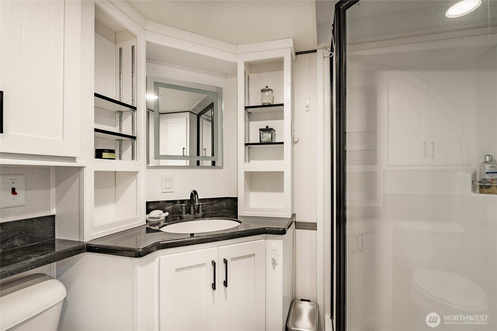 Birch Bay Waterfront Location! This turn-key home has everything! 2021 model with a light bright interior, kitchen island with room for dining, oversized farm sink and tons of storage. Living room takes advantage of the panoramic views with vaulted ceilings with surround windows, a fireplace and mounted Tv for the cozy nights. Bathroom has a step in shower for easy use, main bed has enough room on each side for access and the loft area can provide 2 extra sleeping options or flex space. Enjoy the full length deck with proper skirting around the unit and enough space for a compact car to park on the back end. Hands down the newest & best location in the park. Imagine unobstructed views year round from this little oasis!