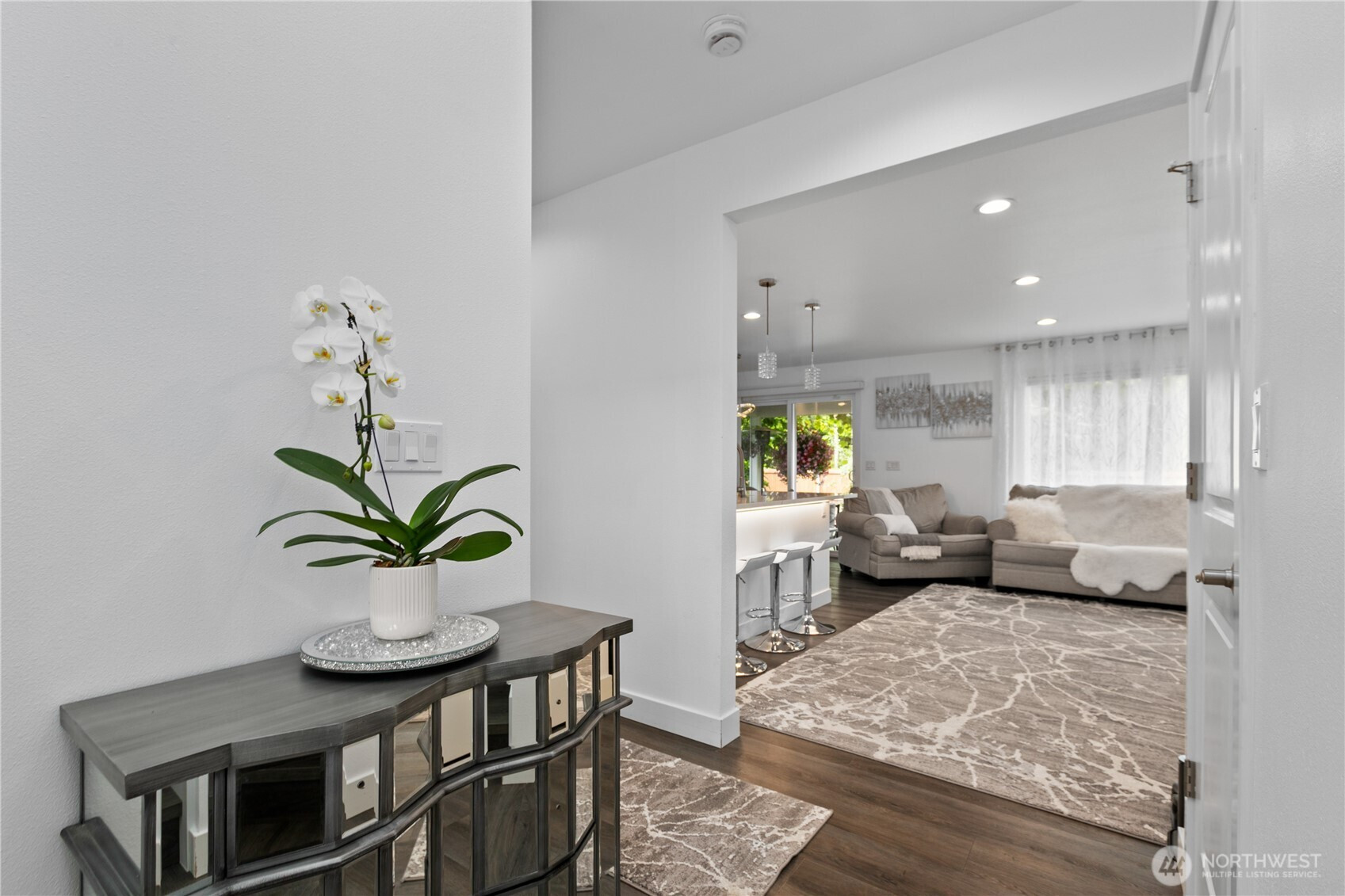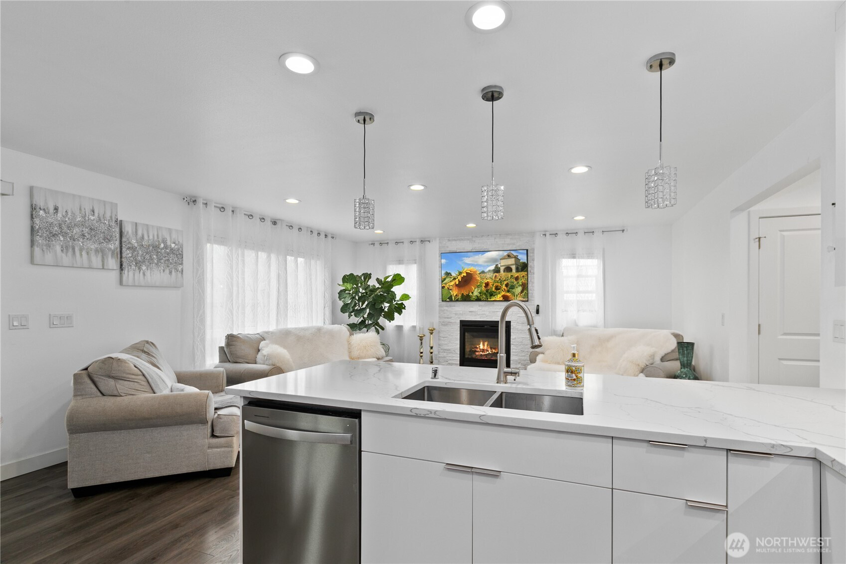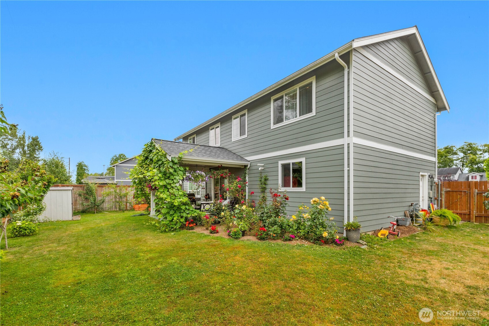 Discover the charm of this well-cared-for 4-bedroom, 2.5-bathroom residence offering close to 2,000 square feet of comfortable living space. Designed with both functionality and style in mind, the home features an inviting open-concept layout that effortlessly blends the living, dining, and kitchen areas—perfect for hosting guests or enjoying daily life. The kitchen stands out with elegant marble countertops, stainless steel appliances, and plenty of space to gather, while a warm gas fireplace creates a cozy focal point in the living room. Modern touches and a tankless hot water system provide added comfort and efficiency throughout the home. Step outside to a peaceful backyard retreat complete with a covered patio, colorful garden beds, and mature fruit trees. With the added convenience of an attached garage, this move-in-ready home offers a perfect balance of comfort, beauty, and practicality.