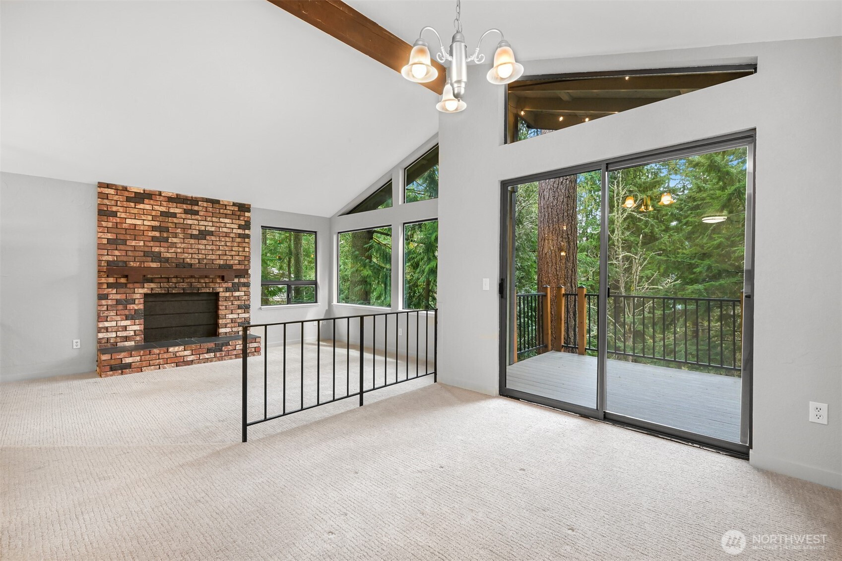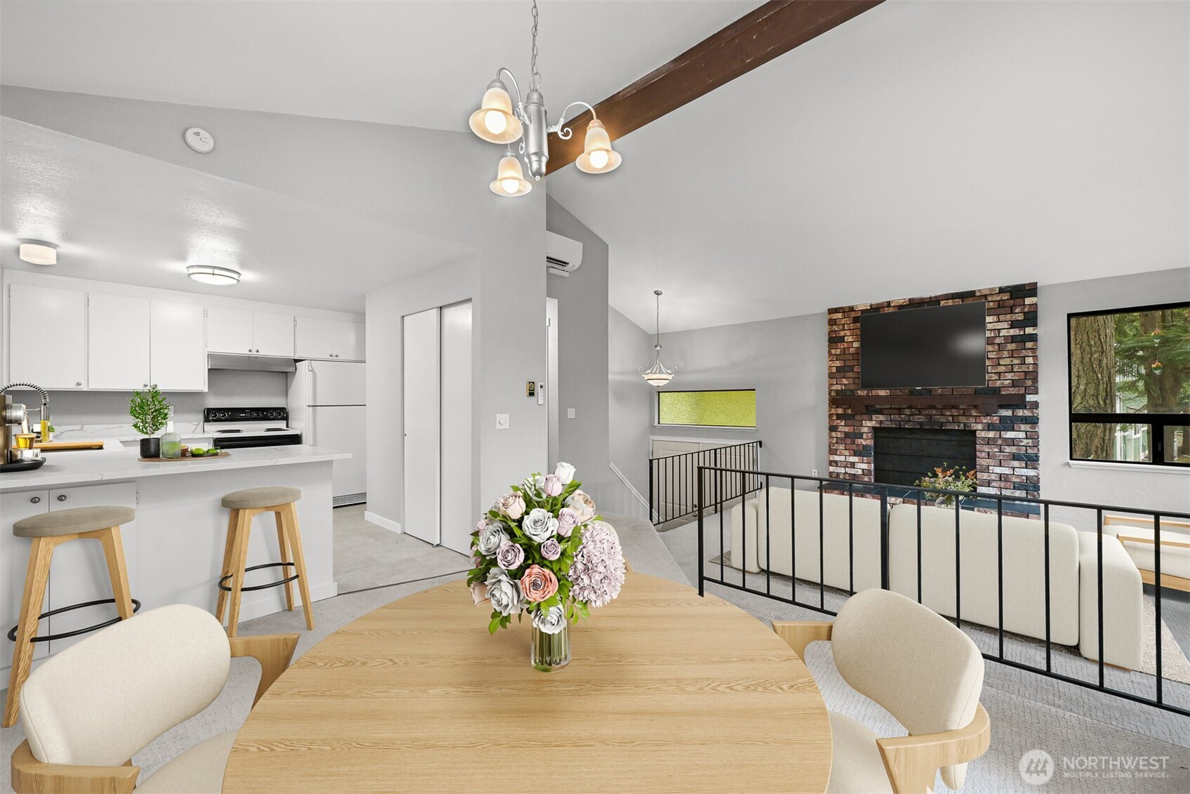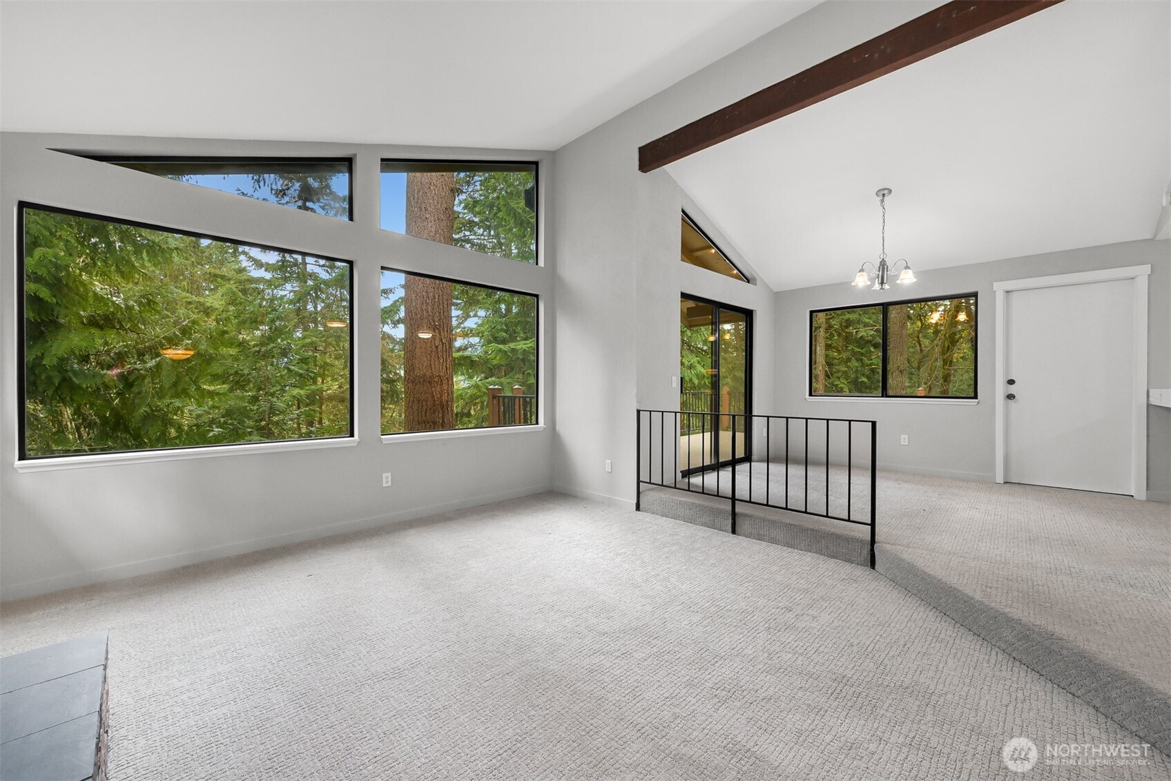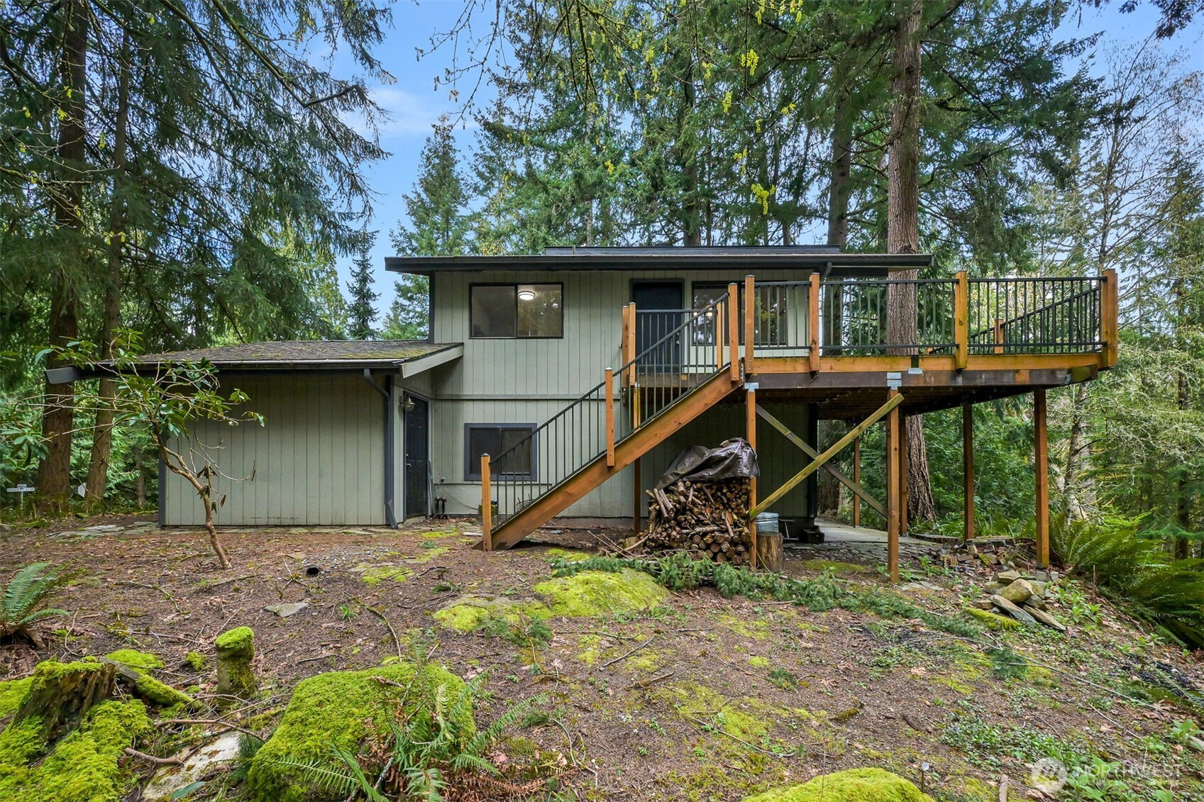 Nestled among the trees, this home offers a true sense of privacy and tranquility on a large triple lot. Spacious open-concept layout connects the living, dining, & kitchen creating a true entertainer’s dream. Soaring vaulted ceilings with exposed wood beams create a warm, inviting space, while windows on every side frame peaceful forest views. Double doors welcome you into your own private retreat, where indoor/outdoor living shines with a spacious, updated deck just off the dining room. New electric hot water heater and new mini split system on both levels installed in 2025, fresh carpet, attached garage, 3 bedrooms & 2.5 baths, this home truly has it all.