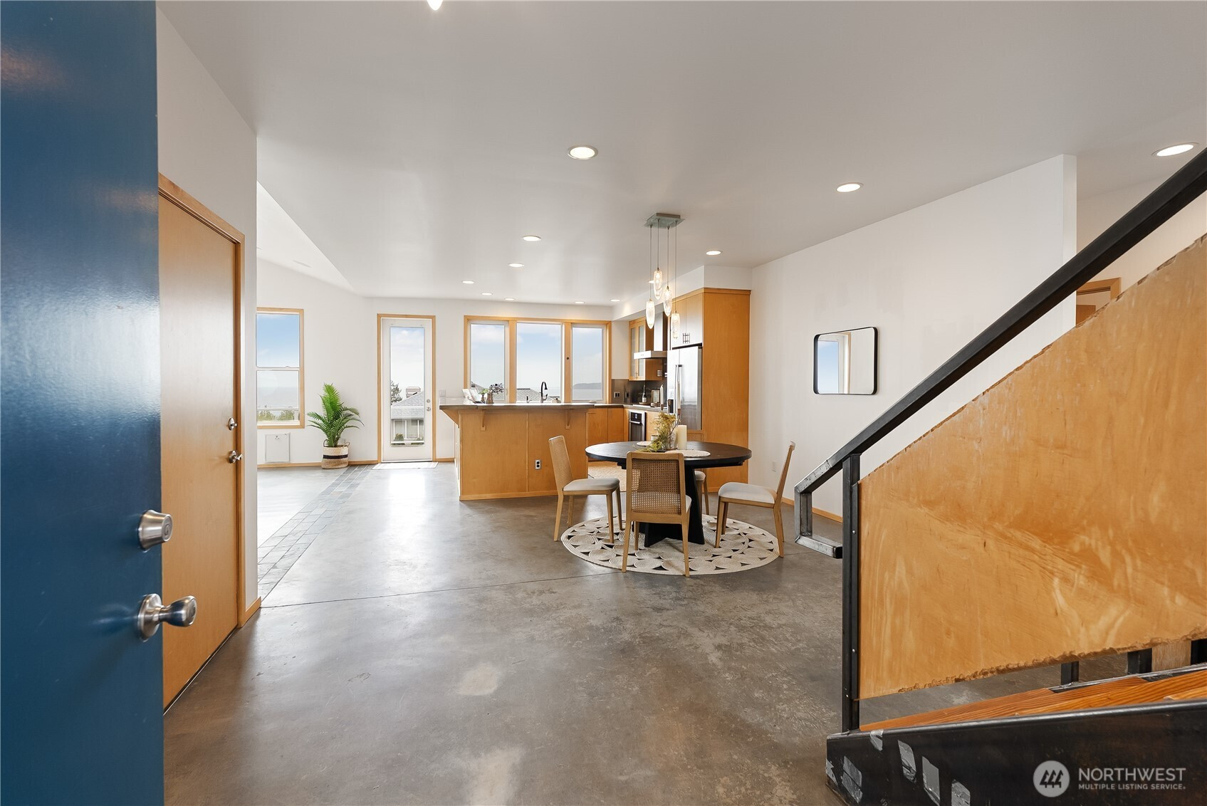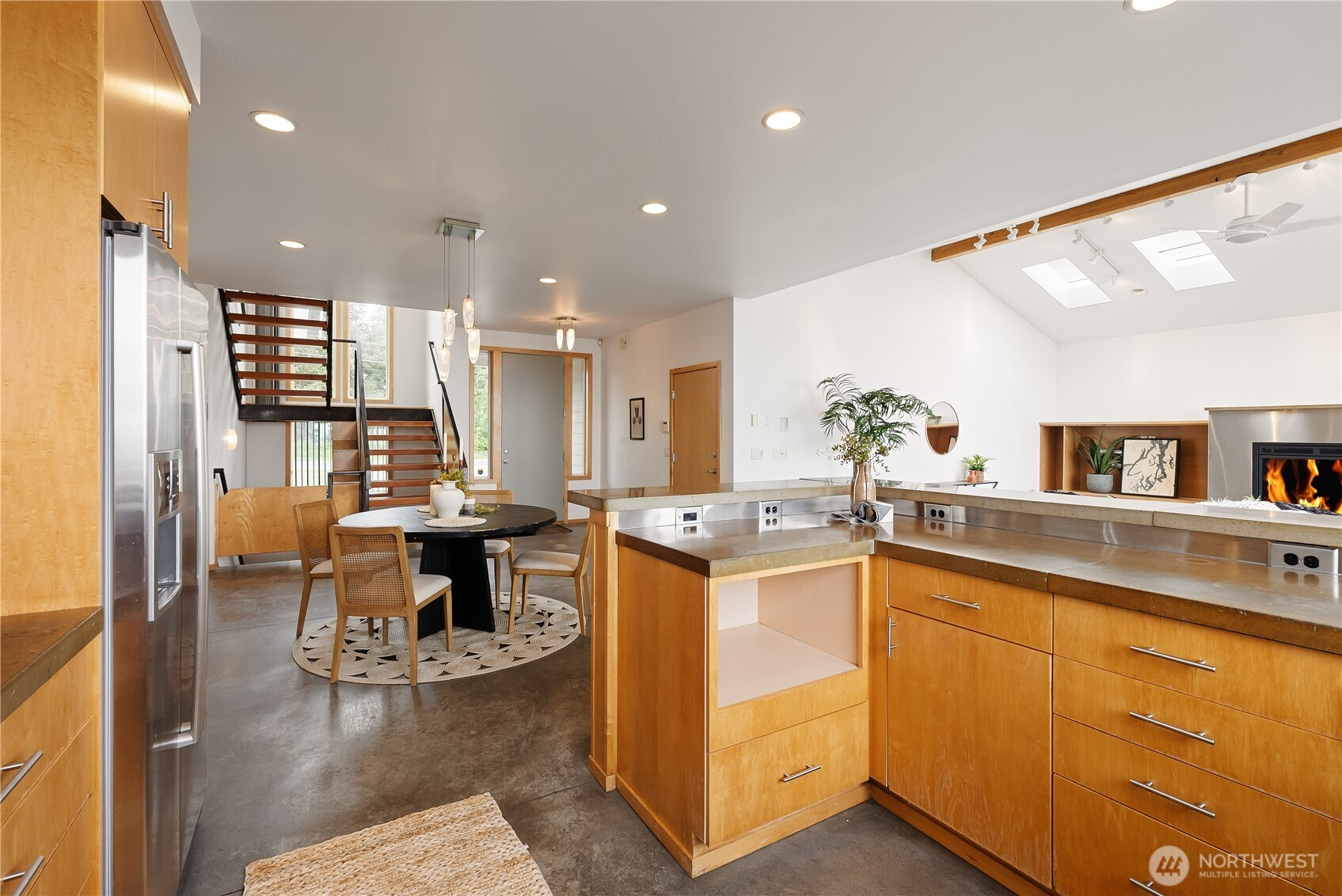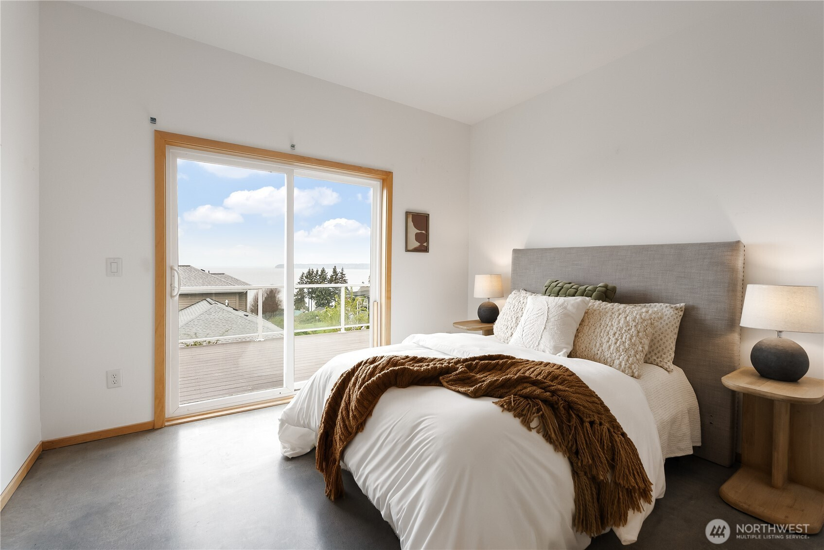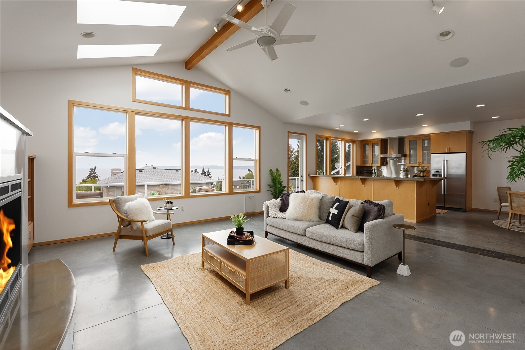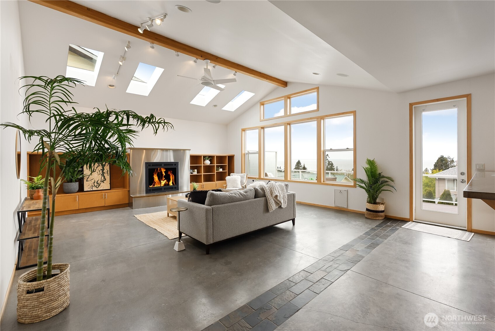 From the street, you wouldn’t expect what opens up inside. This two-story home with basement takes full advantage of its position with sweeping views of Semiahmoo Bay. The main level centers around a vaulted living area with a fireplace, large windows, and skylights that bring in natural light throughout the day, along with direct access to the wraparound deck, making it easy to take in the view from inside or out. Concrete floors and counters give the space a modern feel and a look that stands apart from more traditional homes, while radiant floor heating provides steady, comfortable warmth throughout. Upstairs, the primary suite is set up to capture even more of the view, with its own private deck, walk-in closet, and a five-piece bath with a soaking tub positioned to enjoy it. The basement includes a mix of finished and unfinished space, with the finished area working well for a rec room, game room, or home office. The home offers a great opportunity to bring your own updates and make it your own in a setting where the views do most of the work.