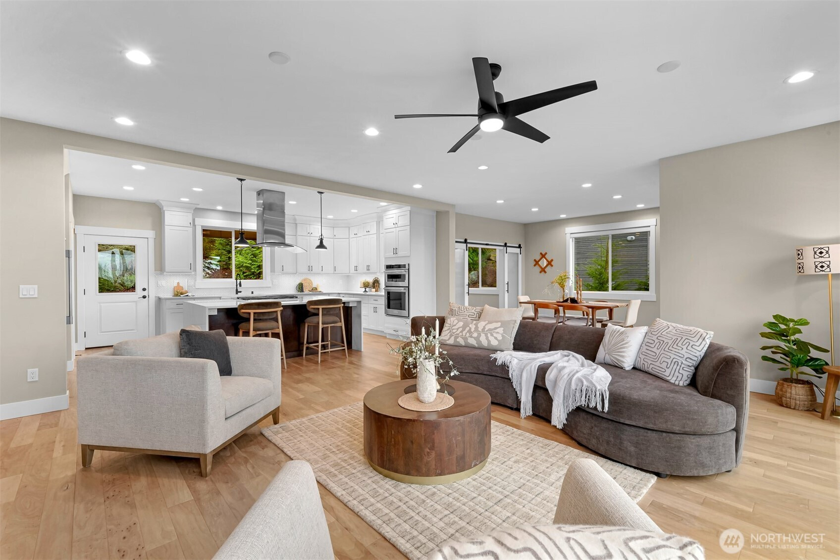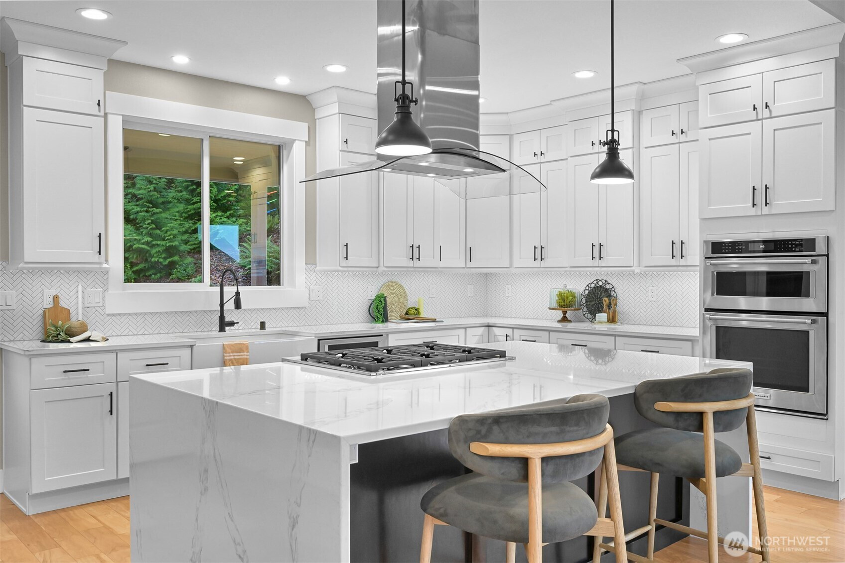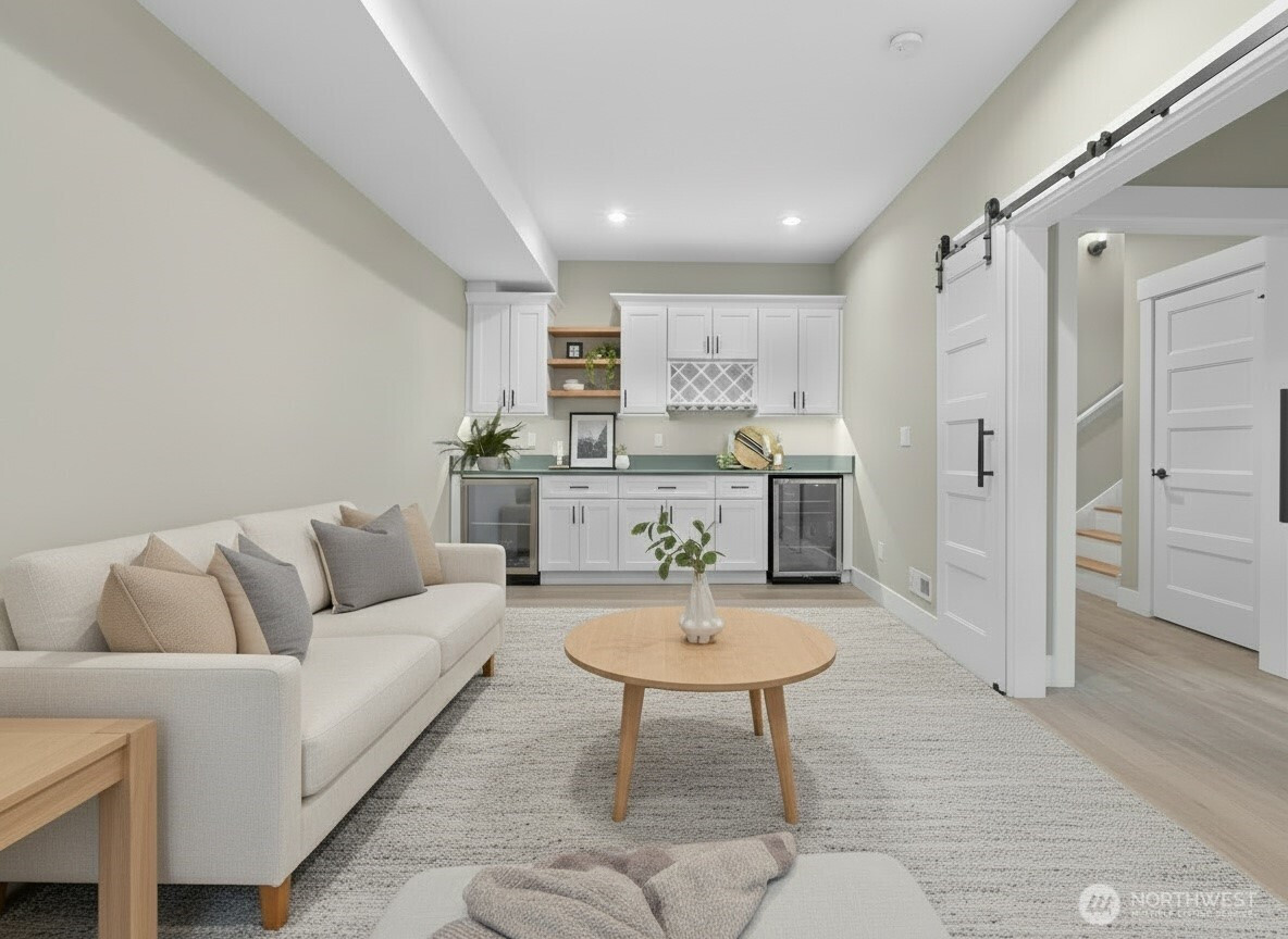 Step into this contemporary masterpiece in Bellingham's coveted South Side. The open-concept design boasts soaring 12-foot ceilings, a chef’s kitchen with a stunning 7-foot quartz waterfall island, commercial-grade appliances, and a spacious walk-in pantry. A covered deck off the kitchen overlooks a private backyard with BBQ hookups and stairs—ideal for year-round entertaining.The main floor features a tranquil primary suite with a spa-like ensuite and walk-in closet, a cozy living room with a gas fireplace, a dedicated office, and a convenient laundry room. Upstairs, you’ll find two spacious bedrooms—one with serene bay views—and a guest bath with quartz countertops and a tiled shower/tub. The lower level offers versatility with a bedroom, full bath, kitchenette, and an impressive media room.The 1,129-square-foot, extra-deep 3-car garage is a dream, complete with clear garage door panels for abundant natural light—perfect for storage or hobbies. Beyond the home, adventure awaits with Samish Trail access right outside, plus Galbraith Mountain, Lake Padden, and top-notch shopping and dining just minutes away. This property blends luxury, functionality, and an unbeatable location—truly a rare find!