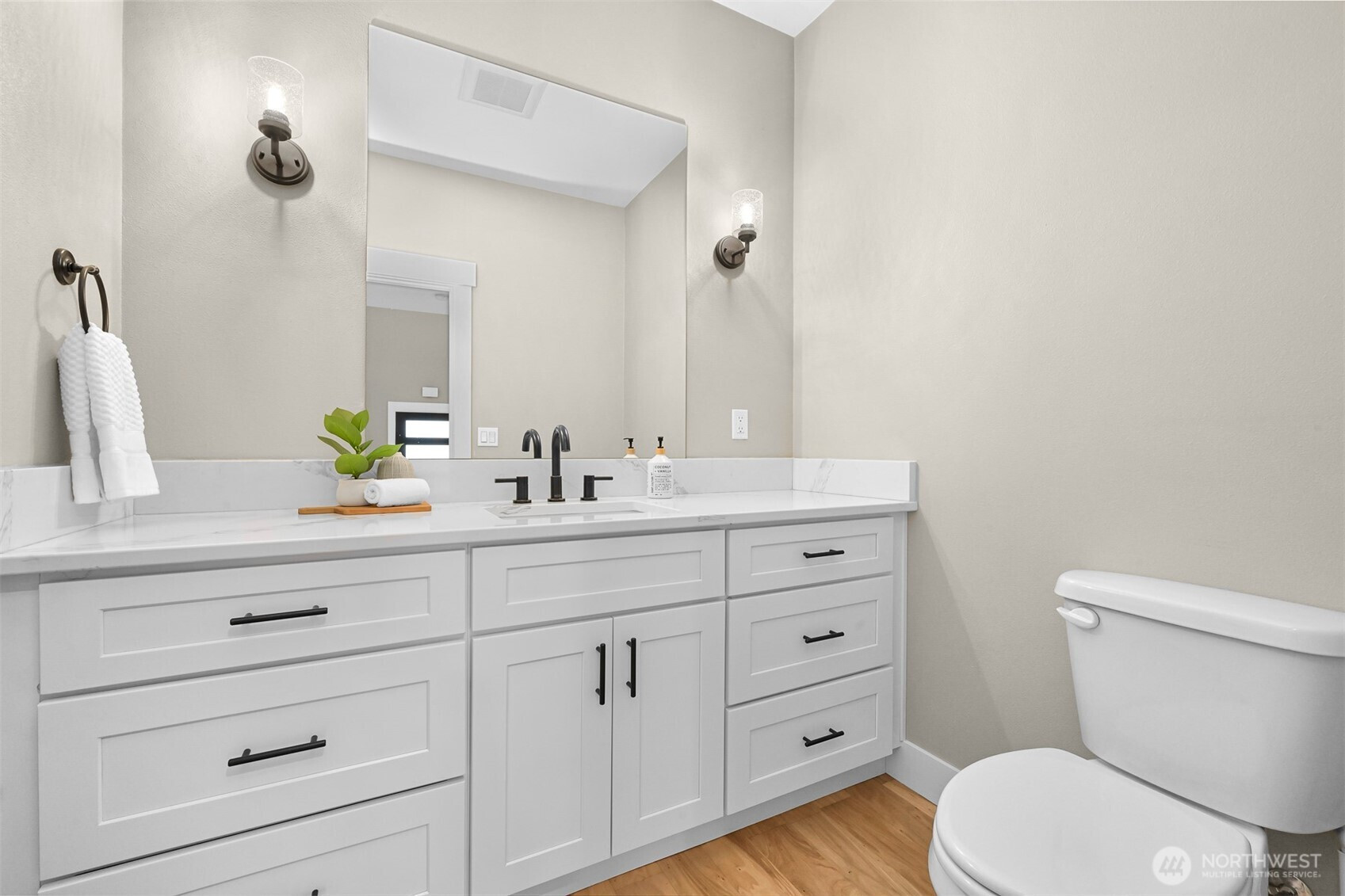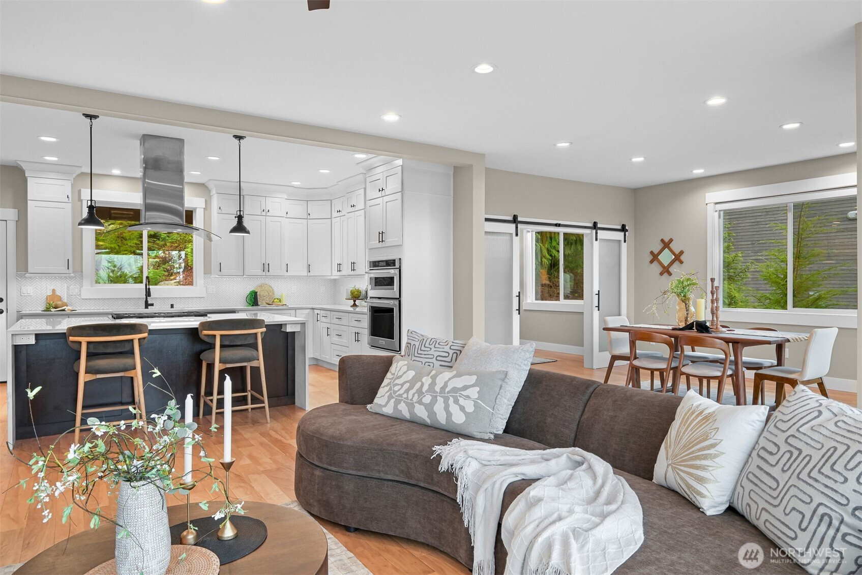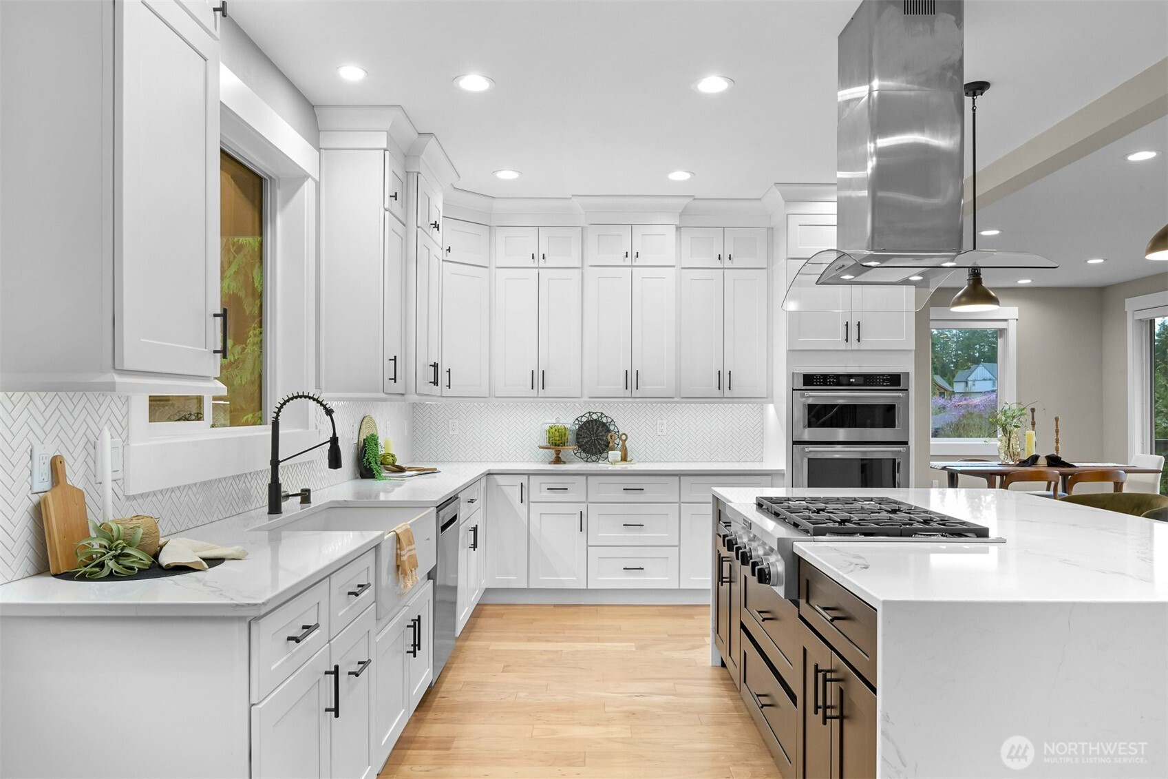 Step into this contemporary masterpiece in Bellingham's coveted South Side. The open-concept design boasts soaring 12-foot ceilings, a chef’s kitchen with a stunning 7-foot quartz waterfall island, commercial-grade appliances, and a spacious walk-in pantry. A covered deck off the kitchen overlooks a private backyard with BBQ hookups and stairs—ideal for year-round entertaining.The main floor features a tranquil primary suite with a spa-like ensuite and walk-in closet, a cozy living room with a gas fireplace, a dedicated office, and a convenient laundry room. Upstairs, you’ll find two spacious bedrooms—one with serene bay views—and a guest bath with quartz countertops and a tiled shower/tub. The lower level offers versatility with a bedroom, full bath, kitchenette, and an impressive media room.The 1,129-square-foot, extra-deep 3-car garage is a dream, complete with clear garage door panels for abundant natural light—perfect for storage or hobbies. Beyond the home, adventure awaits with Samish Trail access right outside, plus Galbraith Mountain, Lake Padden, and top-notch shopping and dining just minutes away. This property blends luxury, functionality, and an unbeatable location—truly a rare find!