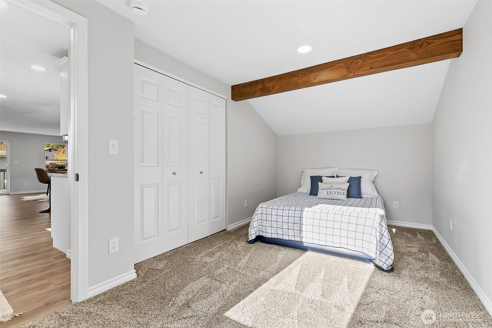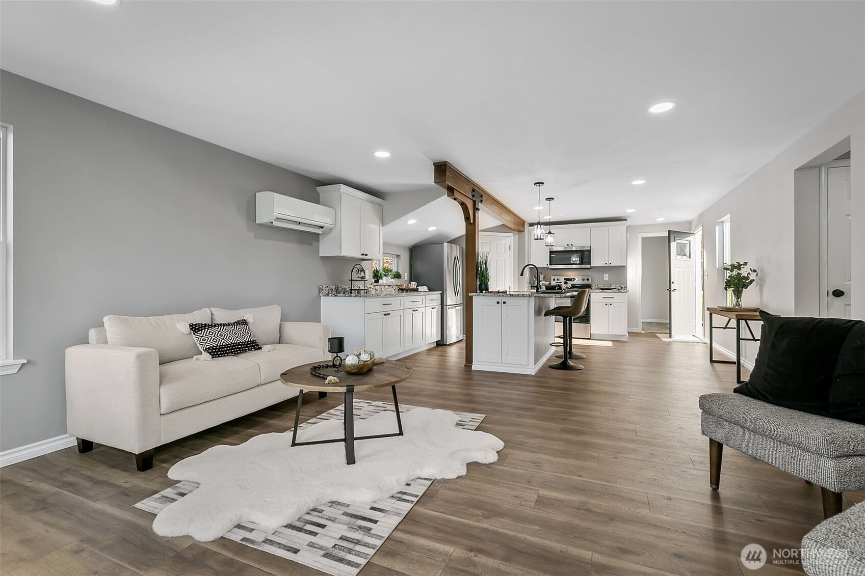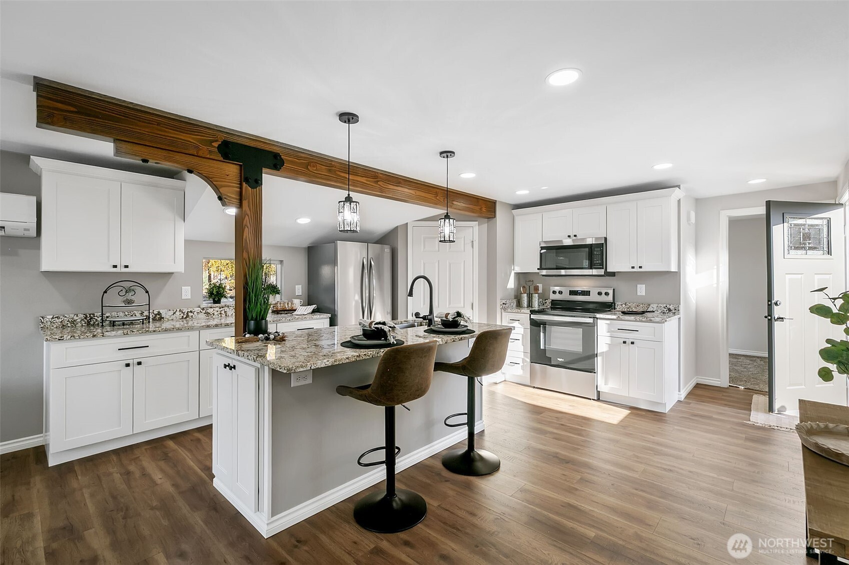 Rebuilt well beyond the surface, this 3-bed, 2-bath single-level home feels entirely new—intentional in every detail and exquisitely crafted. A hand-finished solid-wood accent beam anchors the living space with an artistic tone. The open kitchen offers white shaker cabinetry, granite countertops, stainless appliances, a walk-in pantry, and a shaker-wrapped island with smart storage. Hallway cabinetry adds convenience. Pergo Hickory LVP brings warm amber tones. The primary suite includes an en suite, two decks expand the living space, and R2 zoning for building another home!