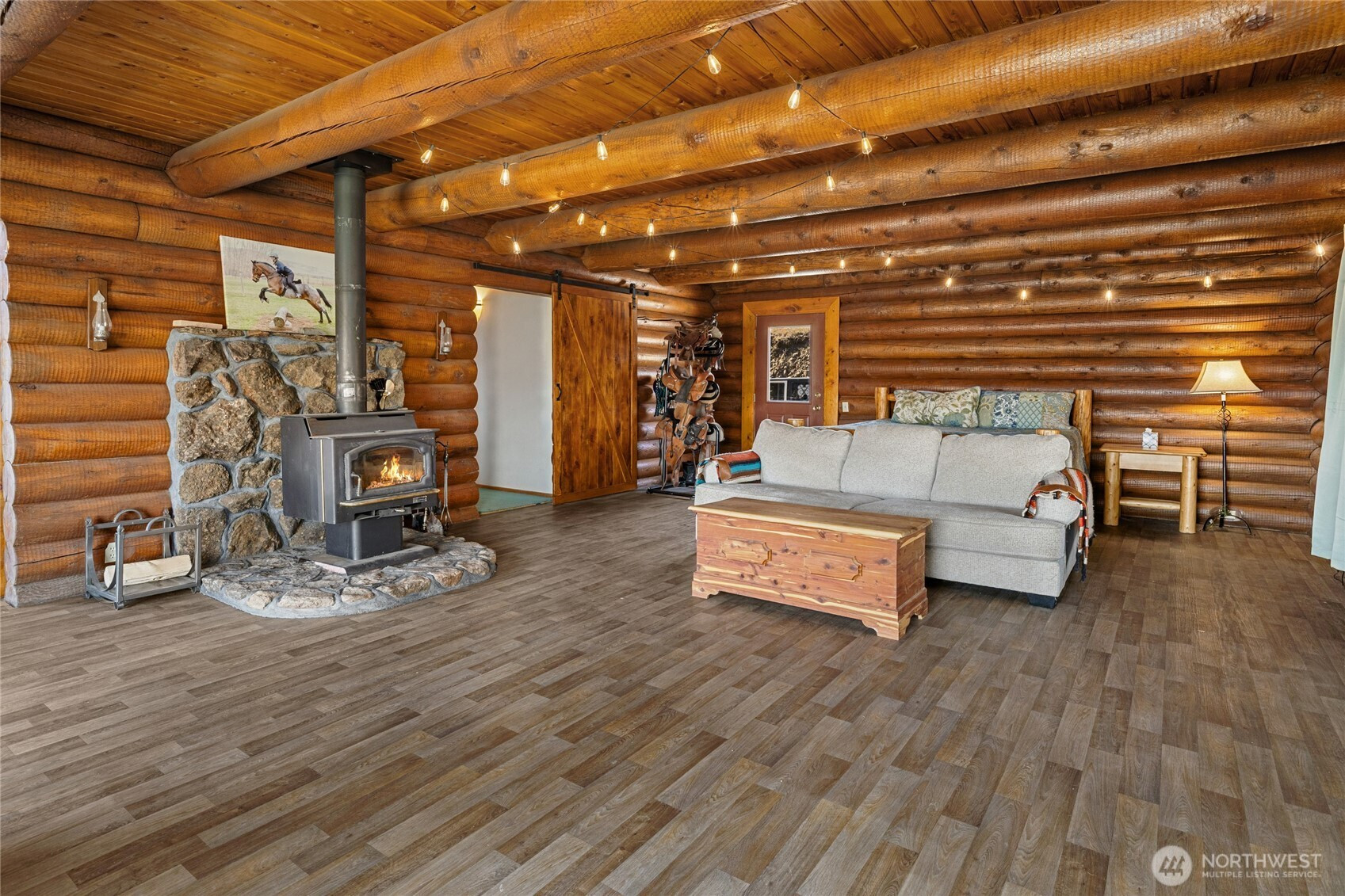 Incredible log home with sweeping views of rolling hills out of nearly every window. If you're looking for privacy and elbow room, you'll find it here, with more than 9 acres to play with. Soaring 25 ft ceilings, cozy fireplaces at every turn and a chef's dream kitchen. Two primary bedrooms and a large-sized guest room. Loft makes a perfect reading nook. Live off the grid in confidence with new solar panels and new generator and propane; well water with new pump. New metal roof. Starlink installed for high-speed internet. Tons of space for all your toys, RV parking, ATV's etc. Newly built horse stables and pen, plenty of space for a hobby farm, chickens and goats. Newly grated outdoor ice rink for winter fun. Don't miss this opportunity!