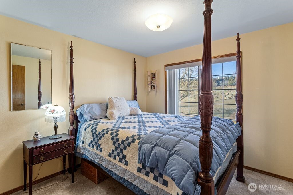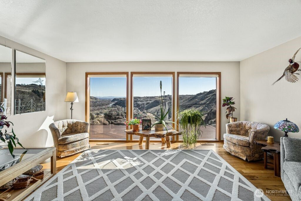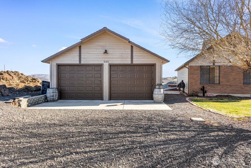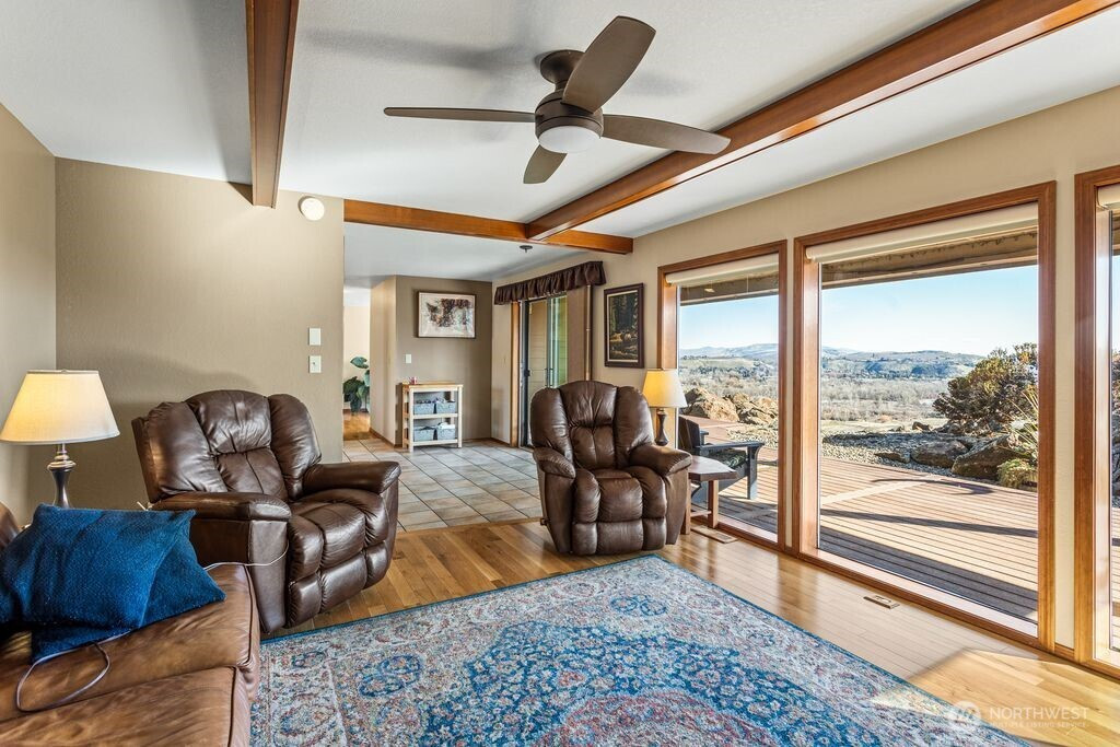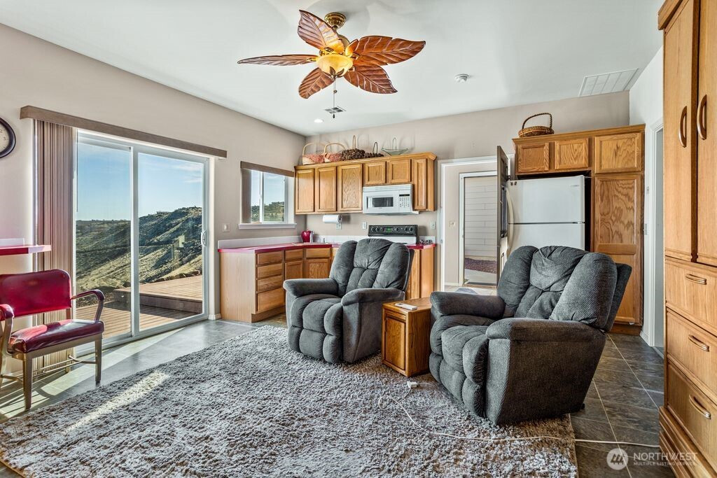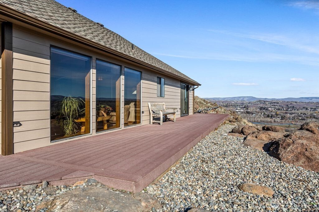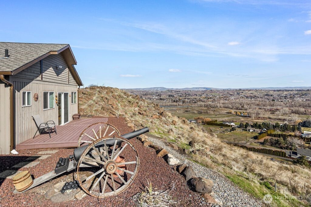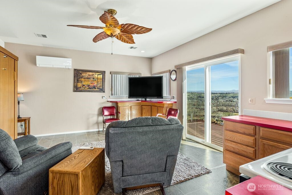 Experience one of the most breathtaking views in Yakima, where the scenery transforms with the seasons, offering a sense of peace and serenity. This home, situated at the end of a road with an unobstructed view, is ideal for those seeking a single-level residence with minimal yard maintenance. It boasts a stunning view of the Naches River and ample space around the property for parking an RV (with waste station), as well as room for future expansion. Step inside to admire the hardwood floors and appreciate the living room's picturesque view, complemented by a separate dining area perfect for entertaining. The kitchen has been upgraded with granite countertops and modern appliances, while the separate family room offers a cozy atmosphere with its view and pellet stove. The main bathroom features a granite countertop and a freestanding bathtub. Ideal for unwinding. The primary bedroom includes an upgraded shower and generous closet space, with an adjoining door to a separate bedroom. This connected room can serve as a nursey or be utilized as an extended bedroom or office area. At the back of the home, a deck provides a perfect spot for barbecuing or simply relaxing while taking in the view. The property also includes an attached two-car garage. Additionally, there is a separate ADU, complete with its own 2-car garage and a studio setup, just a few steps from the main house. This also has a panoramic view and features a murphy bed and heater in garage.