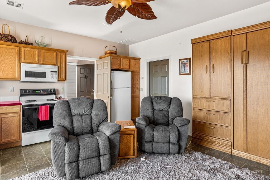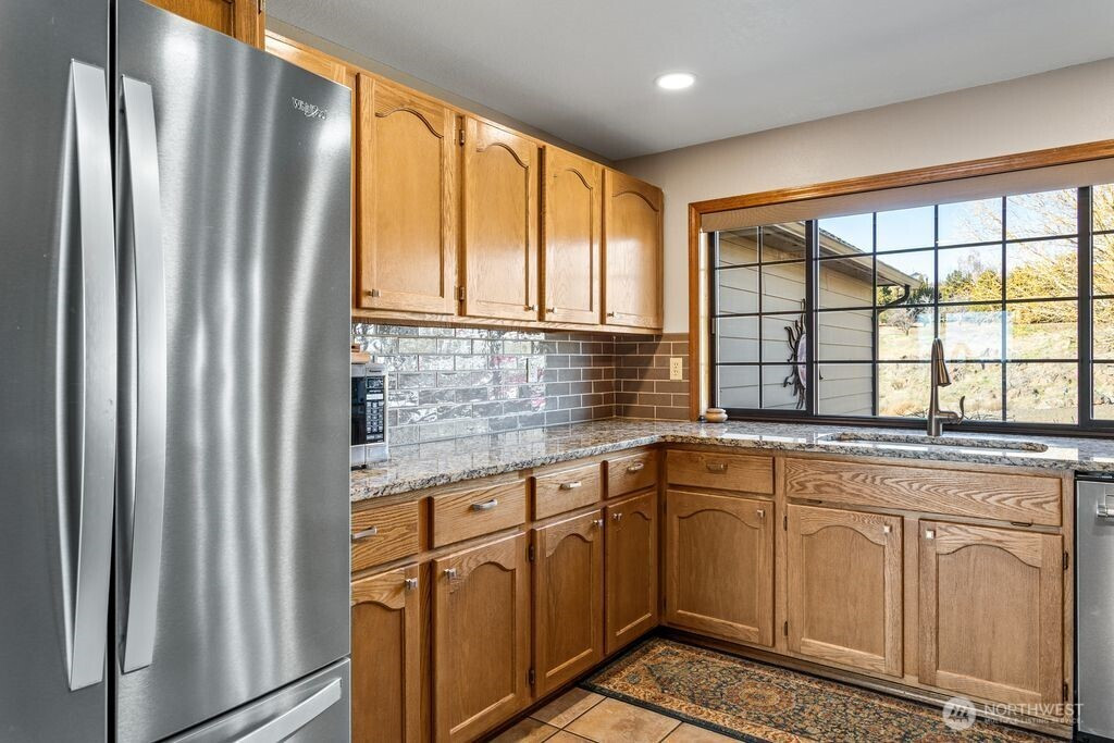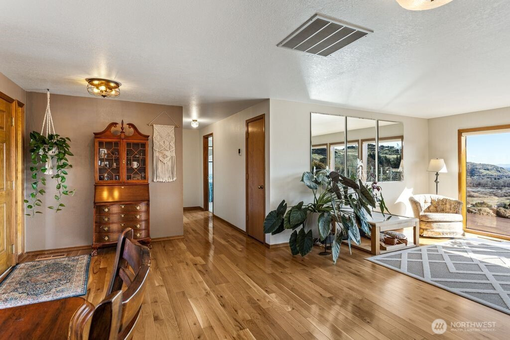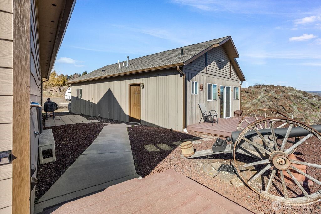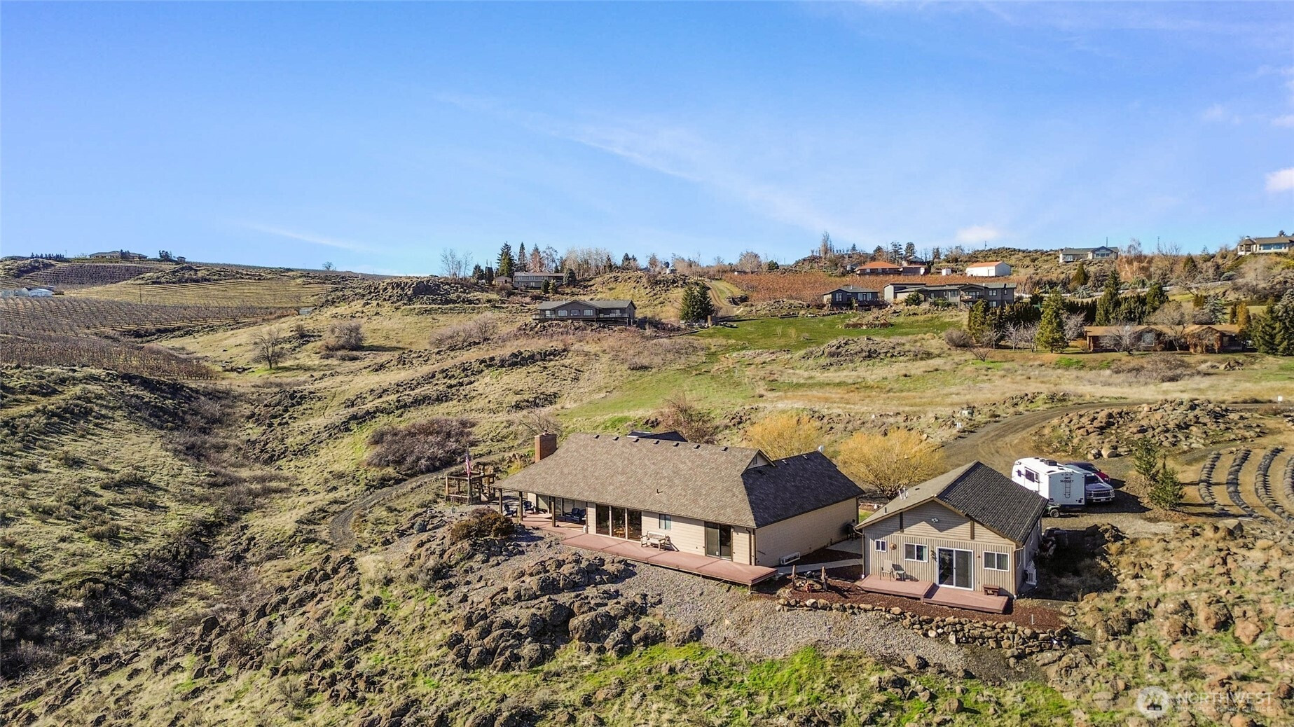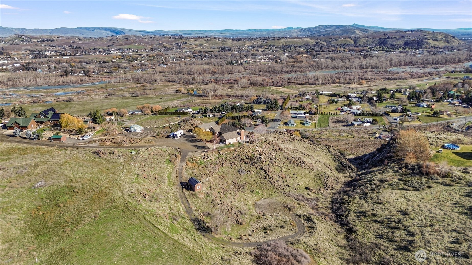 Experience one of the most breathtaking views in Yakima, where the scenery transforms with the seasons, offering a sense of peace and serenity. This home, situated at the end of a road with an unobstructed view, is ideal for those seeking a single-level residence with minimal yard maintenance. It boasts a stunning view of the Naches River and ample space around the property for parking an RV (with waste station), as well as room for future expansion. Step inside to admire the hardwood floors and appreciate the living room's picturesque view, complemented by a separate dining area perfect for entertaining. The kitchen has been upgraded with granite countertops and modern appliances, while the separate family room offers a cozy atmosphere with its view and pellet stove. The main bathroom features a granite countertop and a freestanding bathtub. Ideal for unwinding. The primary bedroom includes an upgraded shower and generous closet space, with an adjoining door to a separate bedroom. This connected room can serve as a nursey or be utilized as an extended bedroom or office area. At the back of the home, a deck provides a perfect spot for barbecuing or simply relaxing while taking in the view. The property also includes an attached two-car garage. Additionally, there is a separate ADU, complete with its own 2-car garage and a studio setup, just a few steps from the main house. This also has a panoramic view and features a murphy bed and heater in garage.