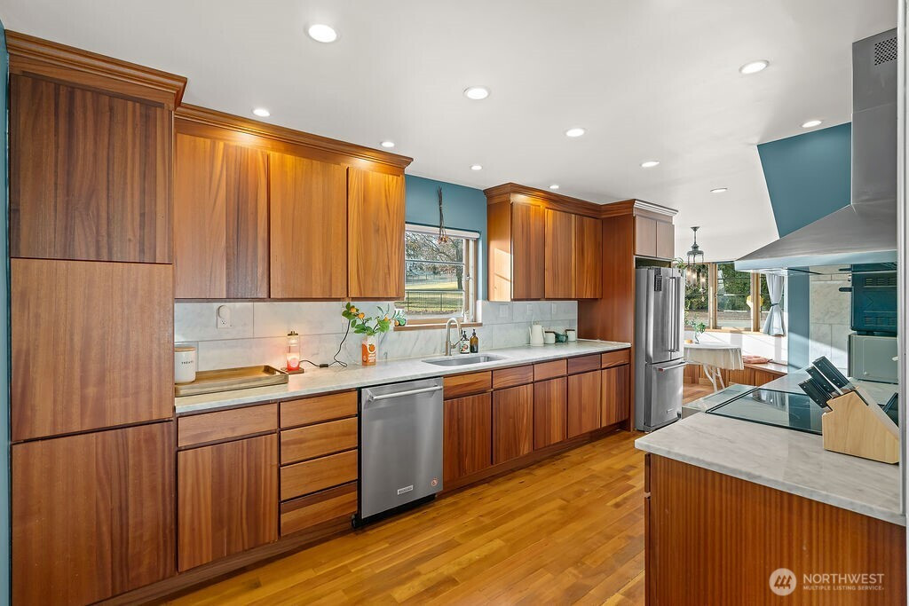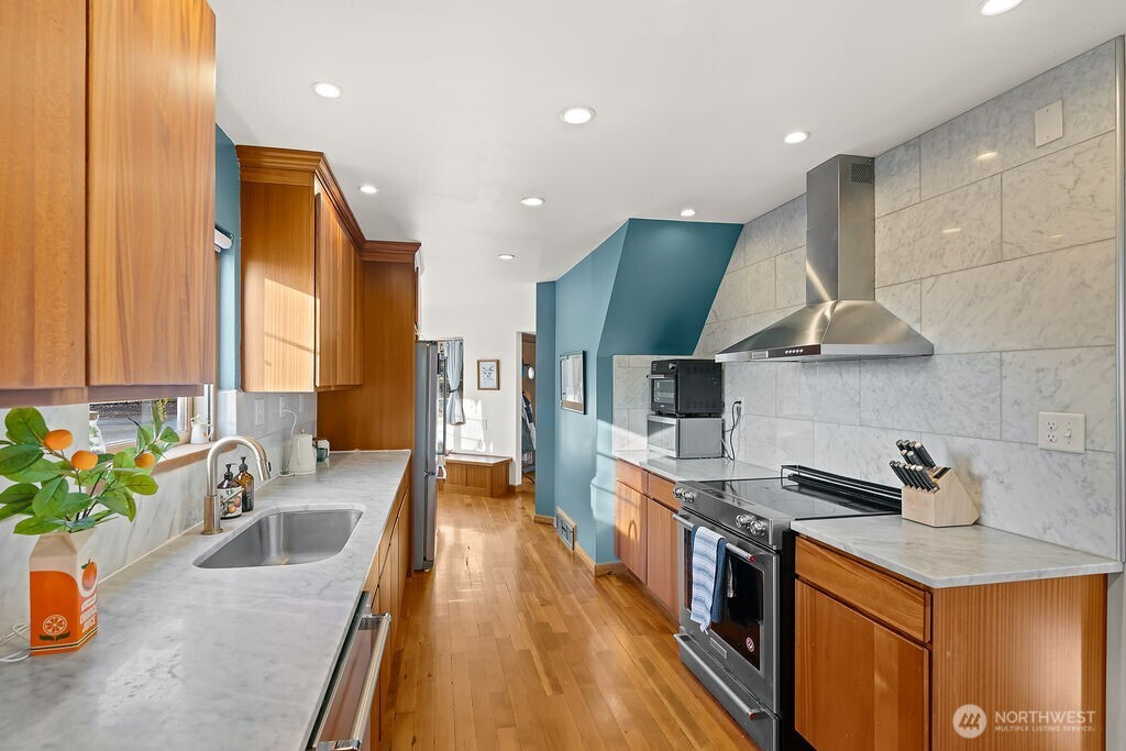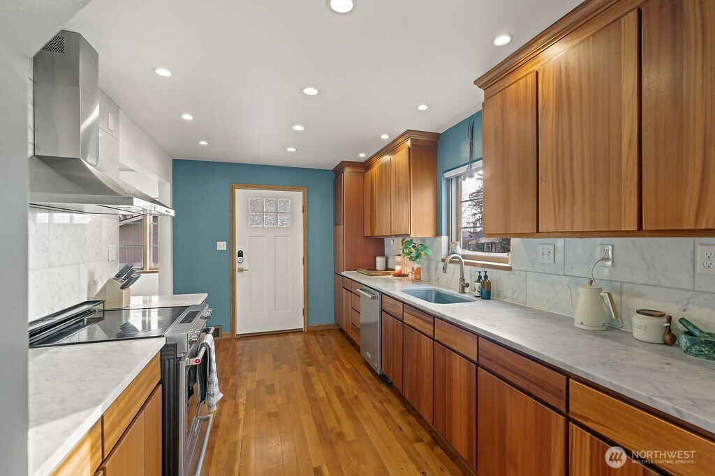 Reimagined art deco beauty on Park Avenue in the coveted Barge-Chestnut neighborhood. This beautifully restored home blends classic mid-century style with modern updates, including a few year-old new kitchen and upstairs bath finished with marble and designer touches. Light-filled living spaces feature tall ceilings, hardwood floors, and oversized windows. The main level offers three spacious bedrooms and inviting living and dining areas, while the walk-out lower level adds an additional 2 bedrooms (one non-conforming), bath, living space, and access to the attached garage. Enjoy outdoor living with a rooftop deck, fresh landscaping, sprinkler system, recreation area, extended driveway, mature trees, and newer exterior paint, plus updated in the last few years is the electrical, and plumbing throughout. Don't miss it and tour today!