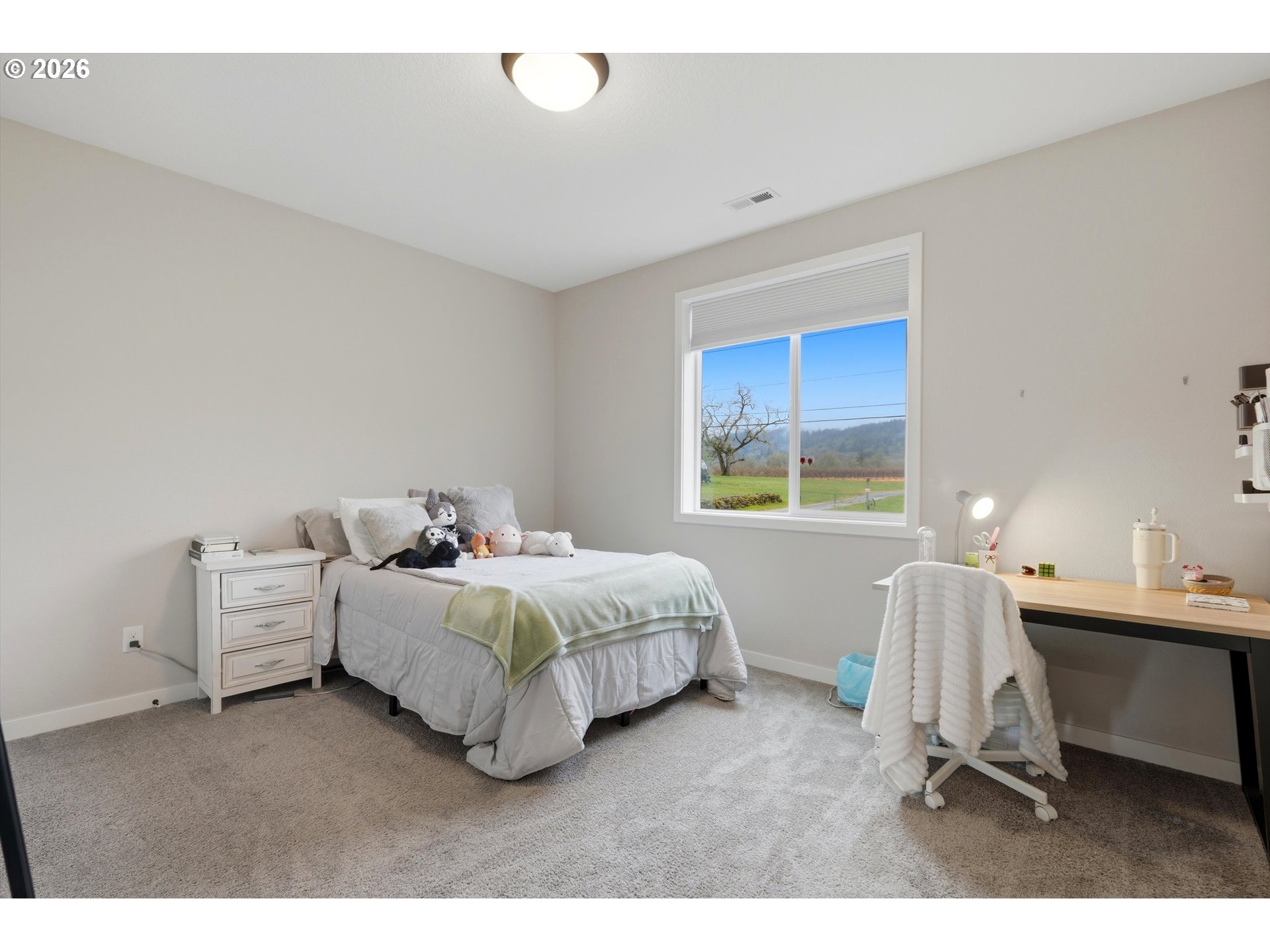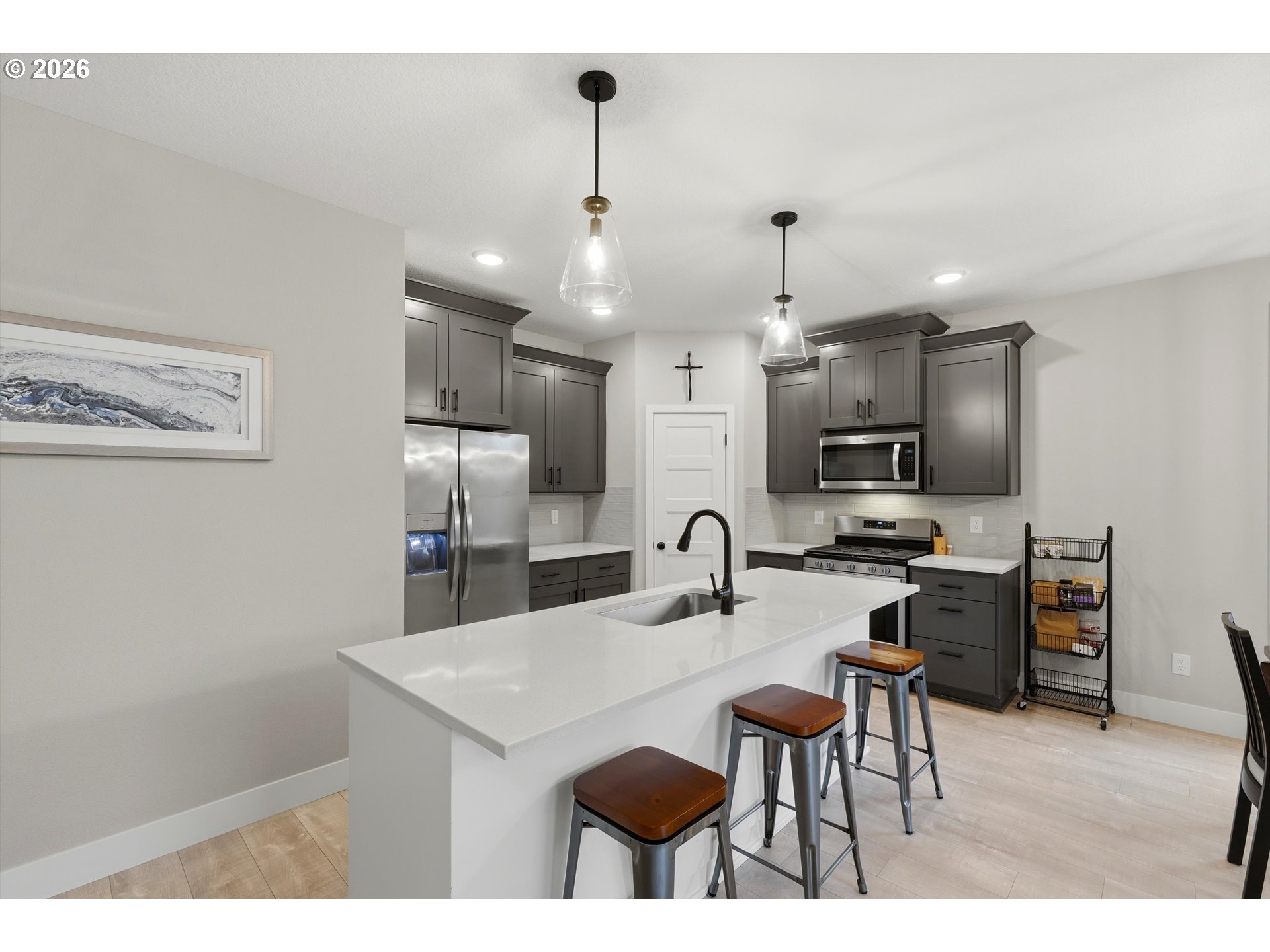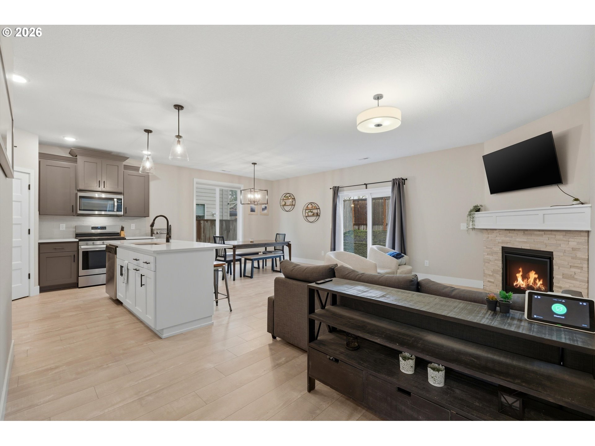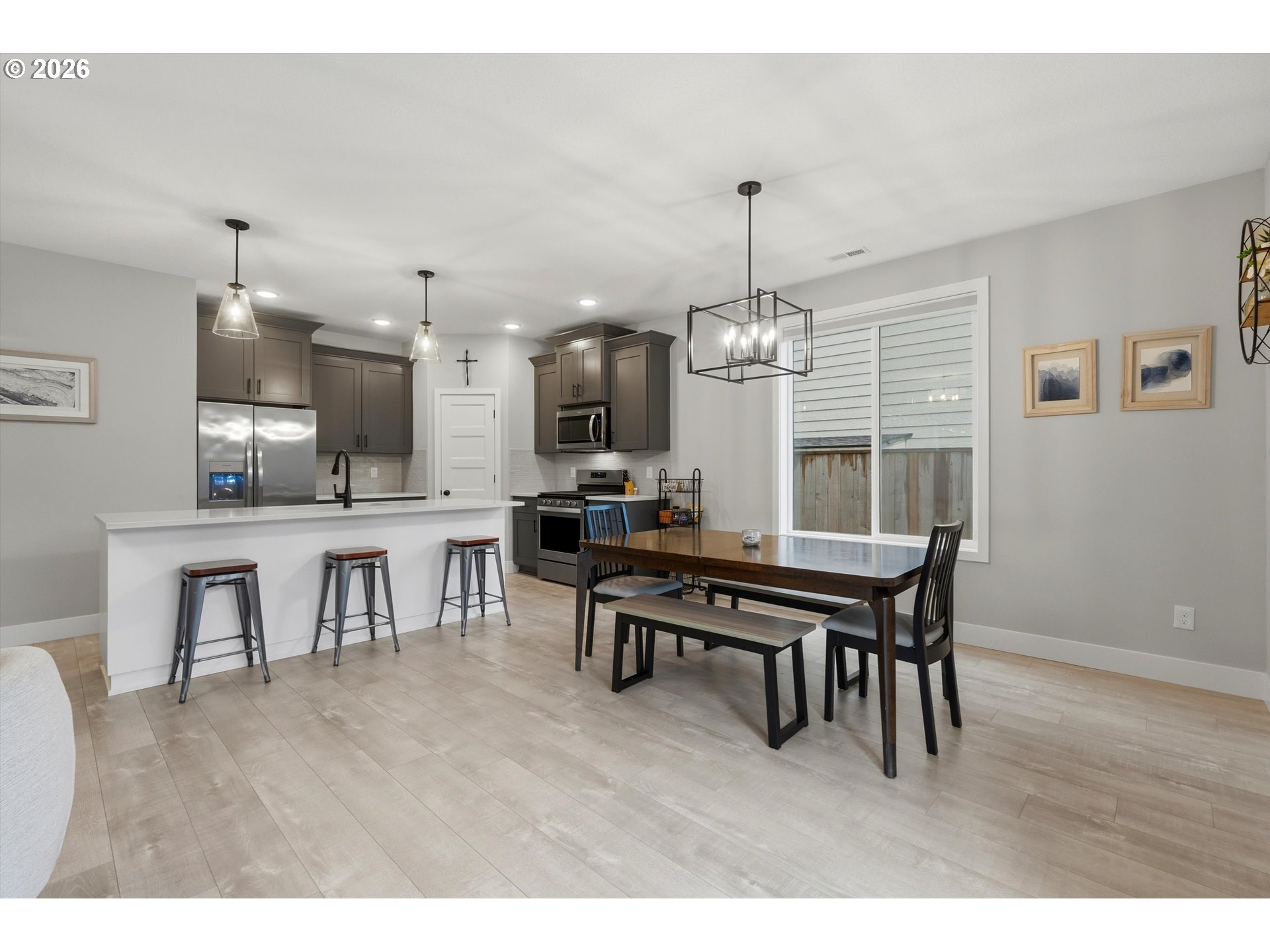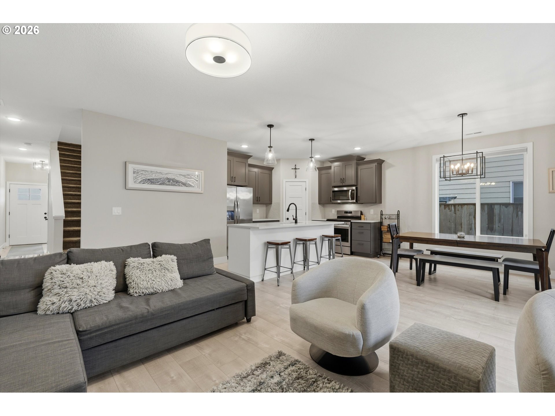 Experience the perfect blend of modern luxury and easy living in this stunning 2,701. Newberg home. Completed in 2023, this 4-bedroom, 2.5-bath home is perfect for someone desiring space and low maintenance. With an acceptable offer, all furniture and decorations (except furniture in bedroom on the NW corner see picture 25) will be included in sale. Washer and dryer are included with a full price offer. The main level features a bright, open-concept floor plan. Enjoy a chef’s kitchen with quartz countertops, massive island and breakfast bar, stainless steel appliances, and walk-in pantry. High-end laminate flooring throughout the living area offers style and durability.Upstairs you'll find a vaulted primary suite complete with a private en-suite bath and walk-in closet, three more spacious bedrooms, and a convenient laundry room. The "wow" factor is the huge bonus room on the third floor — perfect for entertainment, home theater, gym, or creative studio. This move-in ready home features a low-maintenance yard, and puts you just minutes away from Newberg’s famous wineries, top-rated schools, and local parks.