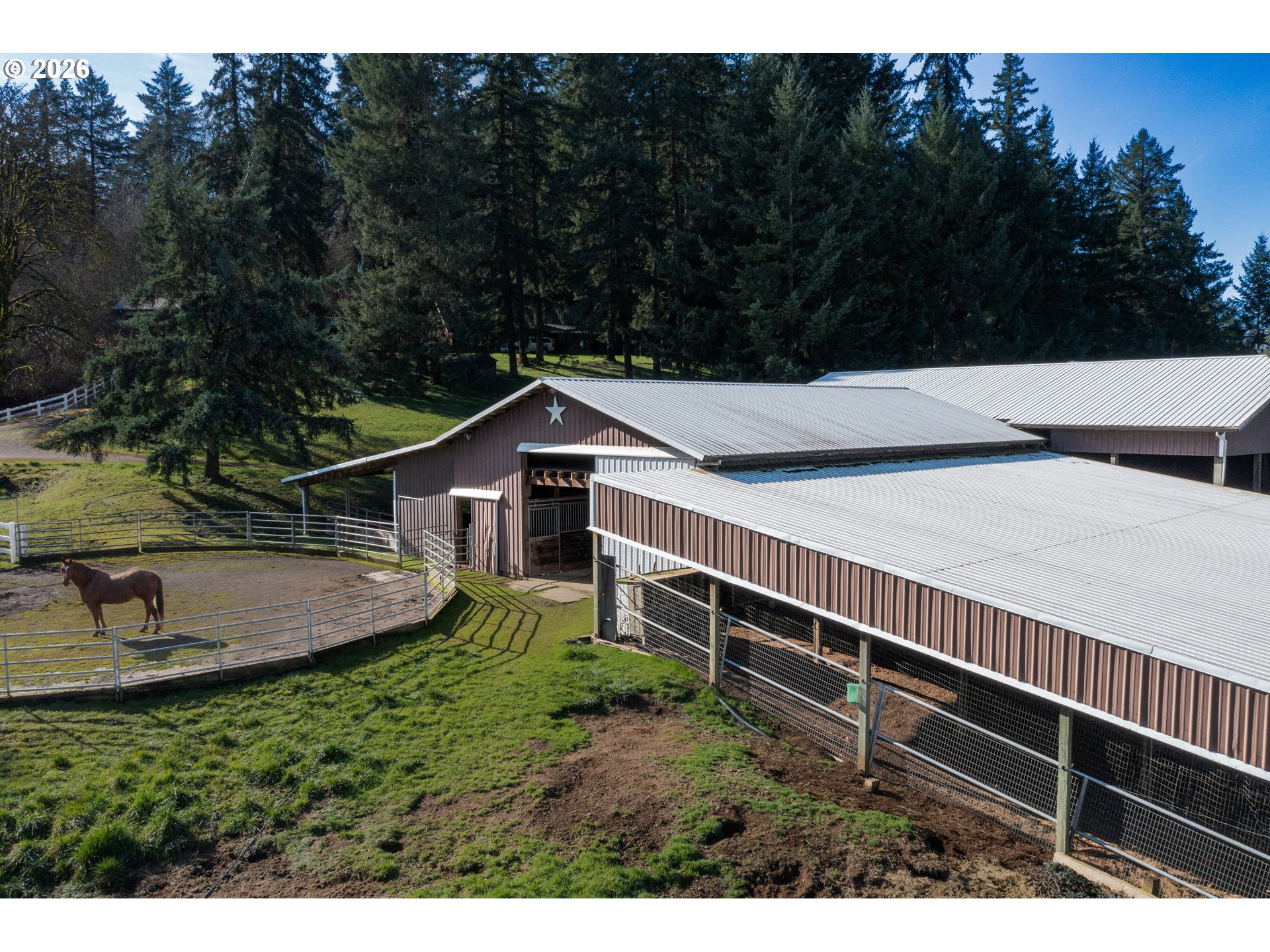 Welcome to your dream horse property in the heart of Oregon wine country! This exceptional 20-acre retreat combines a spacious, lodge-style home with top-tier equestrian facilities, offering the perfect blend of comfortable living and serious horse amenities. This charming 2,664 sq ft lodge-style residence features 4 bedrooms and 3 full baths, highlighted by double primary suites. Enjoy vaulted ceilings, a cozy wood-burning fireplace, central heat, and modern stainless steel appliances in the kitchen. Additional highlights include a dedicated solarium, a 3-car garage plus RV carport. The fully fenced yard provides privacy and space to relax. 8-stall barn with individual runs, equipped with a tack room, fly spray system, electric fencing, auto waterers, and a wash rack complete with hot water and sink. Solar panels power (fully owned) both barns for energy-efficient and cost-saving! The entire 20 acres is cross-fenced into 6 pastures, with water access throughout. Approximately 90% is flat and usable, while 10% offers wooded charm. A private security gate and separate business entrance add convenience and security. Near the back barn, enjoy an outdoor camping space with a fire pit for relaxing evenings or guest overflow. Simply too many features to list here, ask your realtor for the full feature doc and be ready to be impressed. Don’t miss this exceptional opportunity!