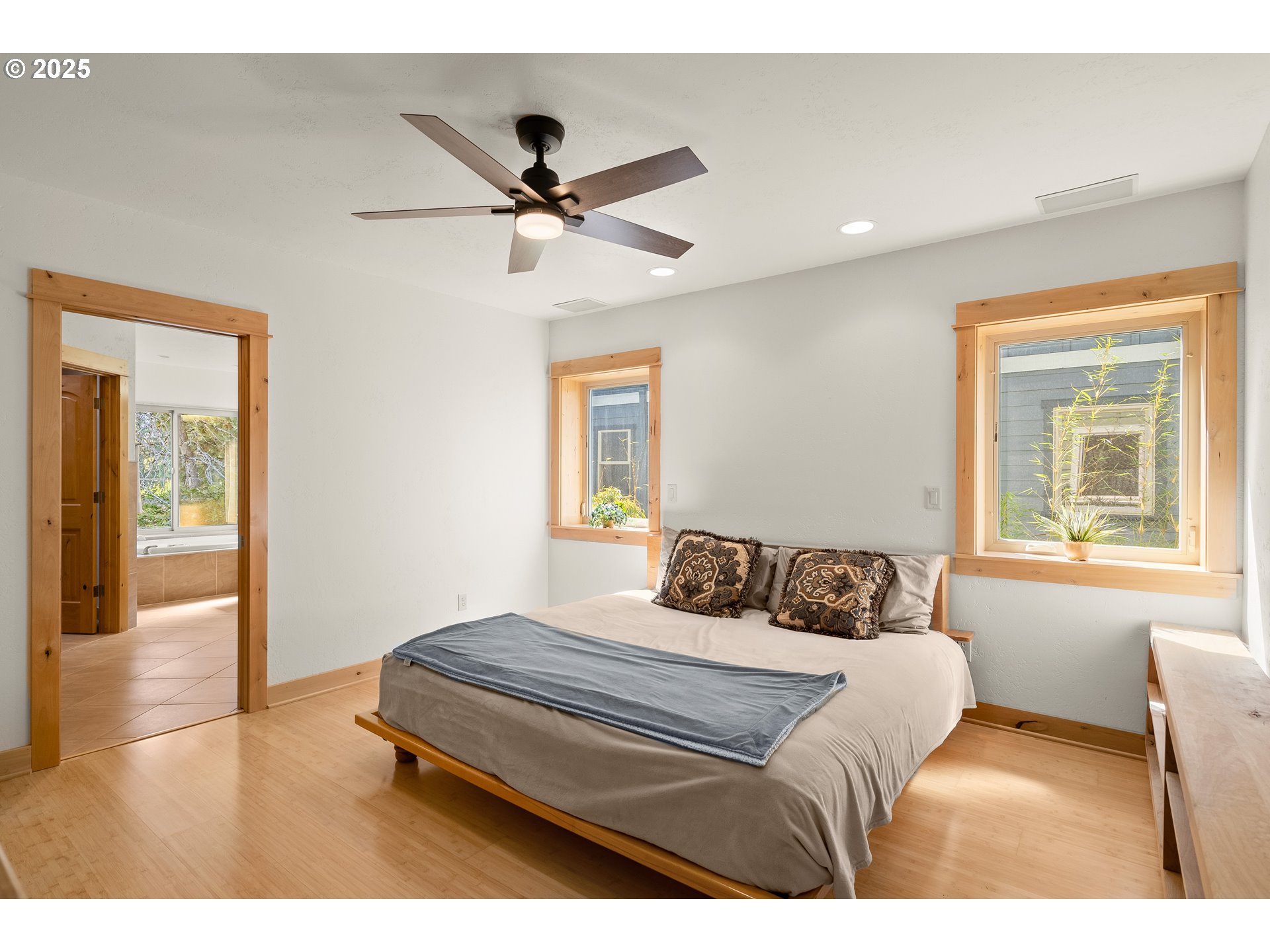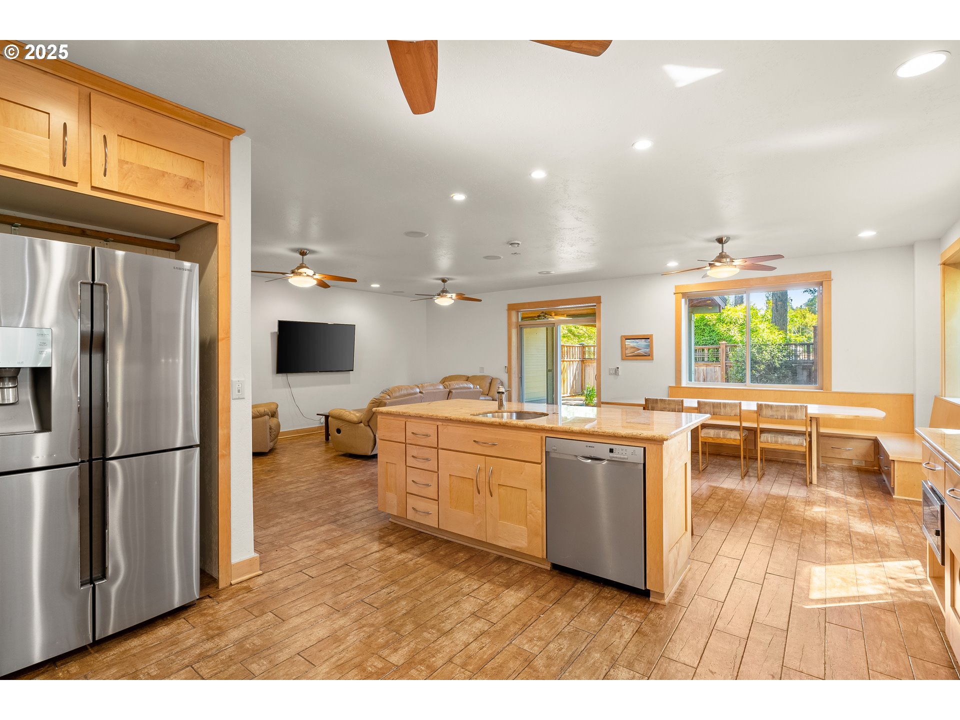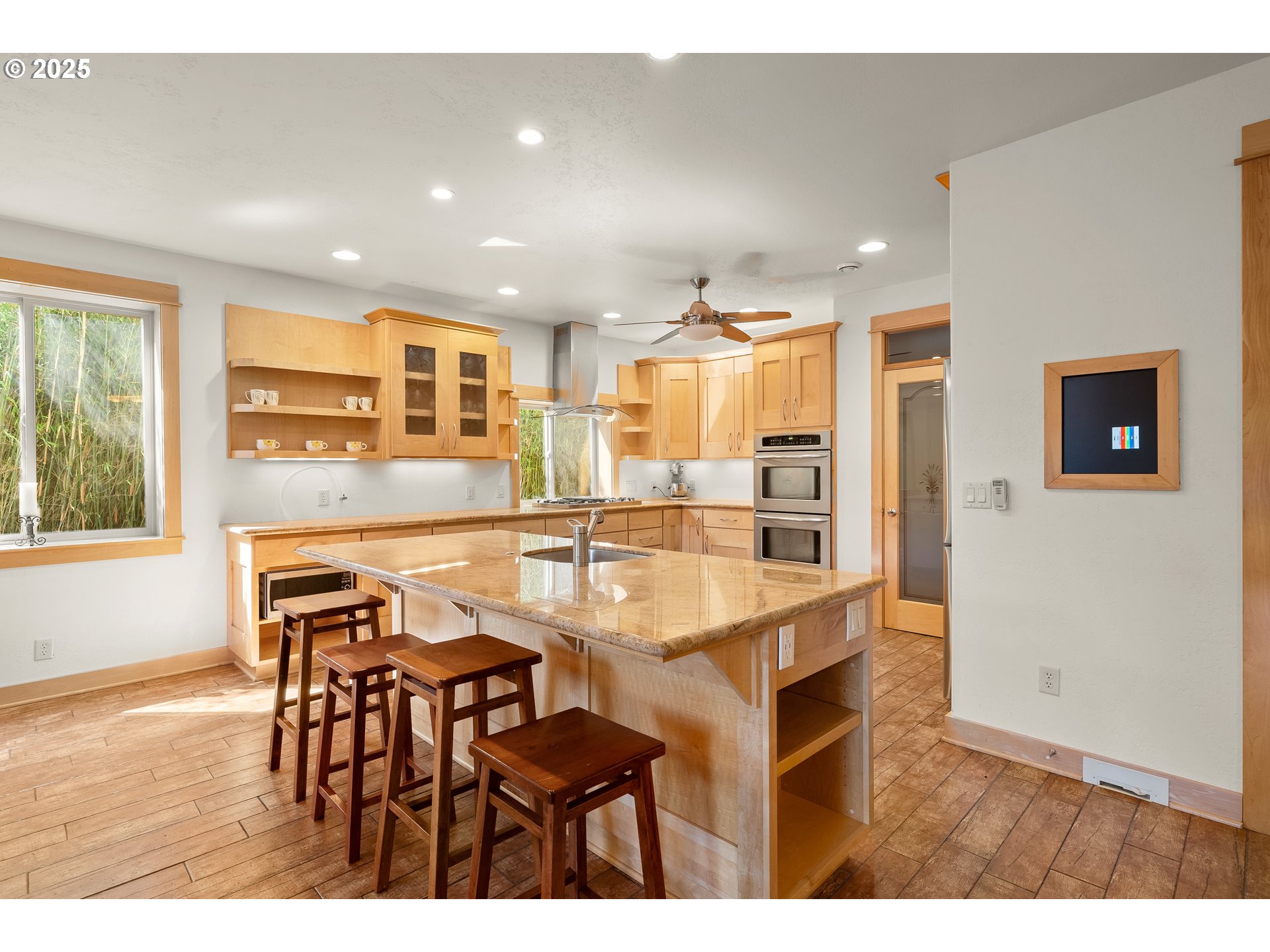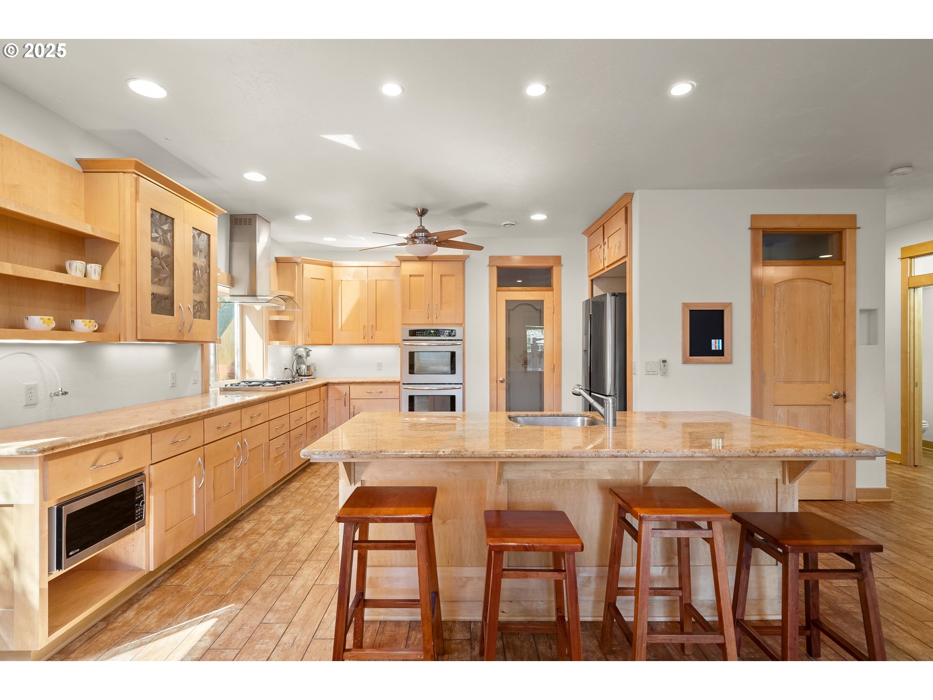 This custom-built, single-owner home is a rare find, blending thoughtful design with quality craftsmanship throughout. The main floor features durable tile flooring, cherry wood stairs, and maple cabinetry, while the upper level boasts bamboo flooring, knotty alder trim, solid wood doors, and vaulted ceilings with skylights. The gourmet kitchen is a true centerpiece, complete with granite countertops, a large island, 6-burner gas range, built-in range and hood, double ovens, stainless steel appliances, built-in dishwasher, disposal, pantry, and freestanding refrigerator. The kitchen is even plumbed for an espresso maker and includes a custom ash dining table with built-in dining bench seating. The spacious family room offers ceiling fans and abundant natural light, while the upstairs bonus area shines with vaulted ceilings and skylights. The primary suite is designed for both comfort and function with a built-in desk, ceiling fan, built-in TV, sun-tube closet, and a luxurious soaker tub. The hall bath is highlighted by a one-of-a-kind custom concrete sink. Additional features include a covered patio with ceiling fan, custom shelving in the garage, and LEED certification for efficiency and sustainability. This home was built with care, attention to detail, and lasting quality—ready to welcome its next owner.