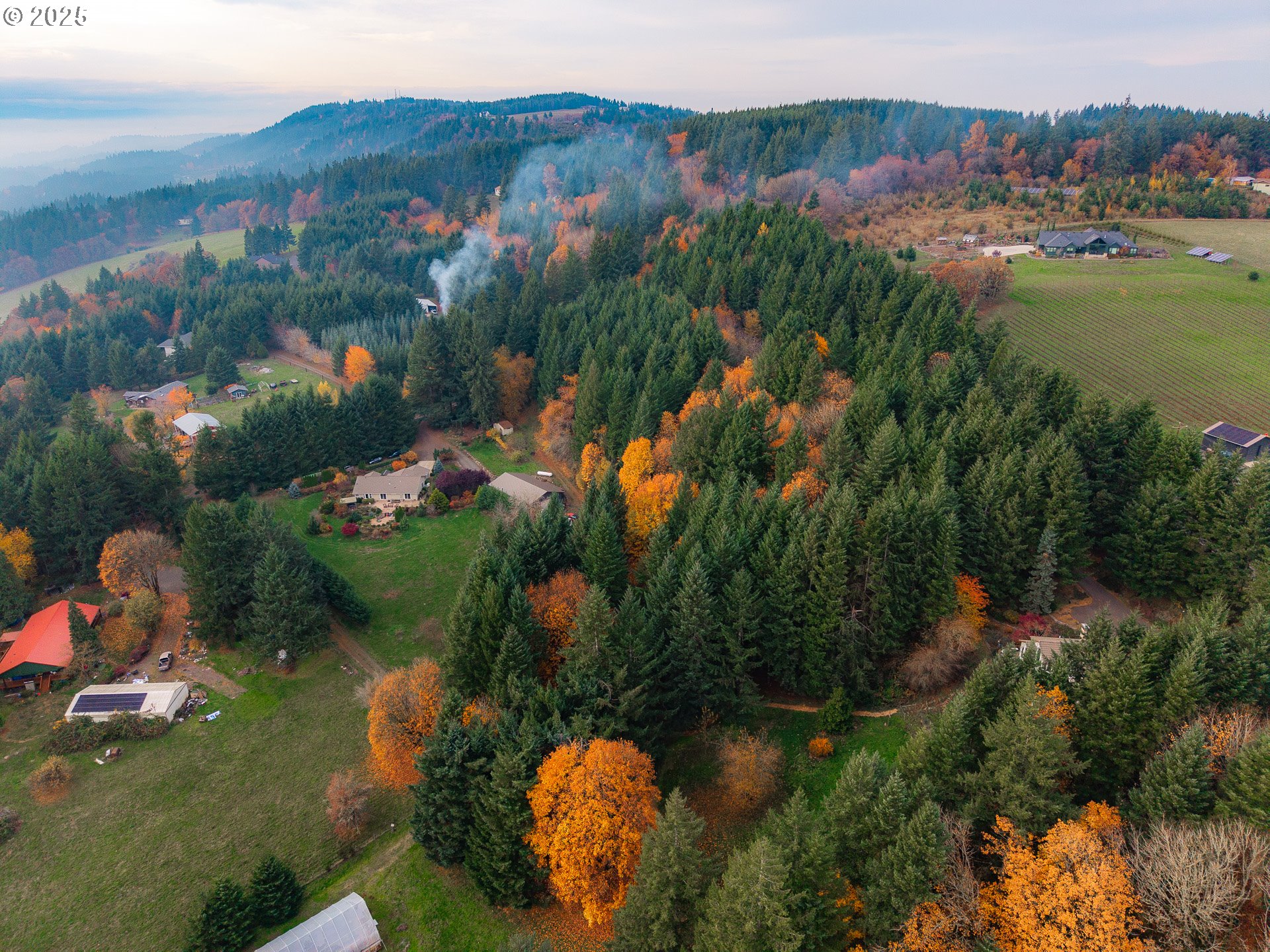 (503) 893-8874Dreamy, forested & private acreage just minutes to downtown Newberg & easy access to 219 & 99W. Custom built Ranch home offers two ensuites & two additional bedrooms with full bath access. Vaulted/Grand Great Room with floor to ceiling brick flanked 65'X16" propane glass encased efficiency fireplace open to gourmet kitchen with stainless steel, built in & upgraded appliances, quartz counters, eat island and informal dining area with access to patio. All luxury Vinyl plank floors, no carpet throughout home. Outdoor entertainers dream two level stamped concrete patio, firepit, pergola and lush landscaping. Beautiful pasture behind patio. Oversized two car garage. Full exterior concrete sidewalk around house. 37'X60' cement floor outbuilding/shop with office & bathroom has 15' ceiling, two 12' entry doors, storage for boats, RV and much more! Huge enclosed tent behind outbuilding for extra cars/storage. Fruit orchard with Bing & pie cherry, pear, apple & plum trees, kiwi vines, Pinot grape, seedless red & green grape vines & raspberry bushes. Garden area with raised garden beds. Chicken coop and large fenced area can also be a dog run. Upper two acres separated by driveway would have sweeping territorial views with trees cut down and potential for ADU (buyer due diligence at county). High efficiency Starlink internet but also DSL wired. 1000-gallon septic, 1000 gallon leased propane tank for fireplace & full house Generac backup generator, water treatment system, high performance hot water heater & heat pump, Trane furnace. Great producing well plus 3000-gallon cistern (2nd well on property capped) & two sprinkler systems. Ring doorbell and 3 exterior cameras for security system included. Outdoor faucet with cold and hot water. Forest deferred secluded property with low annual taxes. No HOA or CC&R’s.