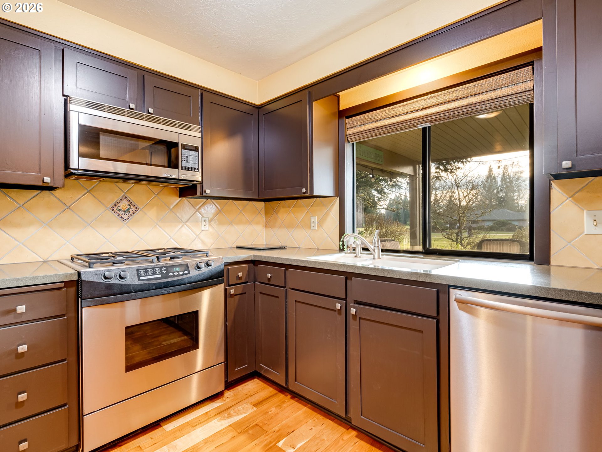 (503) 893-8874Here it Is! Updated, Single-level home located on Michelbook Country Club along the 9th fairway. Golf course views provide privacy, with the cart path on the opposite side of the fairway. This 3-bedroom, 2-bath home offers comfortable one-level living in a desirable setting. Beautiful double doors at the front of the home open to an entry with refinished cherry floors. The space leads into a versatile living room that can serve as a combined living and dining area. The room features a gas fireplace, built-ins, and sliding glass doors overlooking the fairway. The kitchen is well-appointed with a Dacor microwave and gas range, Corian countertops and sink, tile backsplash, a KitchenAid refrigerator, and new window shades. Refinished wood floors continue through the kitchen, family room, and eating nook, which has sliding glass doors to the covered back deck. The large primary bedroom includes new carpet, an ensuite, gas fireplace, and sliding doors to a bright four-season sunroom. The home also features two water heaters for added convenience. The front and back yards are beautifully maintained, with a good-sized covered deck in back and ample side yards—perfect for outdoor entertaining and enjoying the golf course setting.