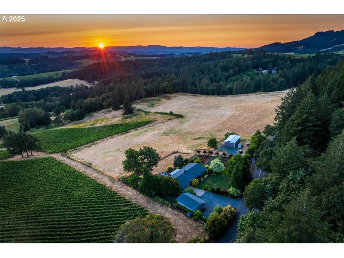 Now is the time to invest in Oregon wine country! Incredible values including this striking large acreage parcel in heart of it all. Stunning views in this hilltop home with expansive acreage nestled on a coveted winery lane surrounded by premier vineyards! The rolling hills and breathtaking views of the Coastal Mountain Range set the stage for a stunning backdrop. This home offers effortless one-level living with three-bedrooms, two-and-a-half-bath and living, dining and family rooms. The kitchen is open to a spacious nook with striking 180 degree views and a sliding door out to the expansive covered deck. Immaculately maintained gardens and grounds include one acre of fully manicured landscape, creating a serene and picturesque retreat. Complete with an attached two car garage, this home also has a second detached garage easily accommodating additional vehicles, shop area and storage. Enjoy an additional spacious metal outbuilding is perfect for farm equipment, boats, and all the toys! This property is ideal for growing everything you need, making it perfect for a self-sustaining lifestyle. Imagine cultivating your own produce, planting a vineyard, creating an equestrian facility or simply reveling in the peace and scenic charm of this extraordinary estate! This property truly captures the essence of country living, yet also has quick access to both downtown Newberg and Dundee and under one hour to Portland Airport. Opportunities abound with so many possibilities. Welcome home!!!