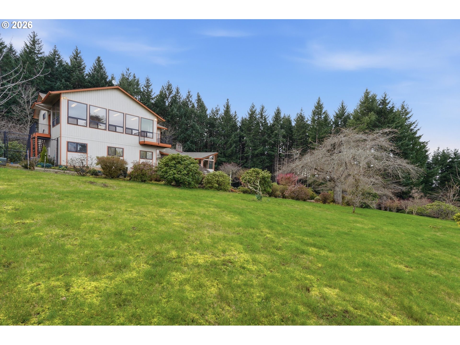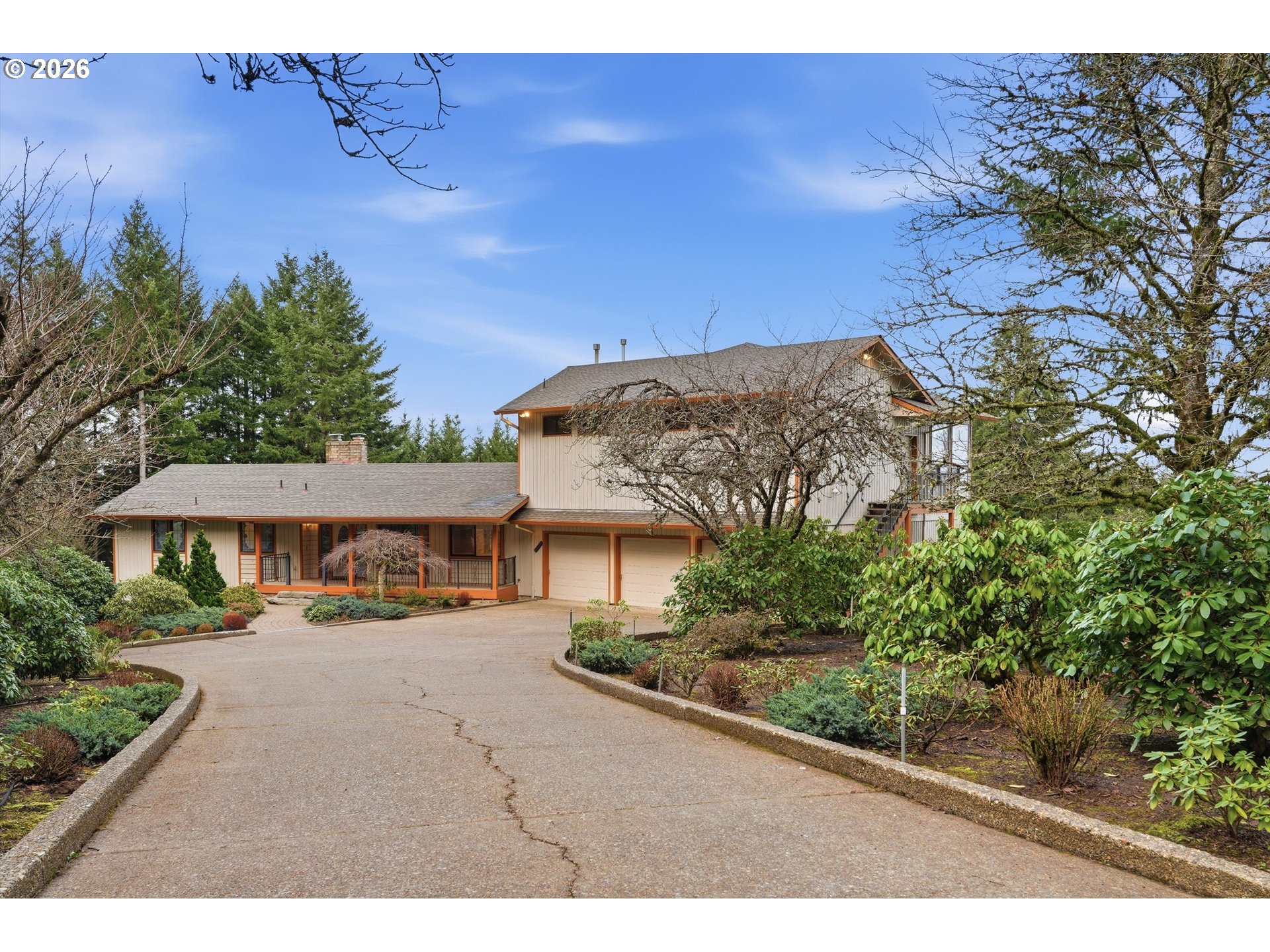 Beautifully maintained by its original owner, this three-story daylight basement home sits atop Chehalem Mountain in the heart of Yamhill County wine country. Enjoy stunning views of Mt Hood along with partial views of Mt. St. Helens, Mt. Rainier and Mt. Adams. Built in 1977 on 6.47 acres, the home offers approximately 3,020 sq ft of living space, plus an additional 1,334 sq ft of flex space above the 3-bay oversized garage. The flex space is perfect for an art studio, remote work, gym or guest space. Interior features include main level living, hardwood floors, vaulted beamed ceilings, multiple fireplaces including a dramatic floor-to-ceiling stone fireplace, a spacious primary suite and central vac system. The cherry wood kitchen opens to a formal dining room, ideal for entertaining. The lower level includes three bedrooms, a full bath, family room, dark room and laundry. The various decks invite you to relax and enjoy peaceful privacy, beautiful mature landscaping and fenced gardens. A workshop which can be accessed in the garage adds functionality for hobbies or projects. Conveniently located just 15 minutes to Newberg, 20 minutes to the Hillsboro High Tech Corridor, numerous wineries, restaurants and all that Oregon wine country has to offer. This exceptional property blends privacy, views and so much versatility. Schedule a showing today.