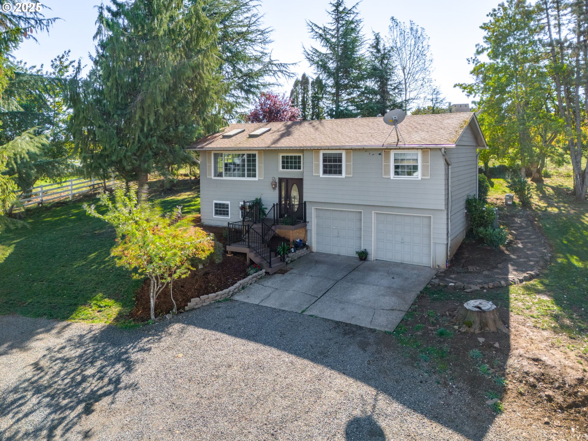 Experience stunning panoramic views and an incredible shop setup from this one-of-a-kind chalet-style retreat in the heart of Eola Hills wine country. Perfectly perched on 5 private acres, this property has sweeping vistas of the Willamette Valley and four iconic peaks—Mt. Hood, Mt. Jefferson, Mt. St. Helens, and Mt. Adams. The show-stopping 3,000 sq ft, two-level shop is a dream come true for hobbyists, small business owners, or anyone needing serious workspace. With 18-foot-wide doors, heating and air conditioning, and a versatile upper level that’s kitchen-ready and ADU-capable, the options are endless. The lower level functions as a spacious garage with its own half bath. The home features vaulted ceilings and dramatic floor-to-ceiling windows that frame the breathtaking scenery and fill the interior with natural light. A wood stove adds warmth and charm to the main living space. The kitchen has granite countertops, stainless steel appliances, an eat-in bar, and a pantry, opening to a dining area with sliders to a view deck making it perfect for sunset dinners. The primary suite offers deck access, vaulted ceilings, a walk-in closet, and a private bath. Upstairs are two additional bedrooms and a full bath. Downstairs, the finished basement offers an expansive bonus room with hardwood floors, a den, theater room, full bath, and laundry that's ideal for entertaining or multi-generational living. The fully fenced property includes a secure gated entrance, approximately two dozen fruit trees, blueberries, and a large garden with automatic watering system. Located minutes from a state park and Highway 99, this peaceful estate offers both seclusion and accessibility.*Bedroom and bathroom count includes additional living space in the shop.