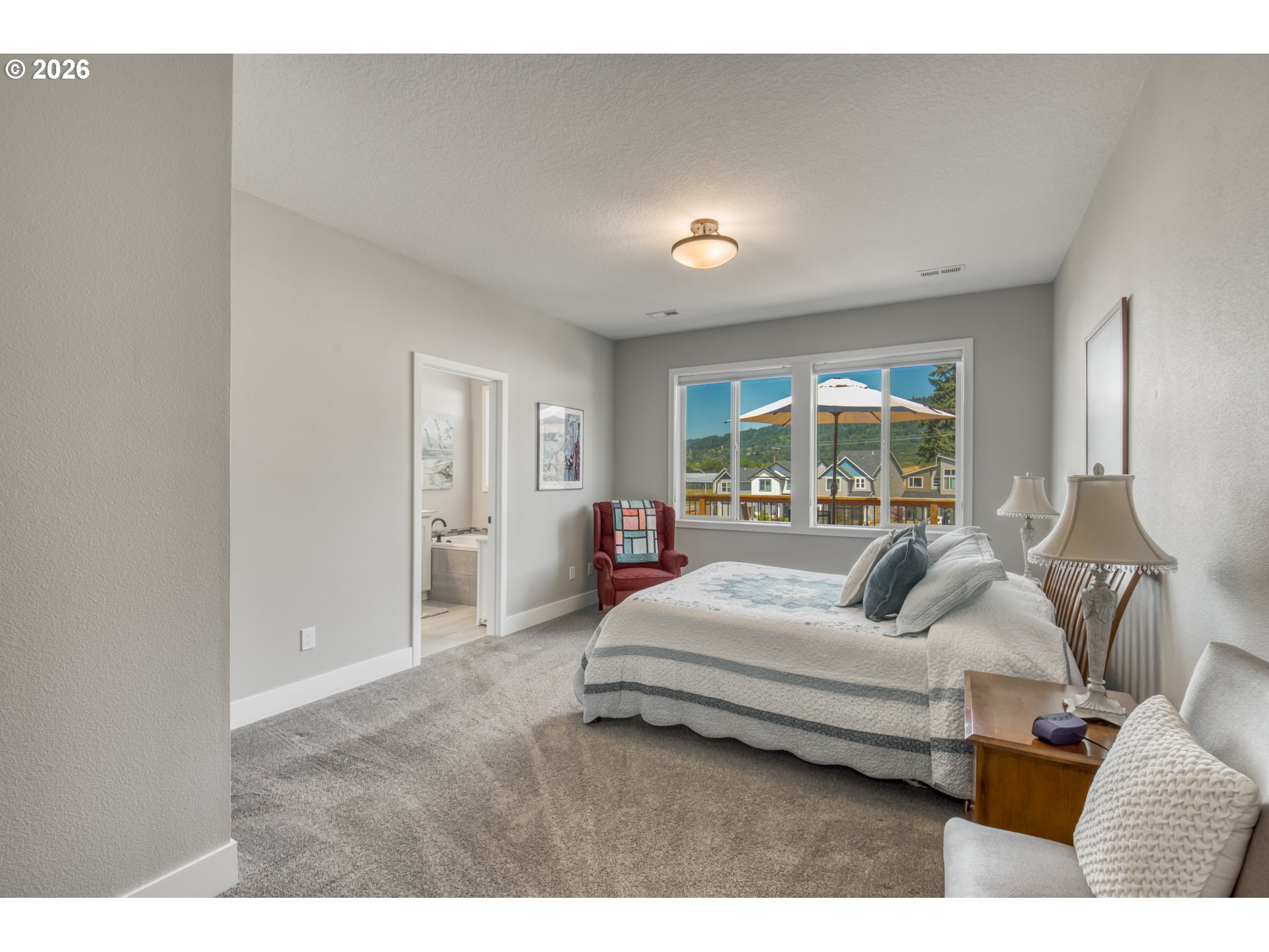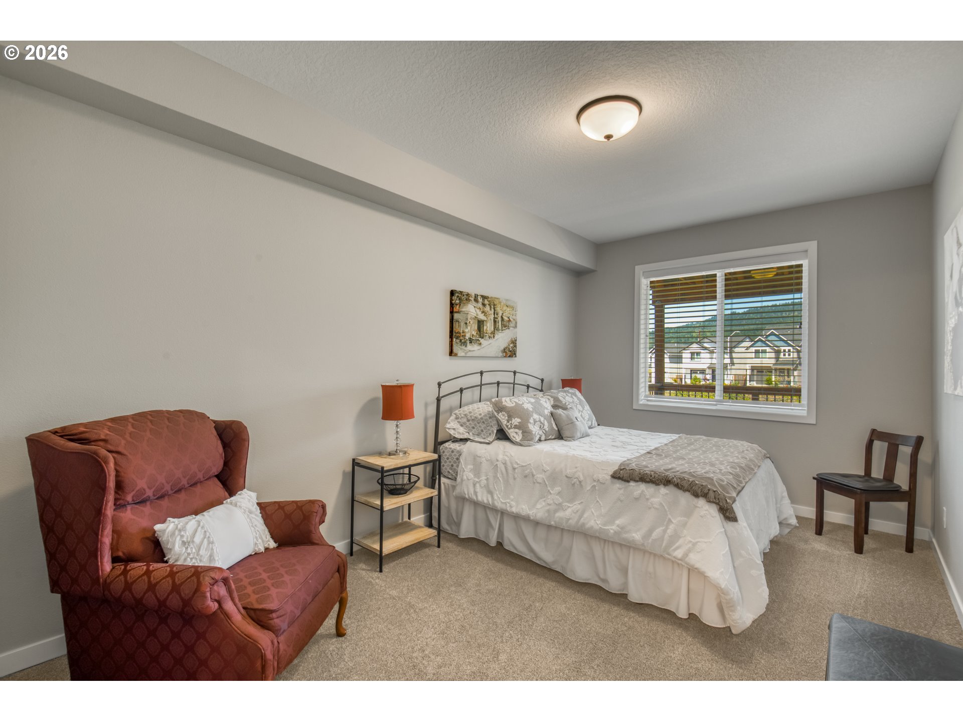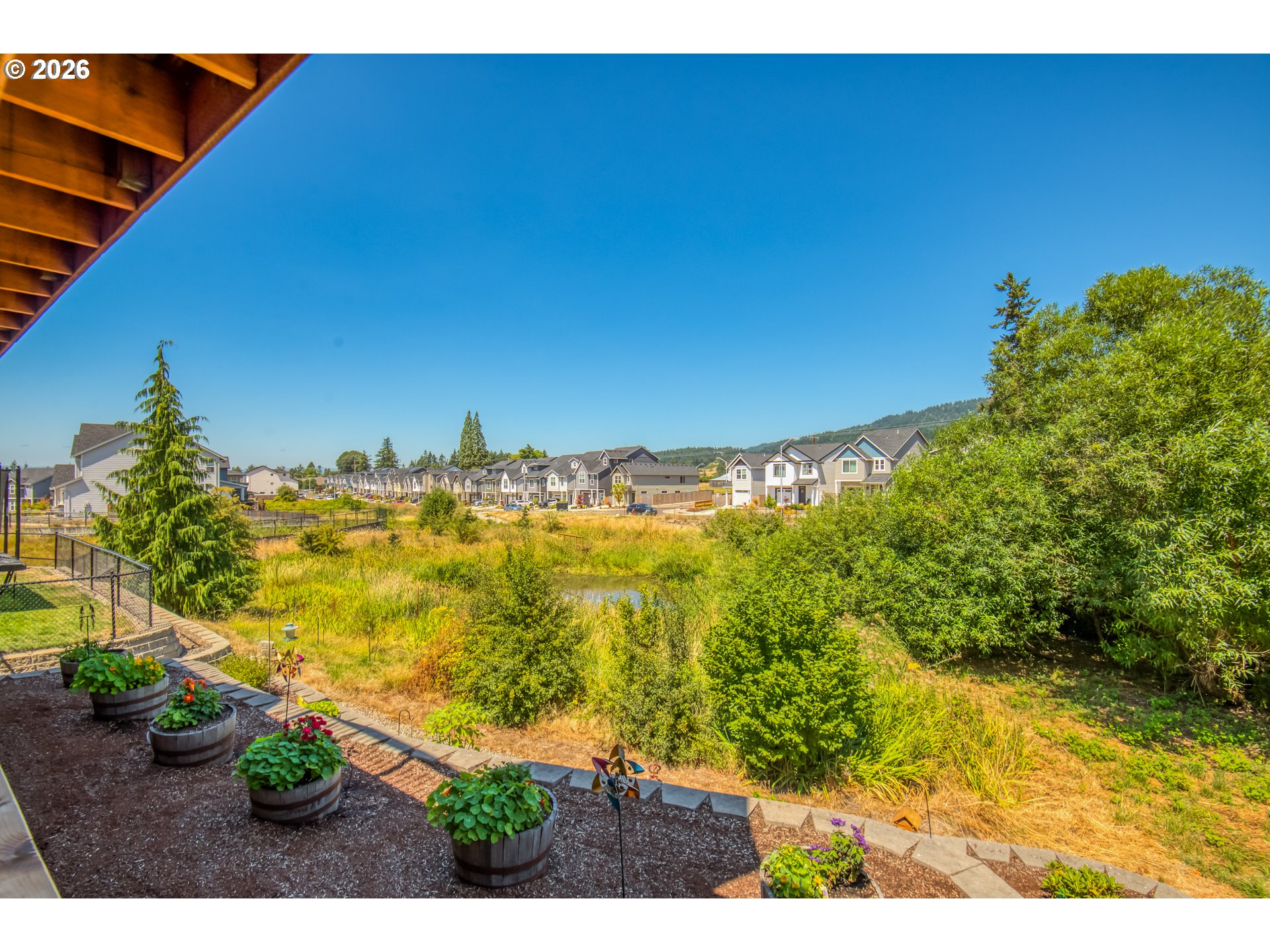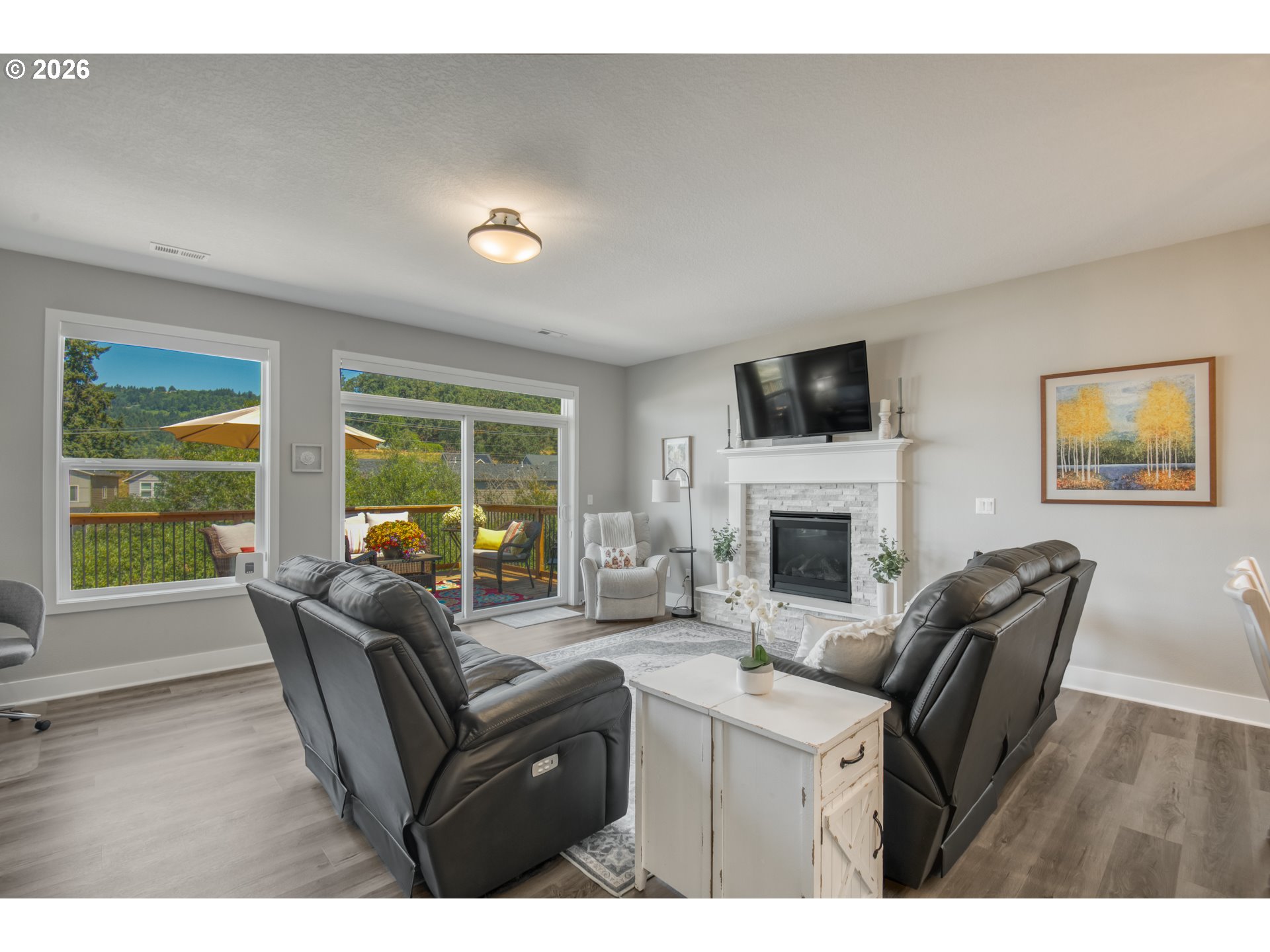 MASTER ON MAIN + DUAL LIVING POTENTIAL and SUNSET VIEWS! Better than new, built in 2021, this beautifully upgraded 3+ bedroom, 2.5 bath home offers 2,528 sq ft of flexible living space with true main-level living and thoughtful modern finishes throughout.The main level features a spacious primary suite with soaking tub, walk-in closet, and nearby laundry for convenient single-level living. The open-concept layout is filled with natural light and showcases luxury vinyl plank flooring, soaring ceilings, and a stacked-stone gas fireplace along with a main floor den. The kitchen is designed for everyday living and entertaining with quartz countertops, soft-close cabinetry, stainless steel appliances, large island, and custom pantry storage with pullouts.Downstairs provides additional bedrooms plus bonus/flex space ideal for guests, home office, or multi-generational living. Step outside to professionally landscaped, terraced grounds with decorative concrete retaining walls, tiered garden beds, and multiple view decks spanning both levels. Enjoy peaceful sunsets with Chehalem Mountain and pond views. Additional upgrades include central A/C, permanent programmable exterior lighting for seasonal lighting effects, updated landscaping, additional cabinets and attached two-car garage.Conveniently located near parks, schools, and recreation, with easy access to downtown shops, dining, and wine country. Move-in ready with modern systems and low-maintenance finishes.