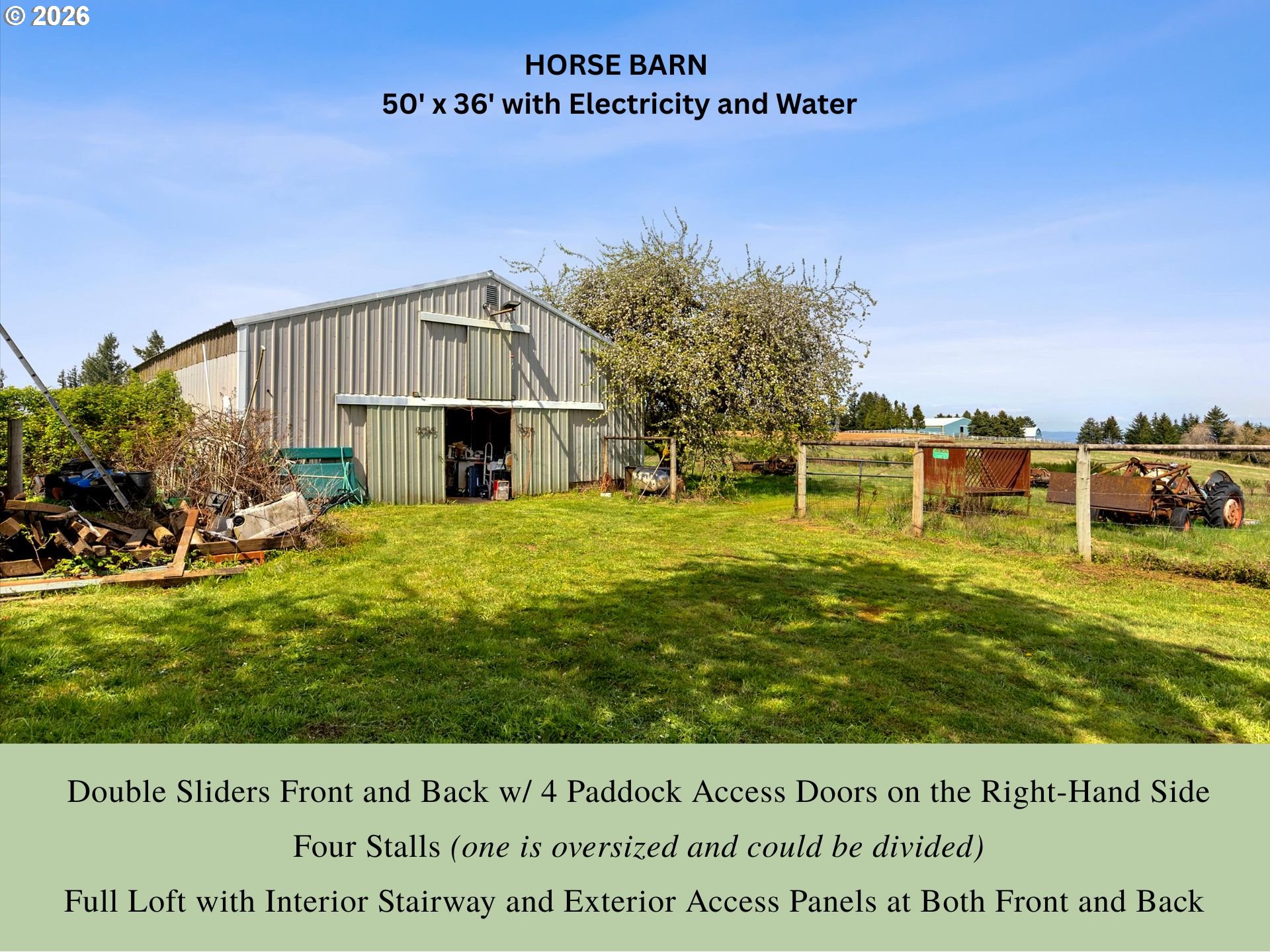 (503) 893-8874Absolutely stunning mountaintop acreage with sweeping views on both sides. A peaceful, private setting with plenty of usable land, ideal for horses, hobbies, or simply room to breathe. The 50’ x 36’ horse barn is well-equipped with electricity and water, double sliding doors at both the front and rear, plus four paddock access doors along the right side. Inside, you’ll find four stalls (including one oversized stall that could be divided) and a full loft with both an interior stairway and exterior access panels at the front and back. A 40’ x 30’ shop offers power, approximately 90% concrete slab flooring, and a 15’ x 10’ loft, perfect for storage, workspace, or equipment. The 2008 manufactured home offers a solid structure and a functional, comfortable floor plan ready for your vision. If you’ve been looking for privacy, usable acreage, and a place to unwind while taking in beautiful views, this property delivers.