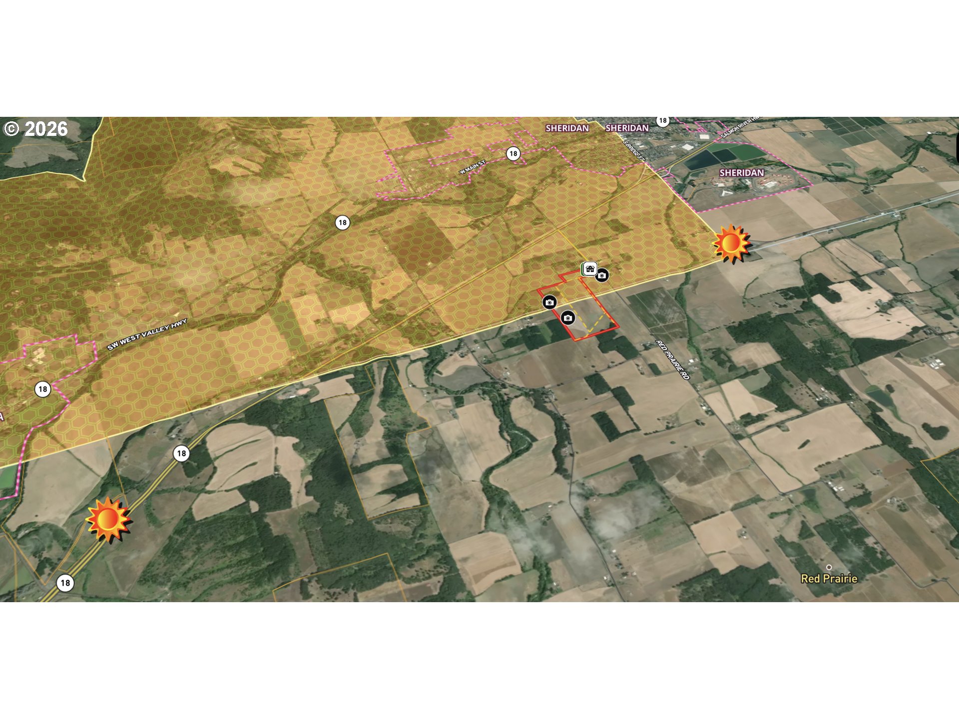 0.5 mi to Hwy 18 • 90 acres • Opportunity Zone • Territorial views • Large acreage property with 90 acres spanning Polk and Yamhill counties, located 0.5 miles to Hwy 18 and 5.3 miles to Hwy 22. Approximately 41 acres are within an Opportunity Zone. The property features a 2023 Skyline Athena manufactured home with 2 bedrooms, 2 baths, and 1,296 sq ft of singleblevel living. Open concept kitchen with island and solid surface counters connects to a light filled living area with solar tube lighting. Primary suite includes soaking tub and double vanity. Approximately 10 acres are designated for the homesite, oak grove, and access roads, with the remaining 80 acres under a Christmas tree farm lease through 2028. Territorial and tree farm views extend across the property. Located in an area with multiple nearby solar energy developments along the Hwy 18 corridor.Detached 24×25 steel garage/shop with dual 10' roll up doors plus pump house near the homesite. Gravel driveway from paved Red Prairie Rd. Private well and septic system. Approved for connection to Buell-Red Prairie Water District. EFU zoning. Located near Sheridan and McMinnville with access to Hwy 18 and Hwy 22, and within Oregon’s wine region.