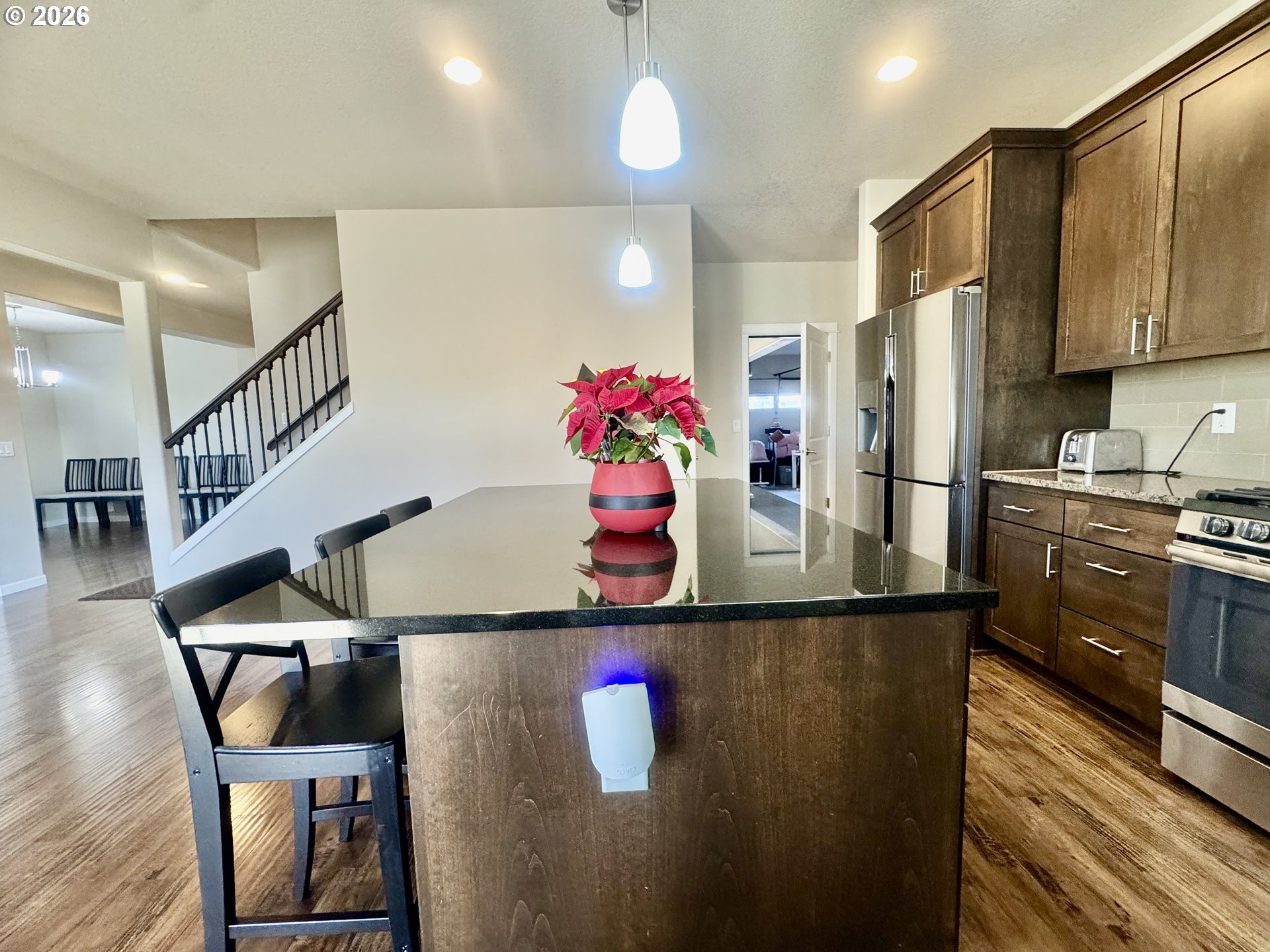 This spacious residence features a chef's kitchen with a generous island,granite countertops, and stainless steel appliances, perfect for entertaining or family gatherings. The laminate flooring flows seamlessly throughout, complemented by cozy fireplace that adds warmth and charm.Enjoy formal dinners in elegant dining room or relax in the den/office adorned with french doors.Upstairs, you'll find a large bonus room, ideal for fun or a creative space.The primary room is a true retreat, boasting a spacious walk-in closet and a luxurious bathroom with a soaking tub and double sinks.This home offers a blend of comfort,style, and functionality-designed to meet all your needs and inspire you next chapter.Outside, the front and rear landscaping is beautifully maintained with sprinklers, and you can unwind on the deck or back patio, perfect for enjoying peaceful moments or hosting friends or family.