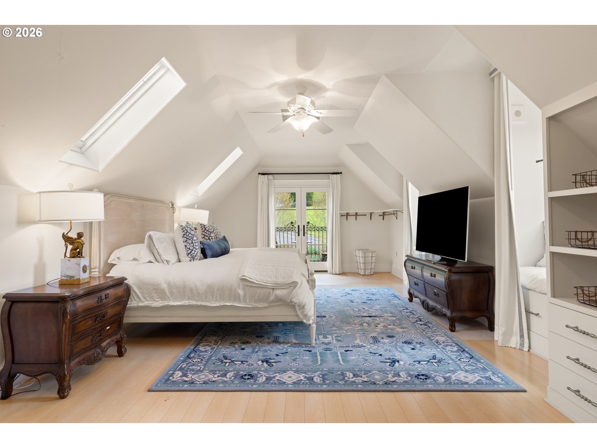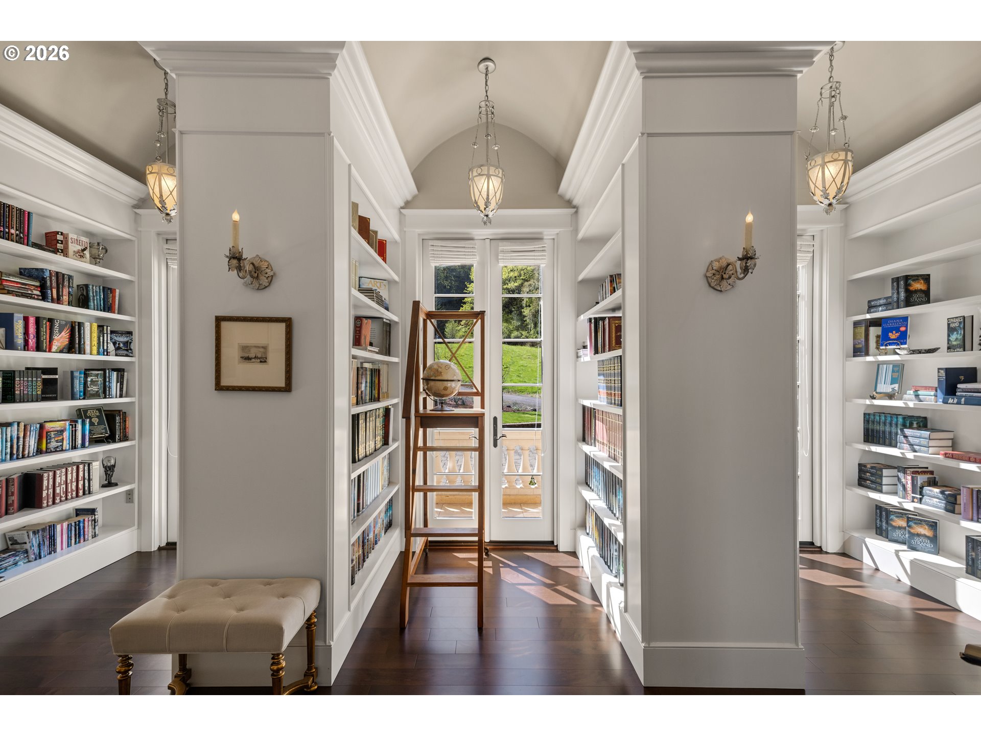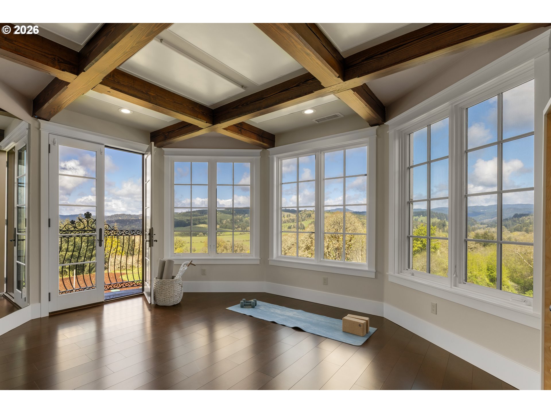 Balcony, BeamedCeilings, Bookcases, Fireplace, HardwoodFloors, Patio