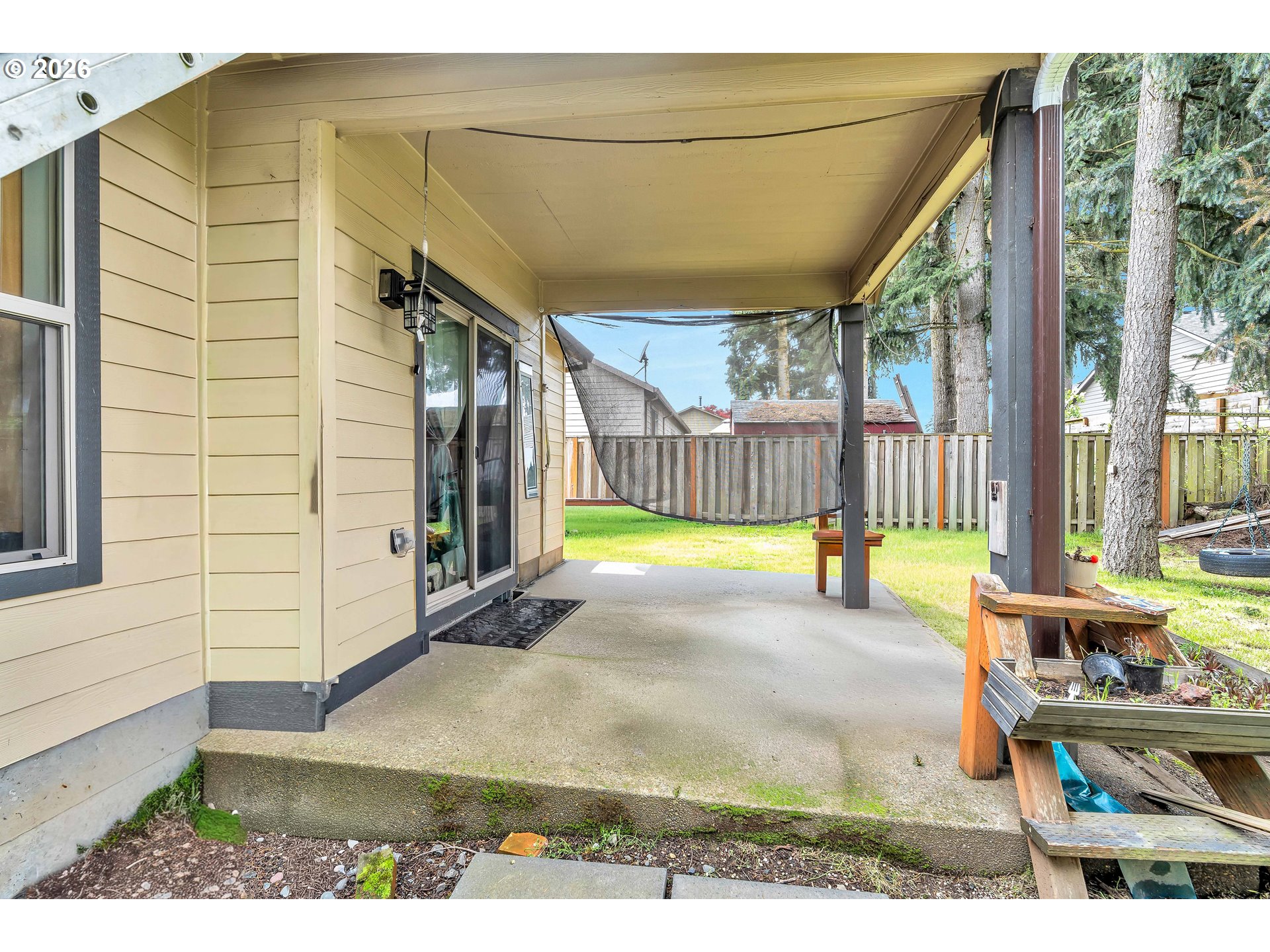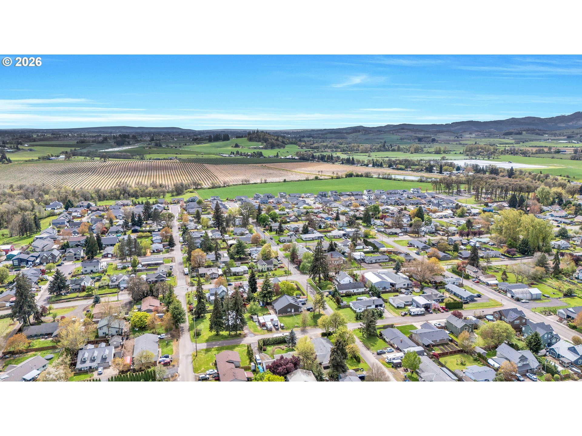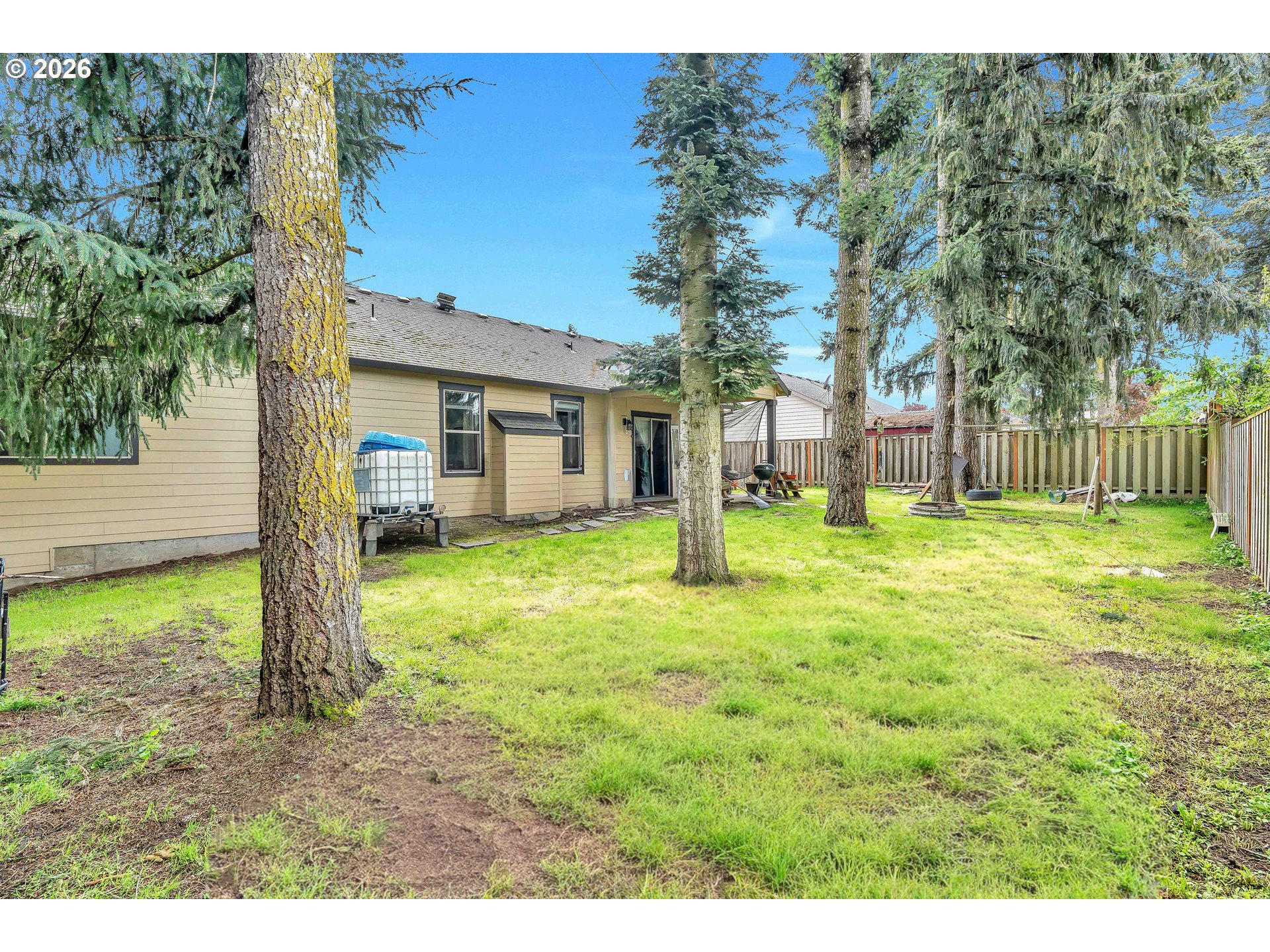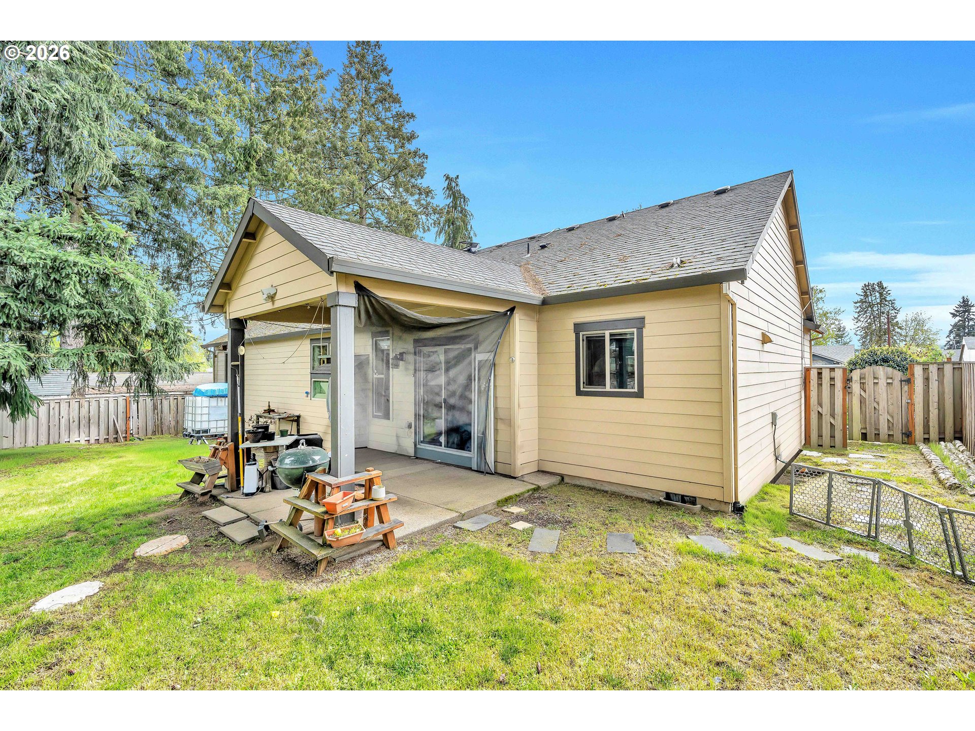 Welcome to this charming single-level home nestled in the heart of Yamhill, where small-town warmth meets the beauty of Oregon wine country. Full of character and thoughtful design, this home offers a bright, inviting layout with hardwood floors flowing through the living and dining areas, creating a warm and timeless feel.The spacious living room is a true centerpiece, featuring soaring vaulted ceilings, abundant natural light, and a cozy fireplace that makes the space feel both open and comfortable. The dining area is perfectly positioned with sliding doors that lead to the backyard, creating an effortless indoor-outdoor connection—ideal for entertaining or enjoying quiet evenings at home.The primary suite continues the airy feel with its own vaulted ceilings and ceiling fan, along with a private ensuite bathroom complete with double sinks and a walk-in shower.Step outside to a generously sized, fully fenced yard shaded by mature, beautiful trees—offering privacy, space to play or garden, and a peaceful setting to unwind. A covered patio extends your living space outdoors, making it easy to enjoy the outdoors year-round.Located in a quiet, welcoming community known for its rolling farmland and proximity to renowned vineyards, this home offers the perfect balance of tranquility and convenience—all just a short drive to the charm of downtown Yamhill and surrounding wine country destinations.A rare opportunity to own a home that blends comfort, character, and the relaxed lifestyle of Oregon’s countryside.