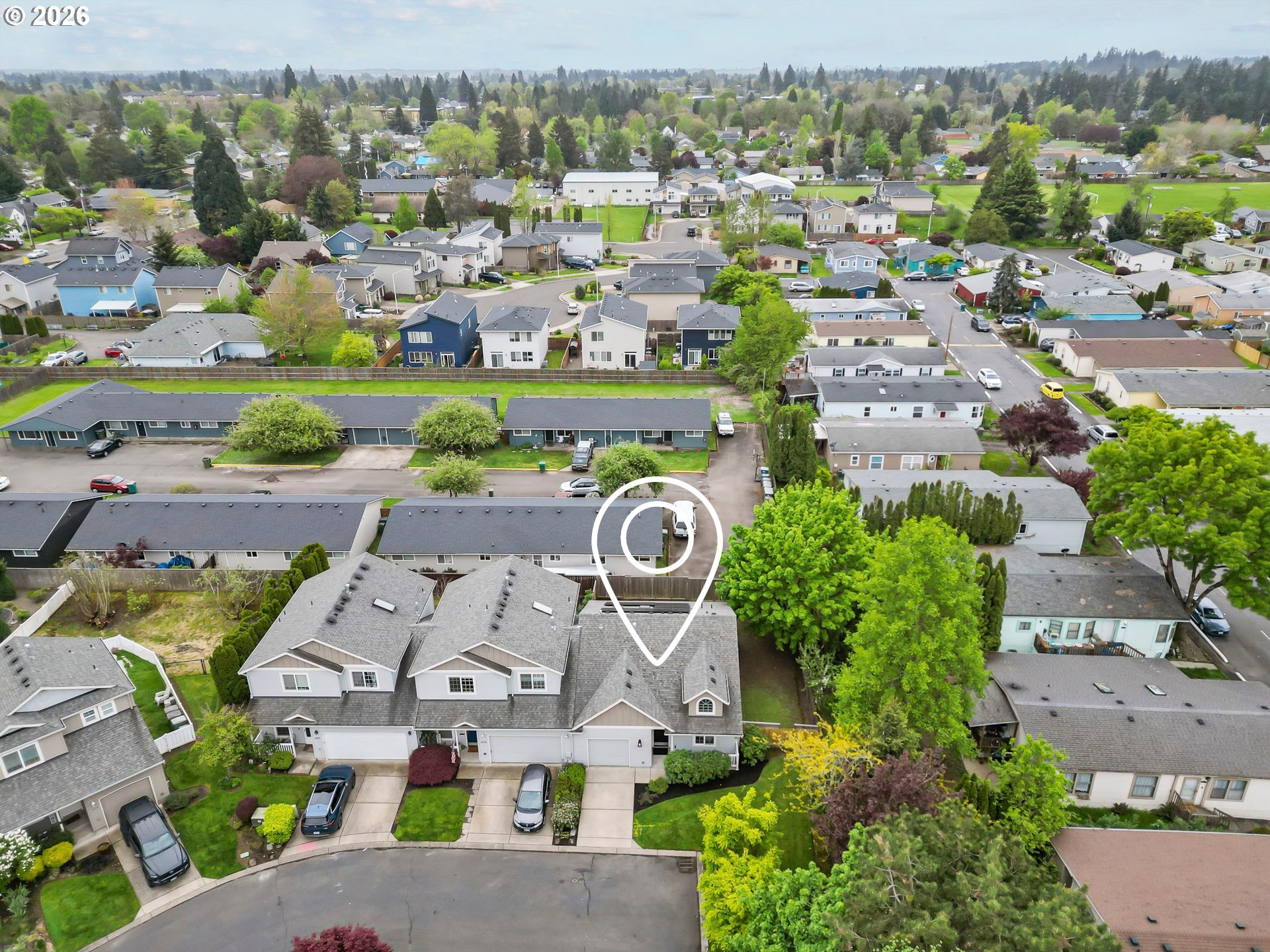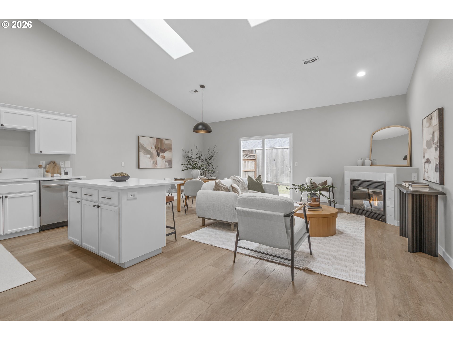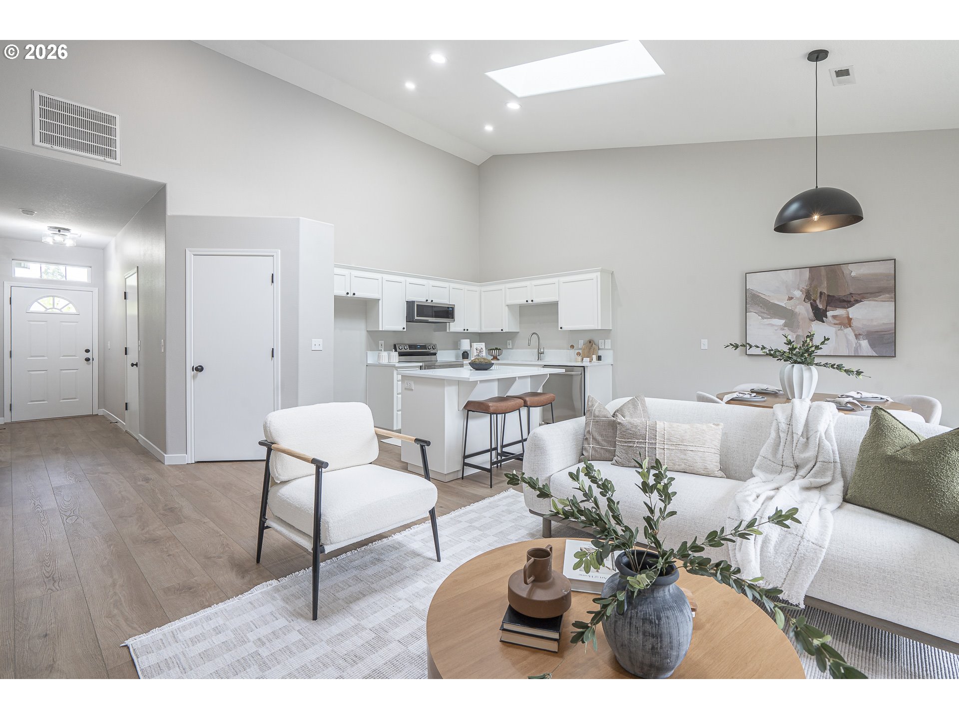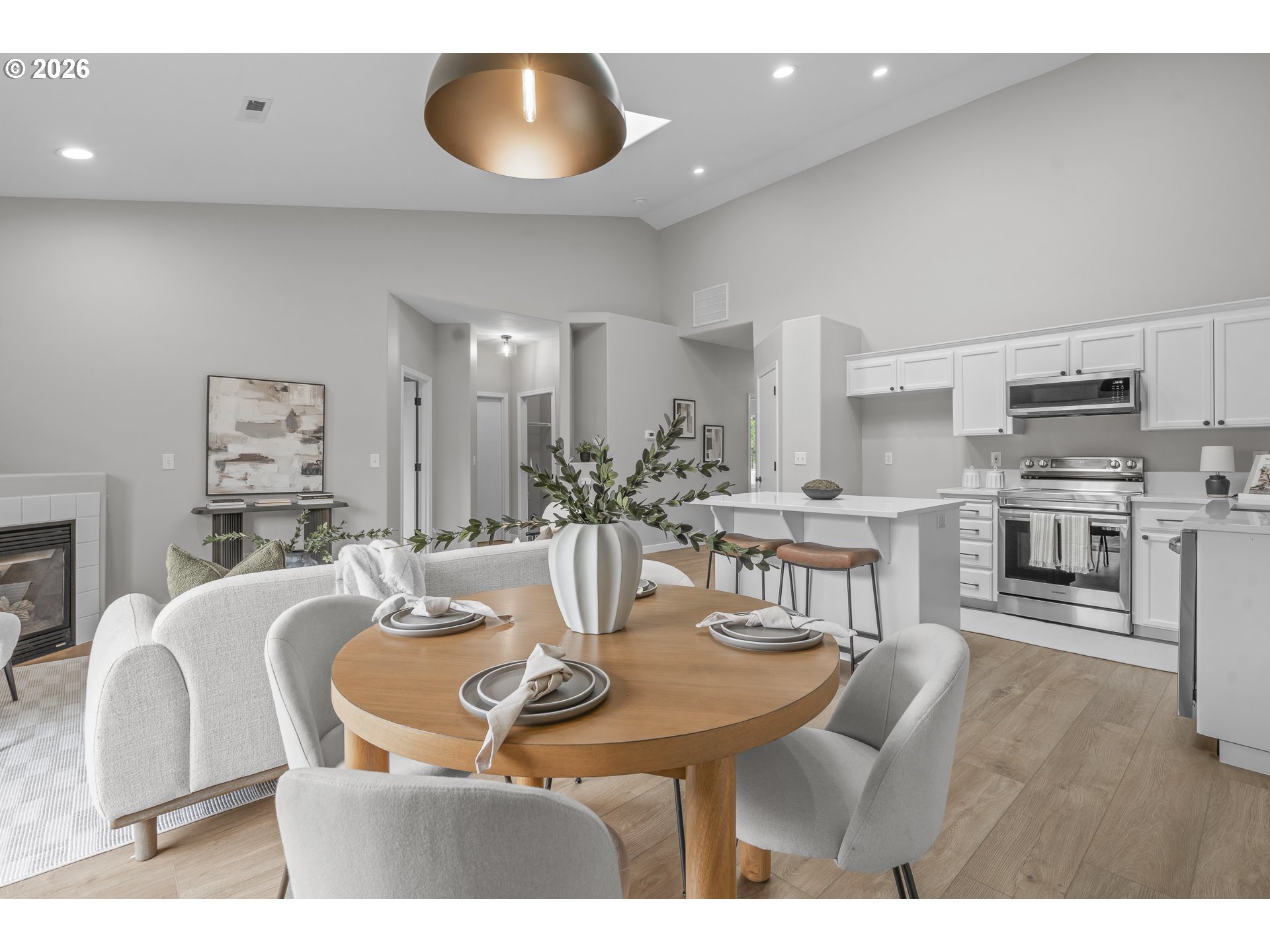 Beautifully renovated single-level end-unit townhome in desirable North Newberg, offering modern updates, energy efficiency, and low-maintenance living. This move-in-ready home features an open floor-plan with vaulted ceilings, creating a bright and spacious interior that lives larger than its footprint. The home has quality updates throughout with quartz surfaces, luxury vinyl plank flooring, new carpet, fresh interior paint, hardware, light fixtures and all-new sinks and toilets. The kitchen shines with new stainless steel appliances, complementing the clean, contemporary design. Abundant natural light enhances the home’s warm and inviting feel. Energy efficiency is a standout, thanks to paid-off solar panels with net metering, significantly reducing monthly electric costs. Major systems are in excellent condition, including a new HVAC and AC installed in late 2021. The HOA provides extensive exterior maintenance — covering the roof, gutters, exterior paint, front-yard landscaping, common-area care, insurance, and management — making this an ideal option for those seeking a low-maintenance lifestyle. Located close to schools, parks, downtown Newberg shops and dining, the Chehalem Valley Aquatic Center, George Fox University and the award winning Allison Inn & Spa, this home offers both comfort and convenience in a highly desirable community. Check out this like-new beauty!