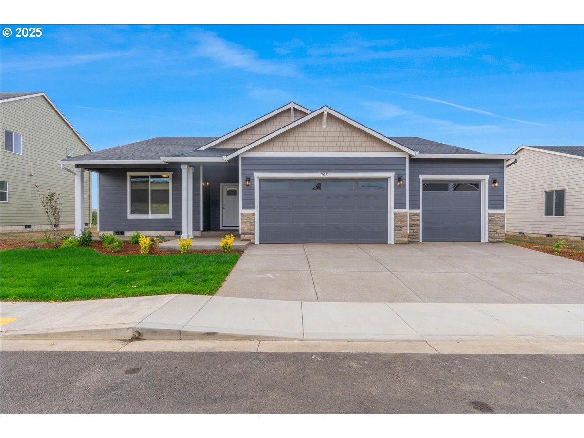 New Chad E Davis Construction home. Large one level with 4 bedrooms and 3 -car garage. Great room with fireplace and 9ft ceilings with vaults. Well appointed kitchen with quartz countertops, ss appliances and full tiled backsplash. Vaulted primary suite with walk in closet and full bath with soaking tub. Front landscaping with irrigation included. Taxes TBD.