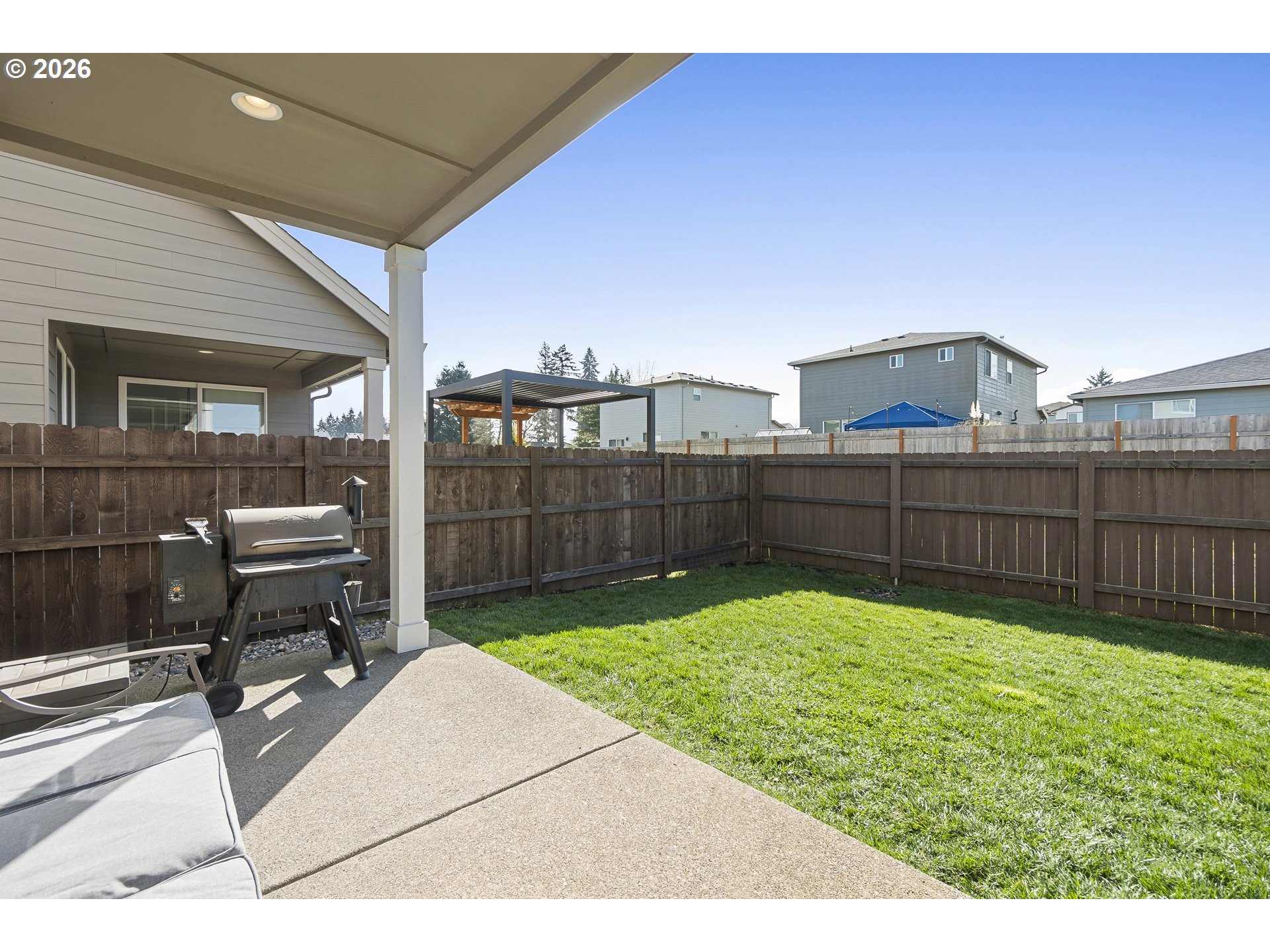 ExteriorCoveredPatio, Fenced, Porch, Sprinkler, ToolShed, Yard
