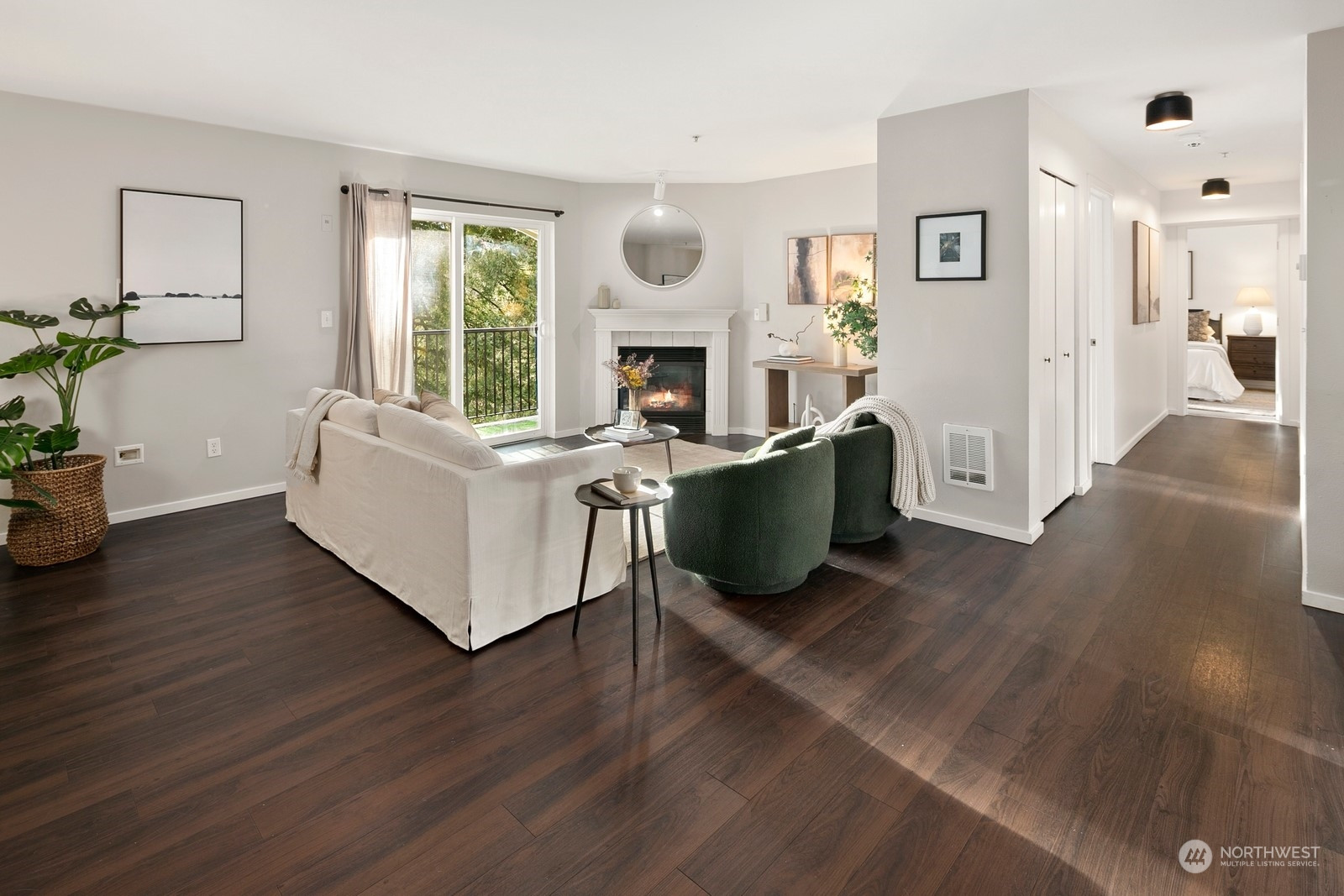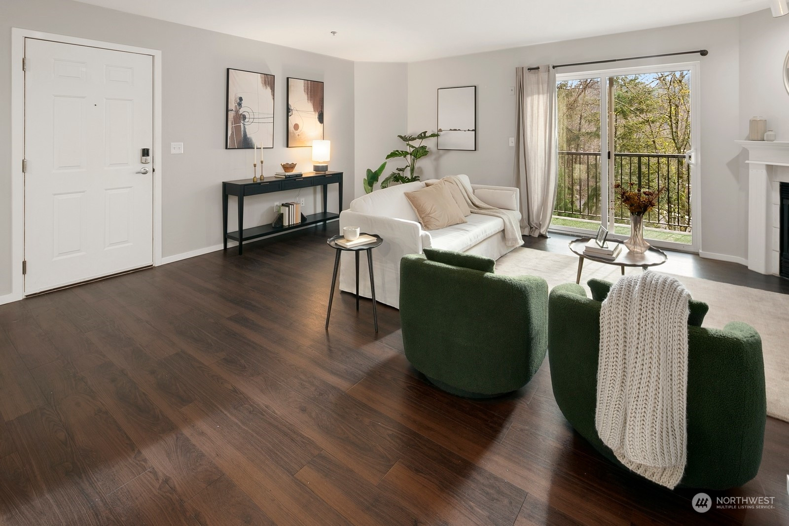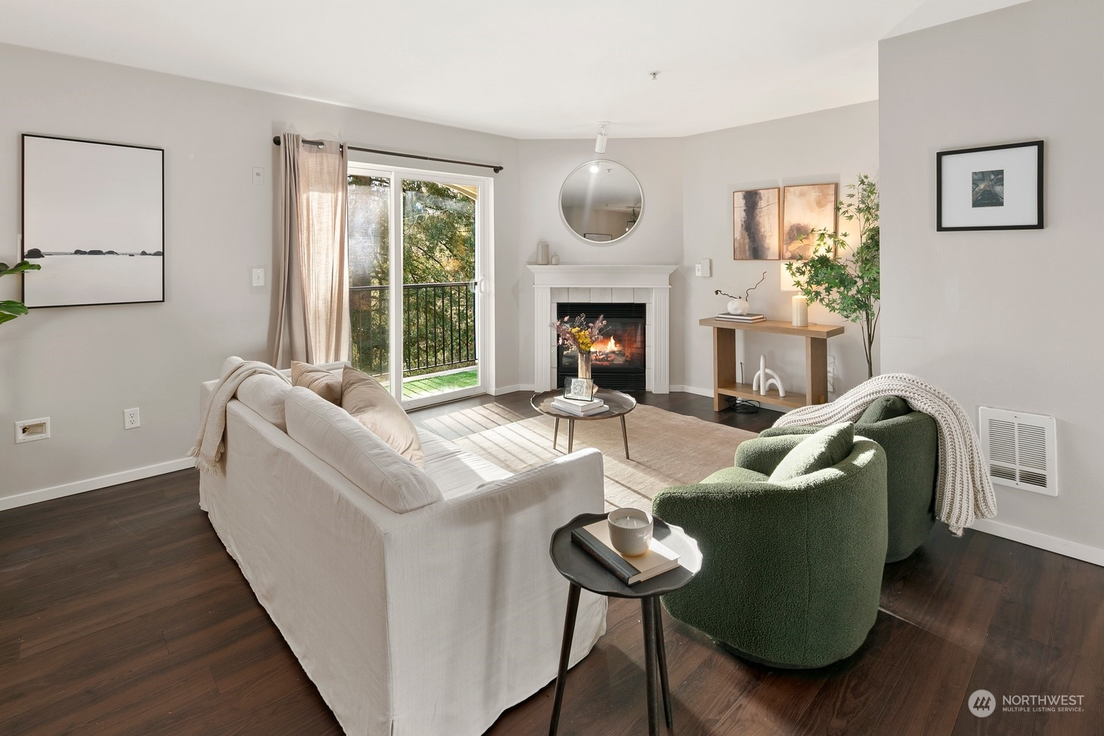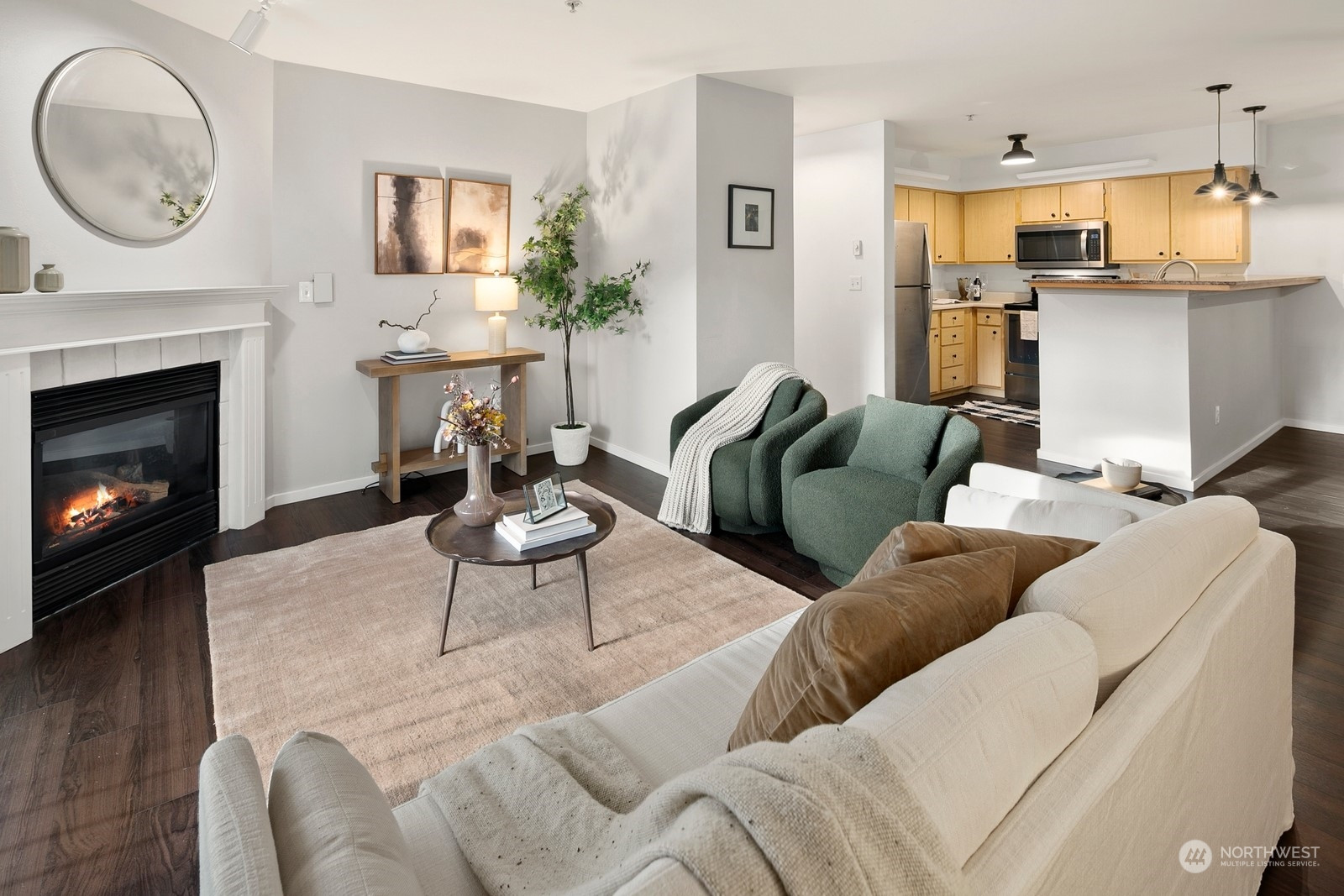 An array of incredible restaurants, shops & UW Bothell are just steps from your front door in this 2 bed/2 bath Downtown Bothell home! With a high walk score & transit access, a car is optional but reserved parking for 3 cars (including your own PRIVATE GARAGE) is a fabulous perk. Engineered hardwoods stretch through the open concept living room/dining room & kitchen, opening to a covered balcony overlooking a lush tapestry of greenery. A spacious primary suite boasts a walk-in closet, en-suite with full bath & territorial views. Large 2nd bedroom is the perfect guest suite or home office. Pets are welcomed & will enjoy the beautifully landscaped grounds. No rental cap, strong HOA & meticulously maintained property. Welcome Home!
