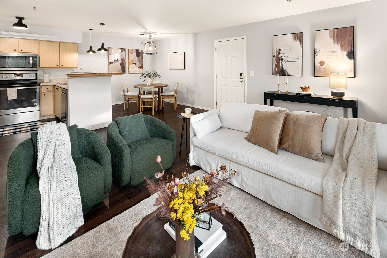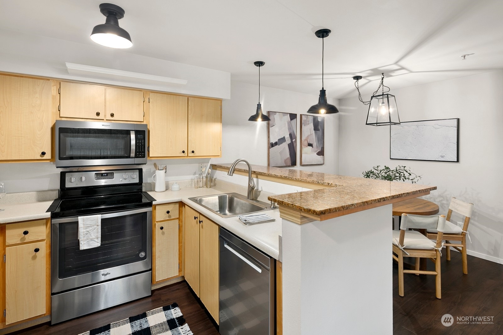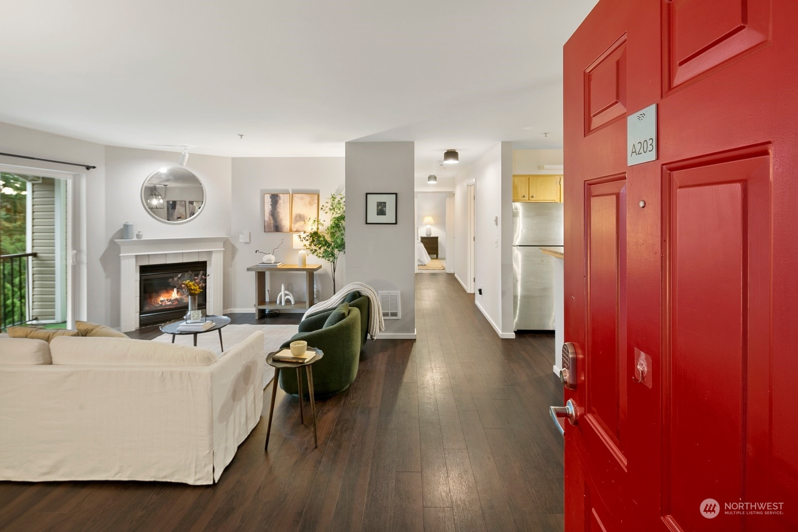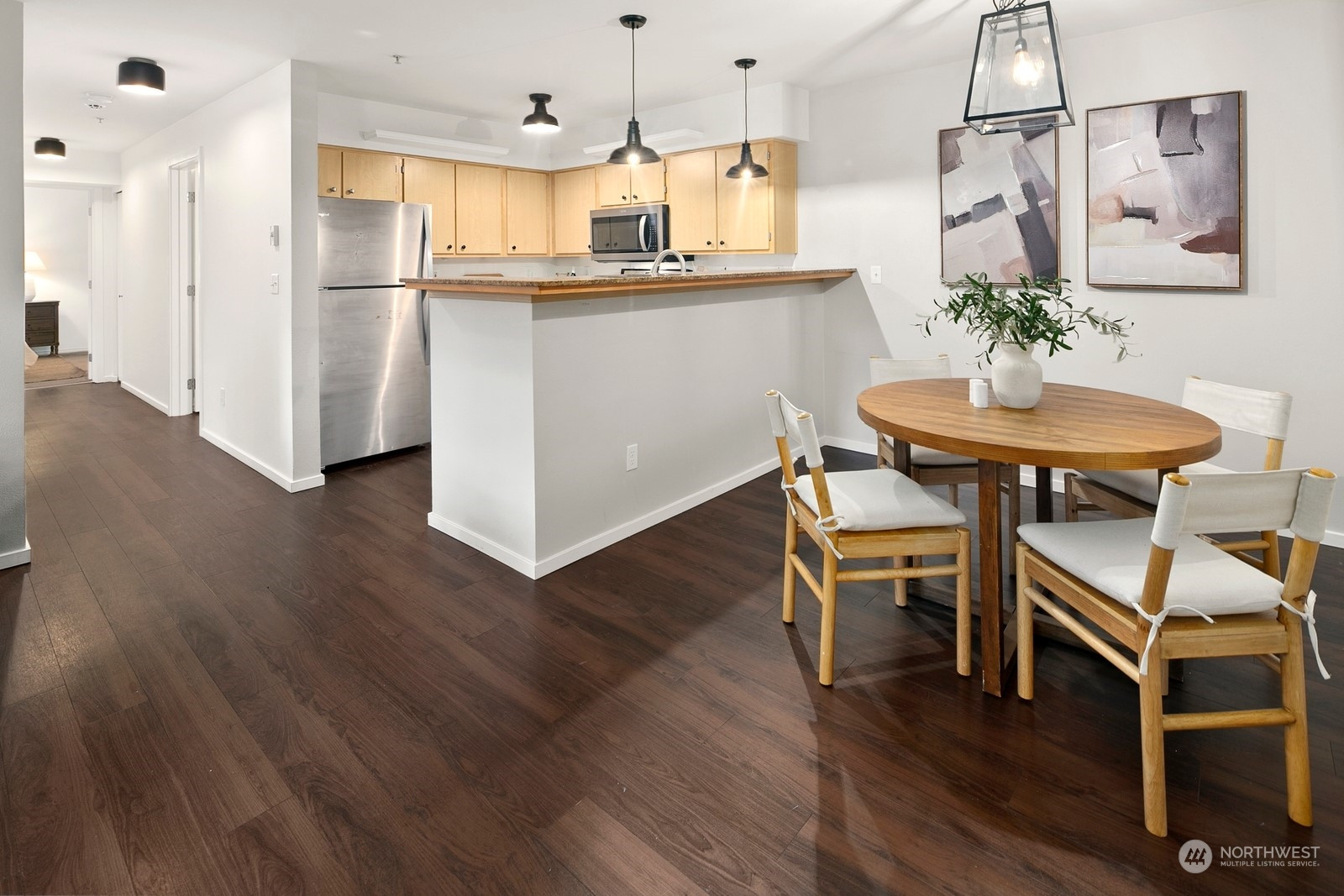 An array of incredible restaurants, shops & UW Bothell are just steps from your front door in this 2 bed/2 bath Downtown Bothell home! With a high walk score & transit access, a car is optional but reserved parking for 3 cars (including your own PRIVATE GARAGE) is a fabulous perk. Engineered hardwoods stretch through the open concept living room/dining room & kitchen, opening to a covered balcony overlooking a lush tapestry of greenery. A spacious primary suite boasts a walk-in closet, en-suite with full bath & territorial views. Large 2nd bedroom is the perfect guest suite or home office. Pets are welcomed & will enjoy the beautifully landscaped grounds. No rental cap, strong HOA & meticulously maintained property. Welcome Home!