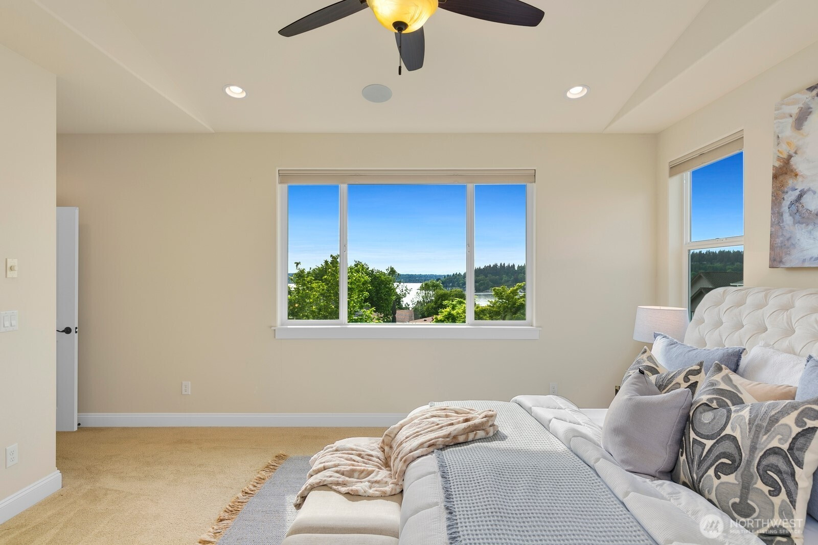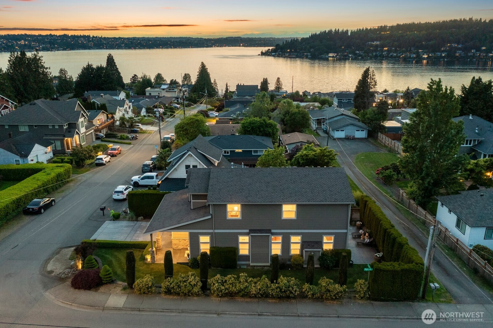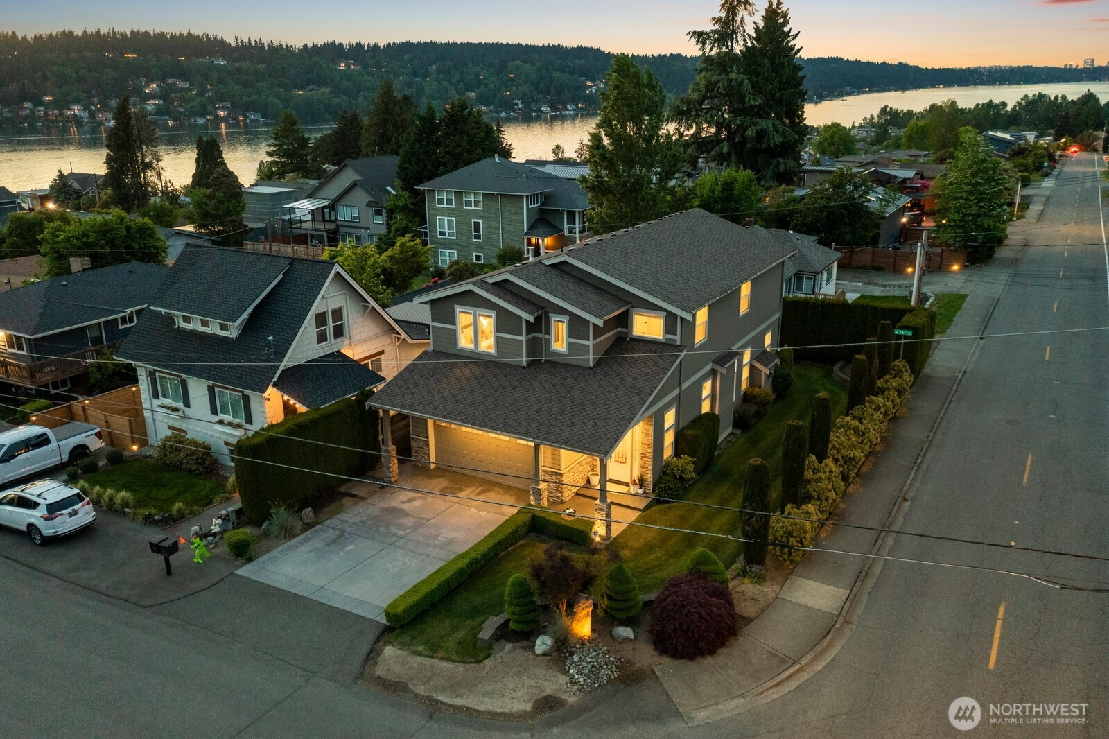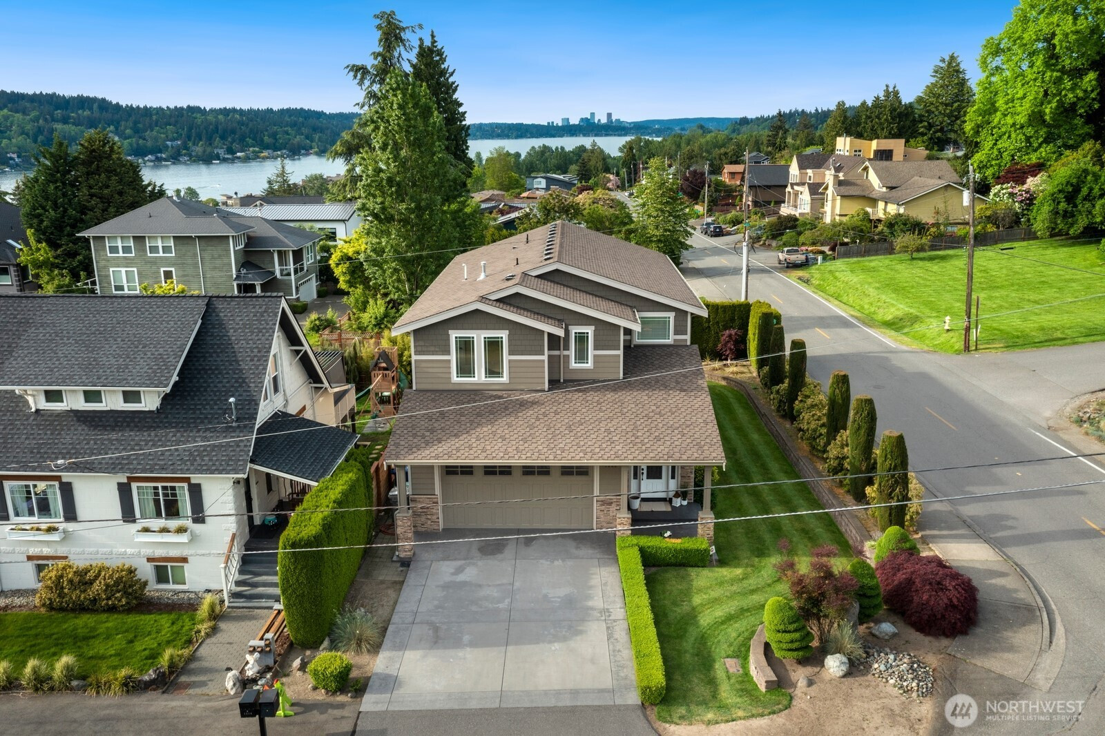 Experience unparalleled views of Lake Washington & the Olympic Mountains from this custom-built Lower Kennydale gem! This 4-bed, 2.5-bath home boasts a luxurious master suite with an oversized soaking tub, whole-house audio, and a durable 50-year presidential roof. Stay comfortable year-round with a heat pump for the summertime heat. The professionally landscaped yard features in-ground irrigation & mature foliage. A 2+ car garage with tandem bay offers plenty of storage space. The wet bar is perfect for entertaining. The gourmet kitchen features GE Monogram appliances and a dual-fuel range. Enjoy easy access to 405 for a quick commute to Bellevue, Seattle, and the airport. The perfect neighborhood to call home!