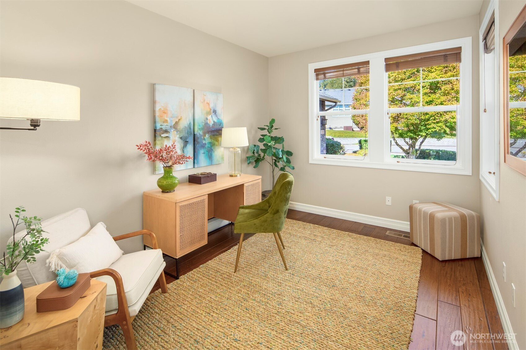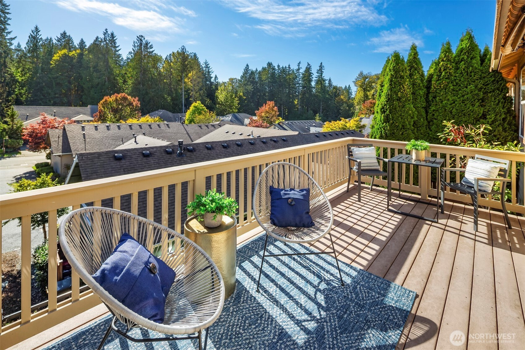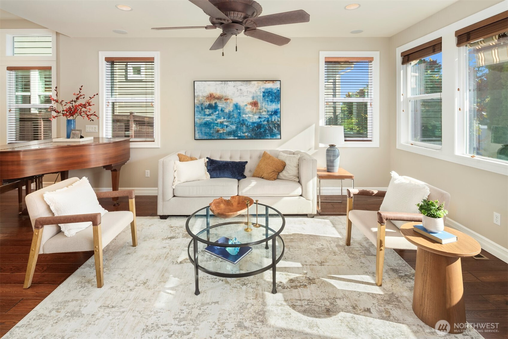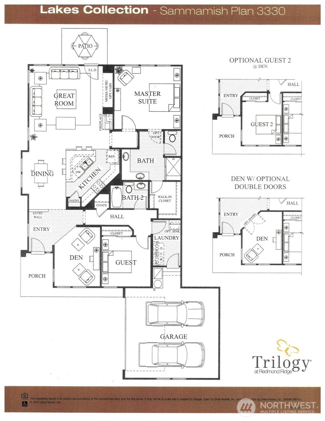 West-facing “Sammamish Plan” with tranquil forest outlook and abundant natural light. Open living, kitchen, and dining areas feature hardwood floors and open to a deck with electric awning for year-round enjoyment. Gourmet kitchen boasts GE Monogram appliances, slab granite counters, pantry, and ample storage. Primary suite includes dual vanities, walk-in closet, step-in shower, water closet, and linen storage. Flexible den/office near entry, guest bedroom, and full bath lead to a laundry with sink and cabinets plus a two-car garage with built-in storage. Air conditioning and pre-inspection complete the package. Age-restricted: one resident must be 53+.