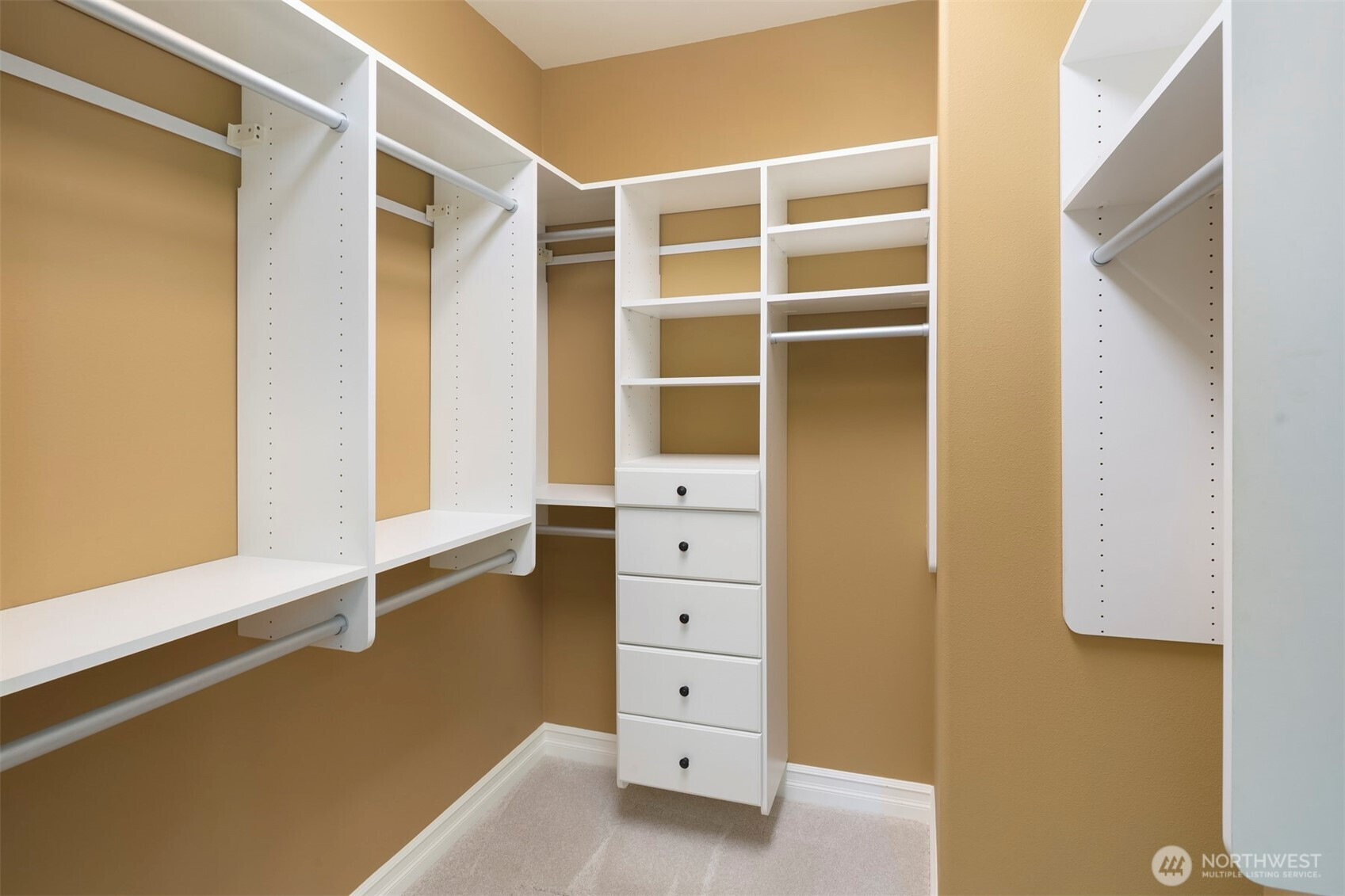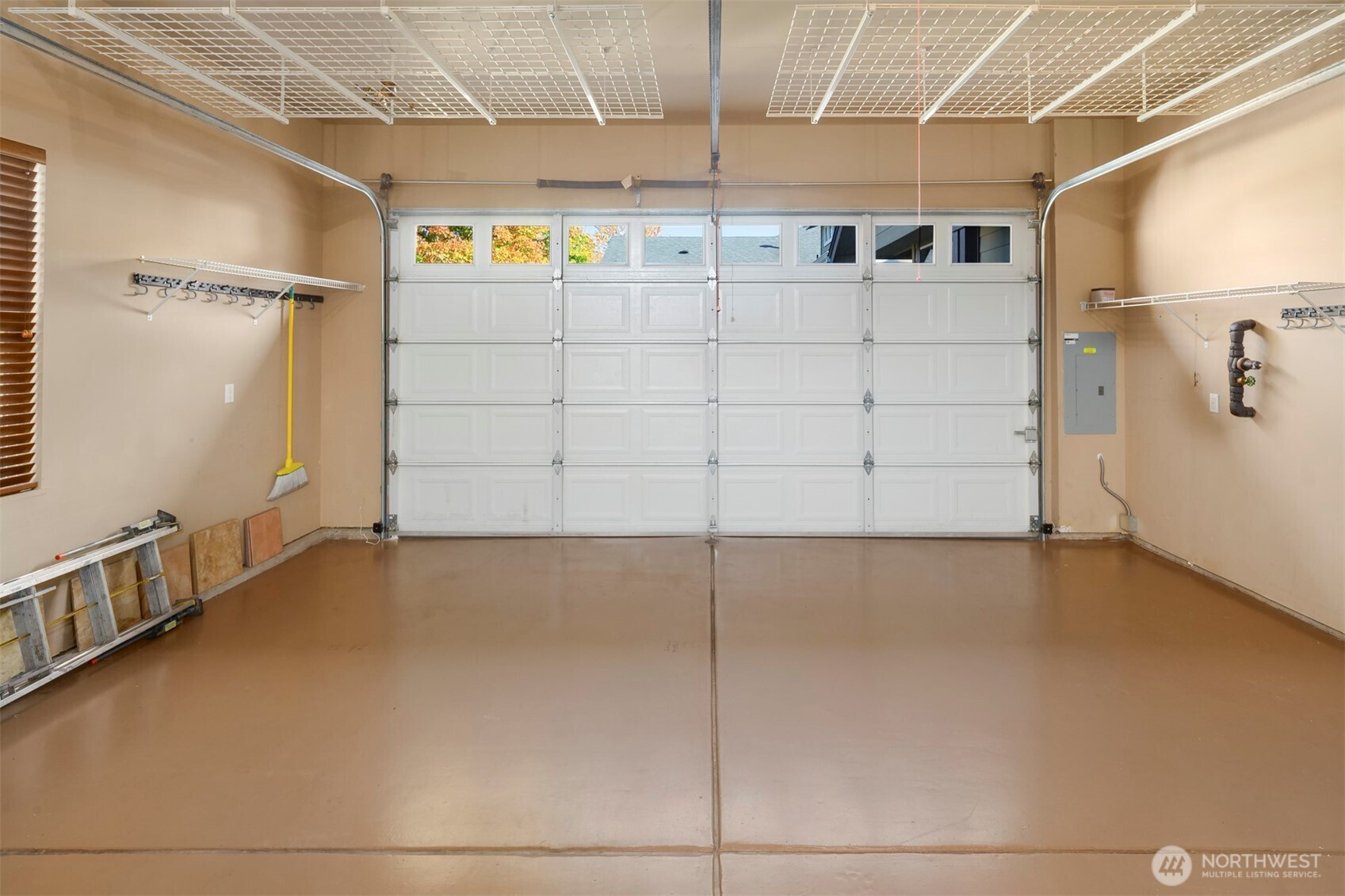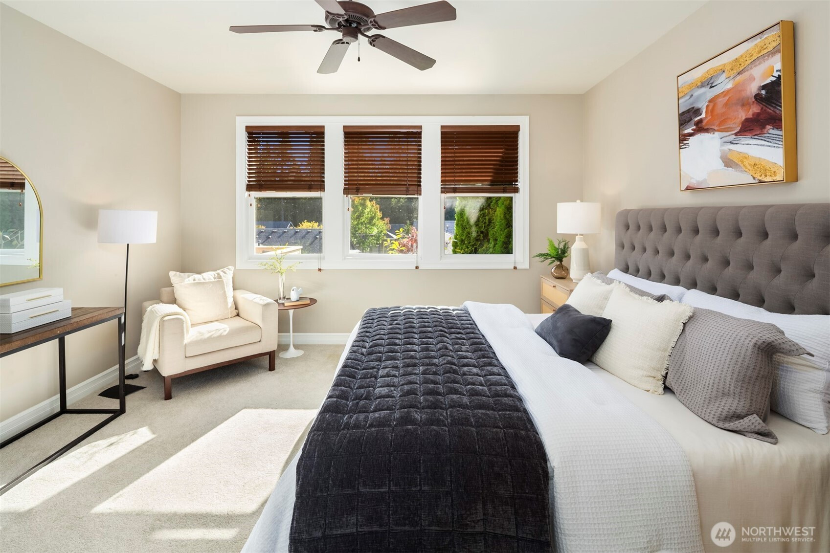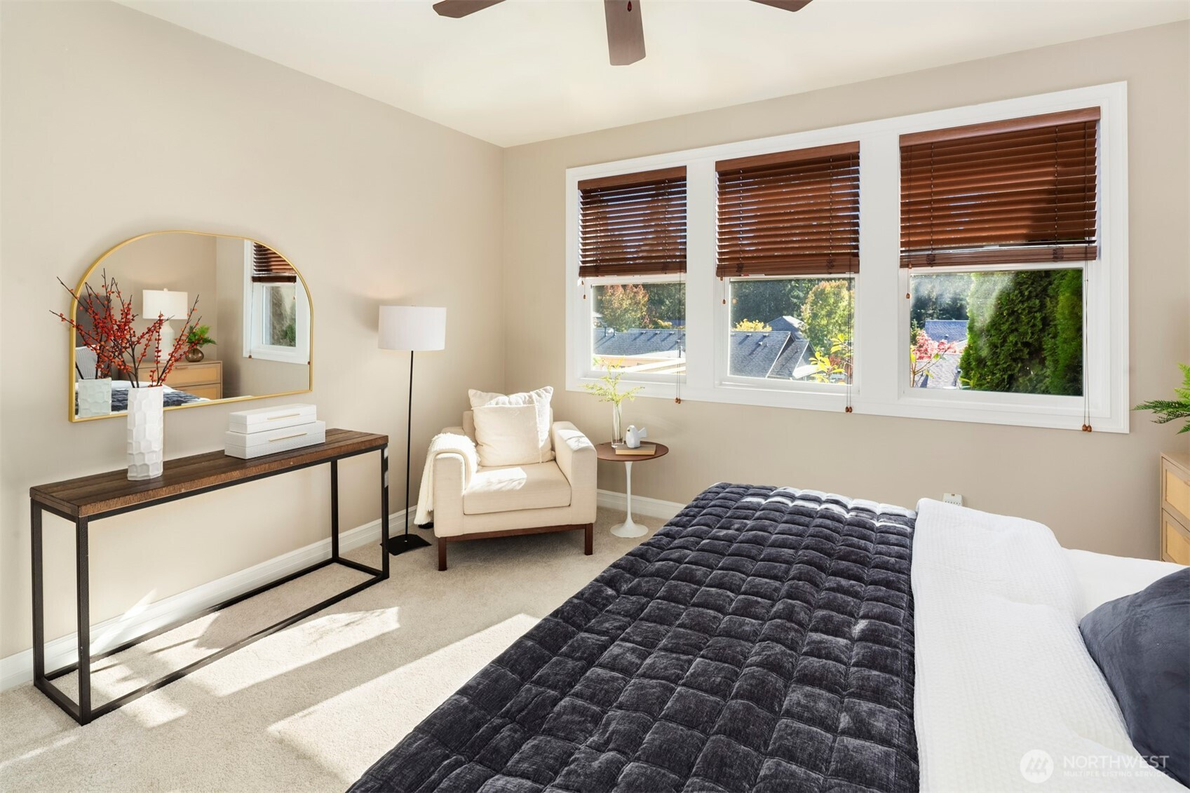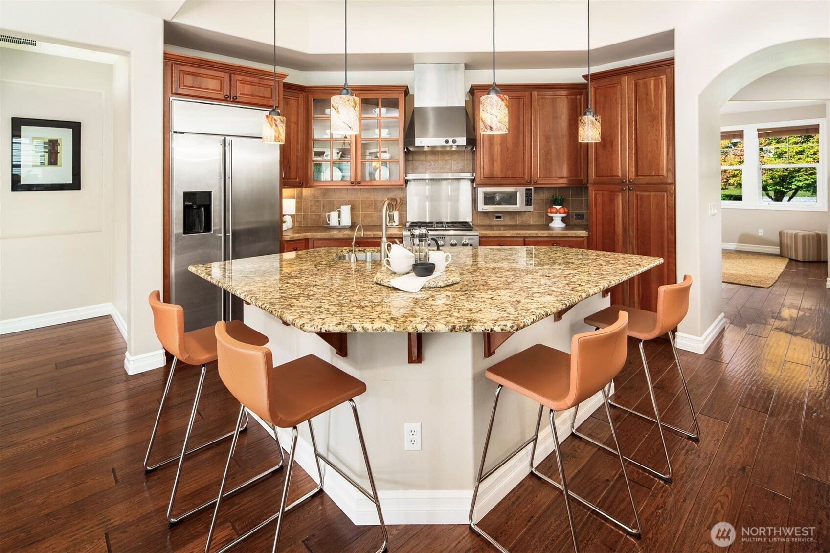 West-facing “Sammamish Plan” with tranquil forest outlook and abundant natural light. Open living, kitchen, and dining areas feature hardwood floors and open to a deck with electric awning for year-round enjoyment. Gourmet kitchen boasts GE Monogram appliances, slab granite counters, pantry, and ample storage. Primary suite includes dual vanities, walk-in closet, step-in shower, water closet, and linen storage. Flexible den/office near entry, guest bedroom, and full bath lead to a laundry with sink and cabinets plus a two-car garage with built-in storage. Air conditioning and pre-inspection complete the package. Age-restricted: one resident must be 53+.