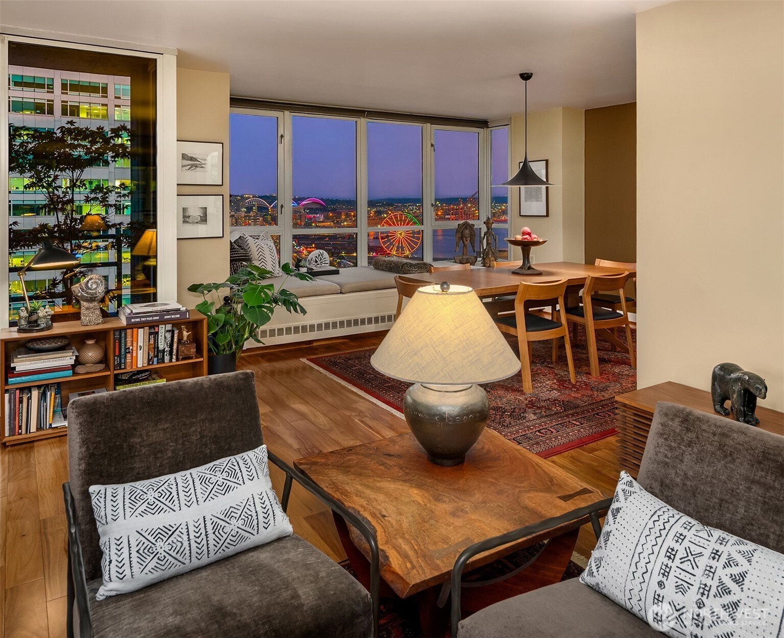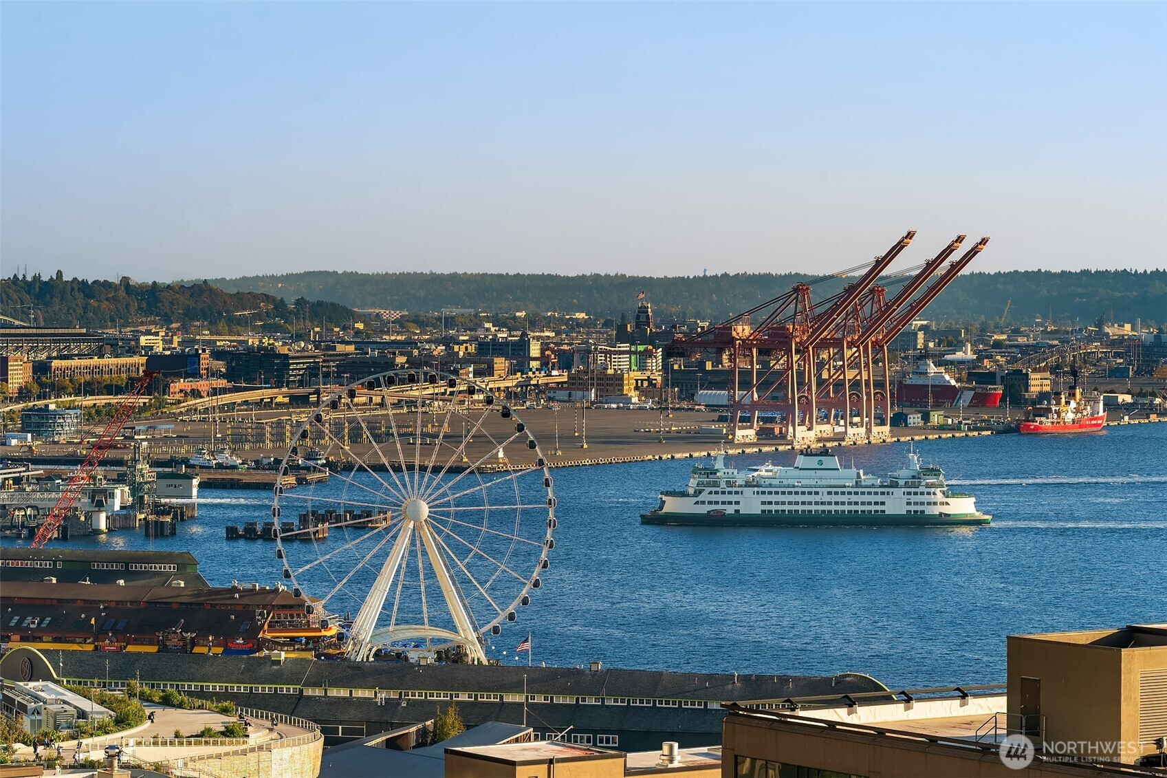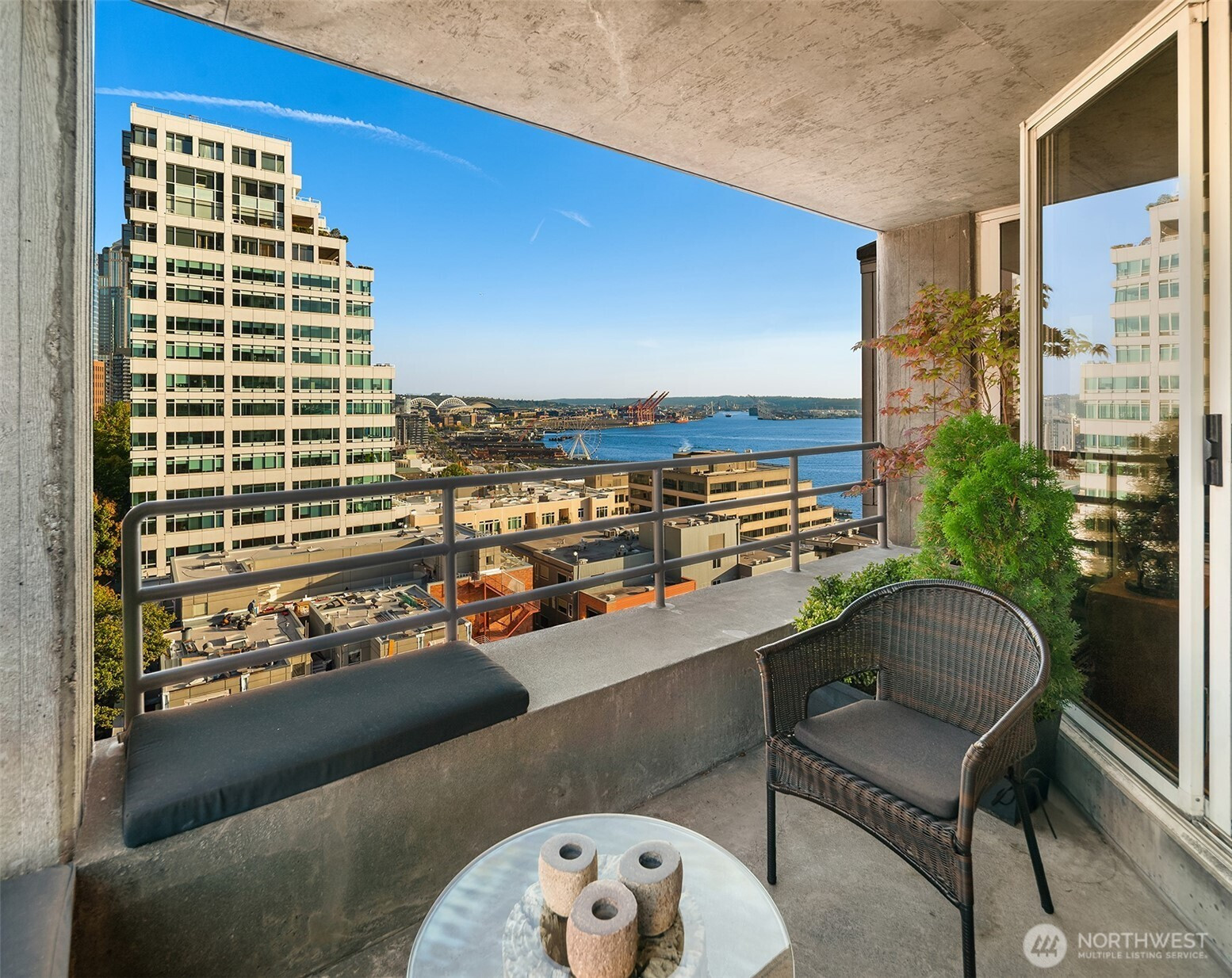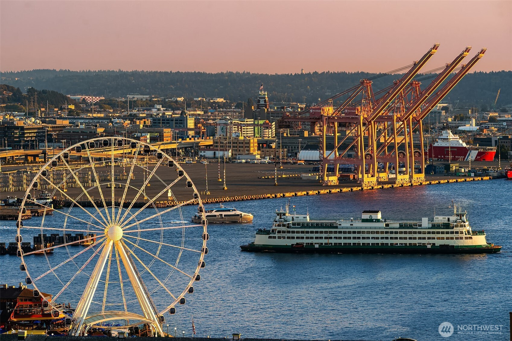 Impeccably renovated 2-bedroom / 2-bath unit at Continental Place features a neutral Northwest Contemporary Palette, with wrap-around views from the Space Needle to Mt. Rainier, the Ferris Wheel, and the ferries. A built-in window seat provides the perfect perch for watching ferries glide along the glistening waters below. A large, covered corner balcony for seating, air-conditioning, 24 hour door-staff, pool, gym, community room, sculpture garden, guest suite, pkg, and storage. Steps to the Pike Place Market, Overlook Walk, and Seattle’s new Waterfront Park.