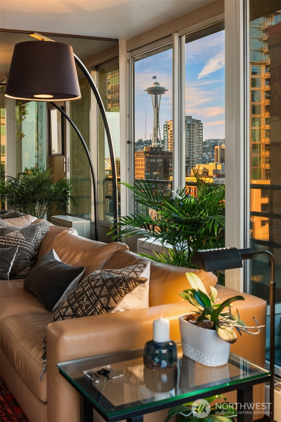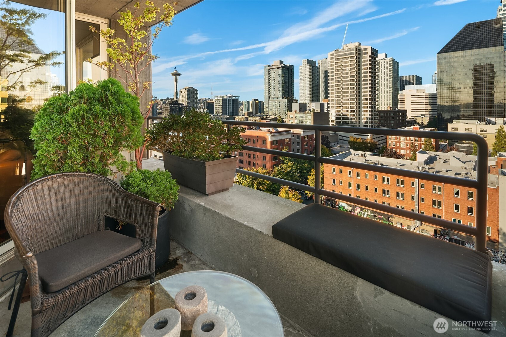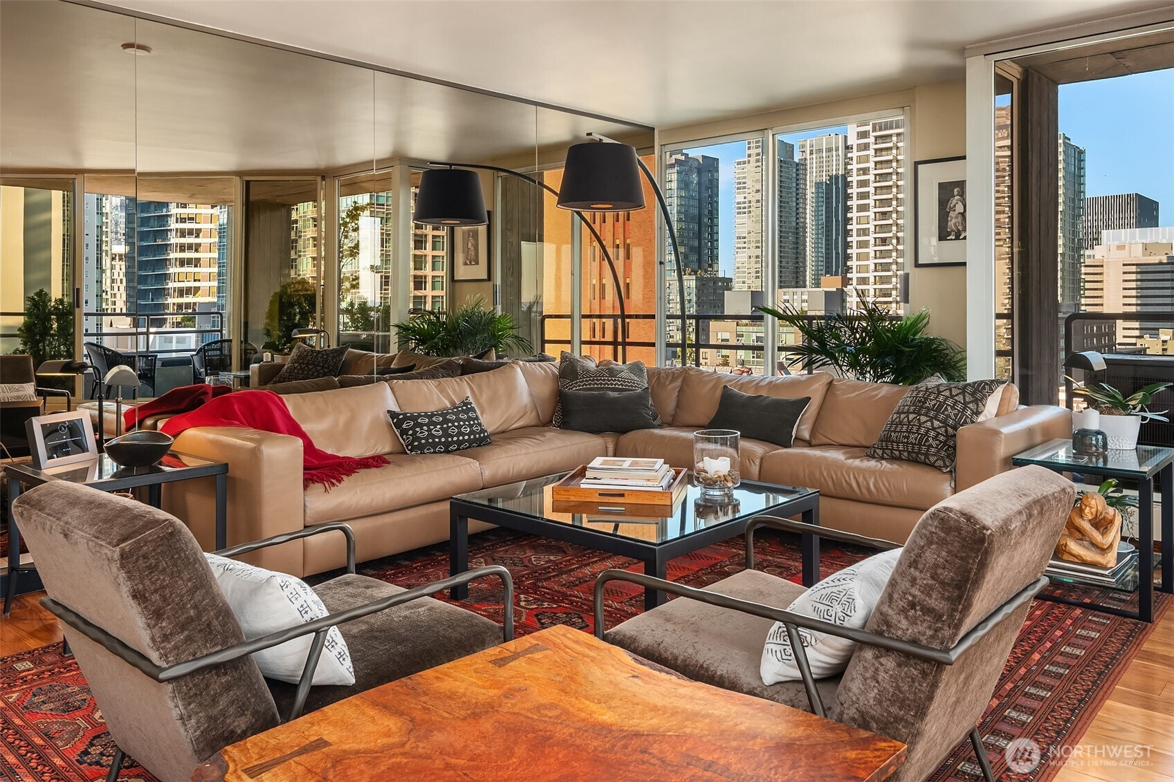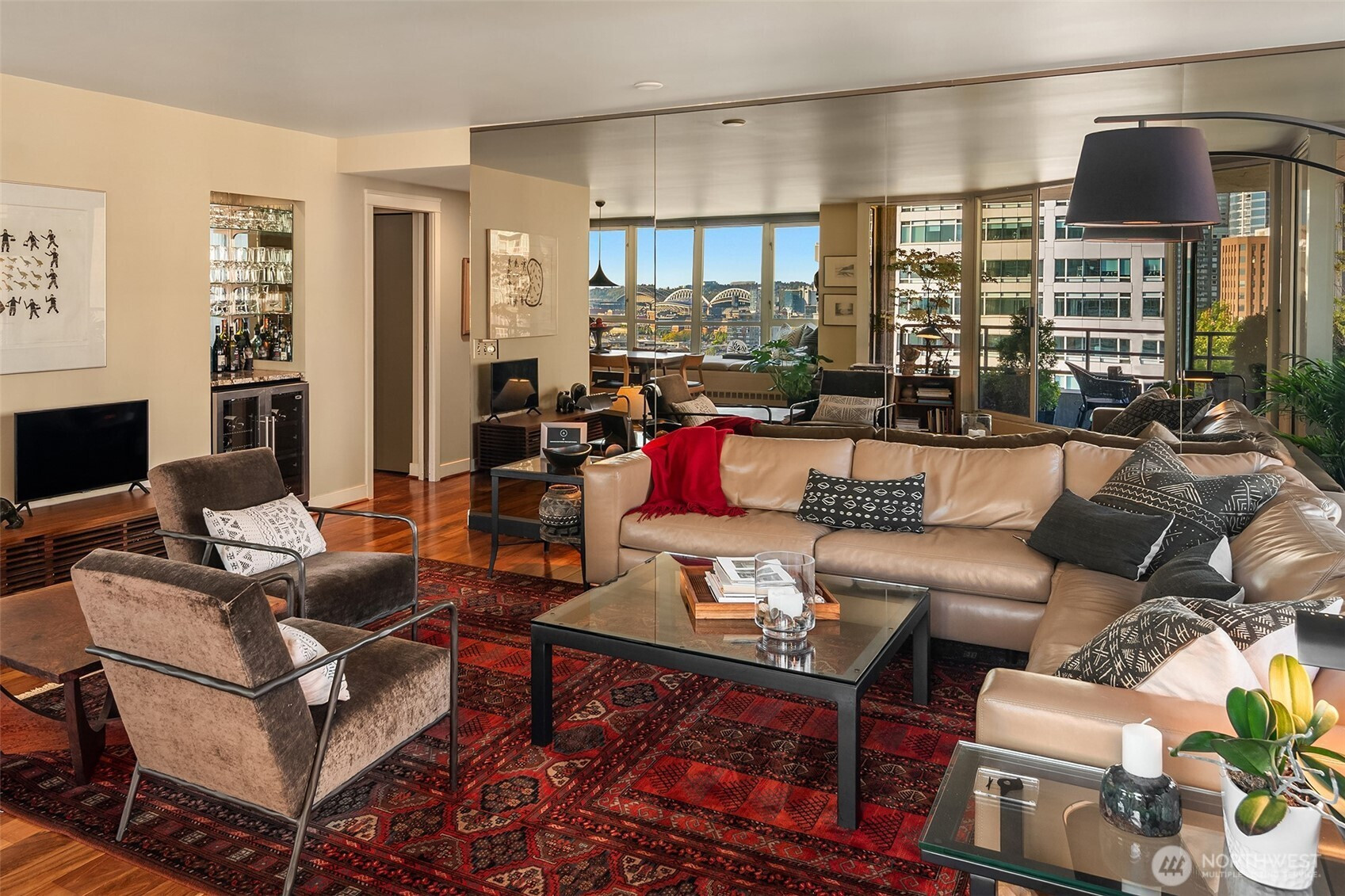 Impeccably renovated 2-bedroom / 2-bath unit at Continental Place features a neutral Northwest Contemporary Palette, with wrap-around views from the Space Needle to Mt. Rainier, the Ferris Wheel, and the ferries. A built-in window seat provides the perfect perch for watching ferries glide along the glistening waters below. A large, covered corner balcony for seating, air-conditioning, 24 hour door-staff, pool, gym, community room, sculpture garden, guest suite, pkg, and storage. Steps to the Pike Place Market, Overlook Walk, and Seattle’s new Waterfront Park.