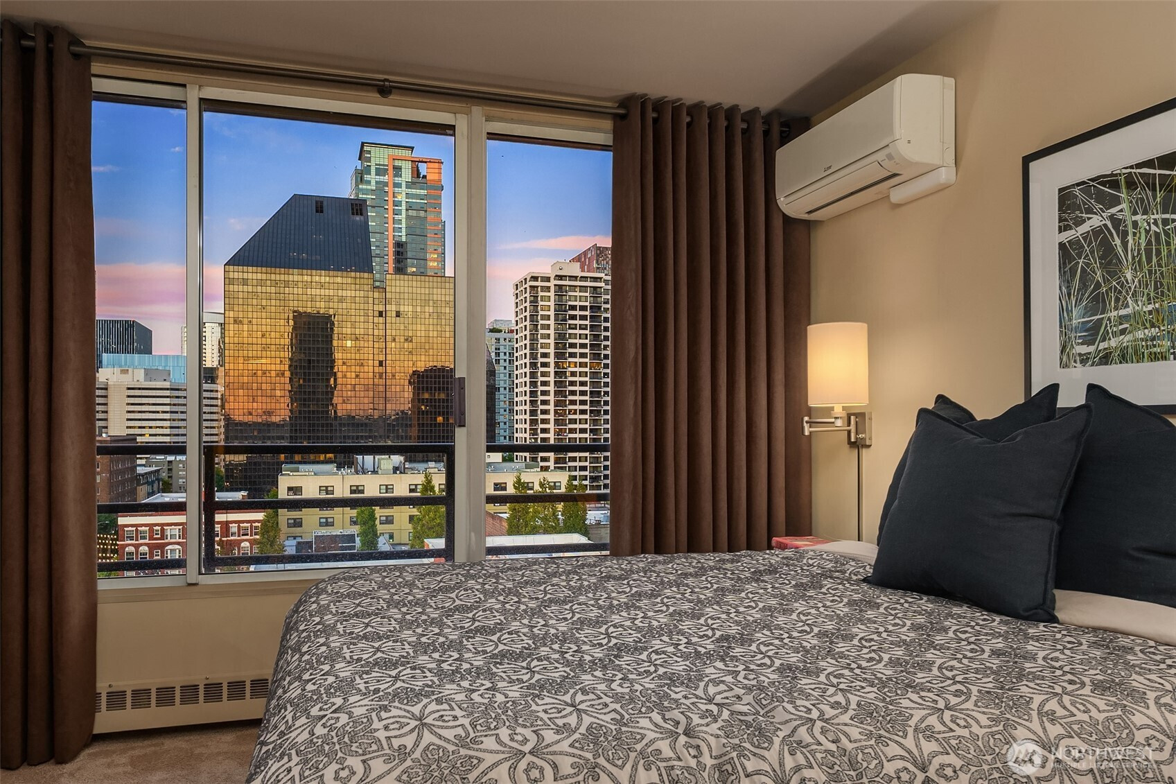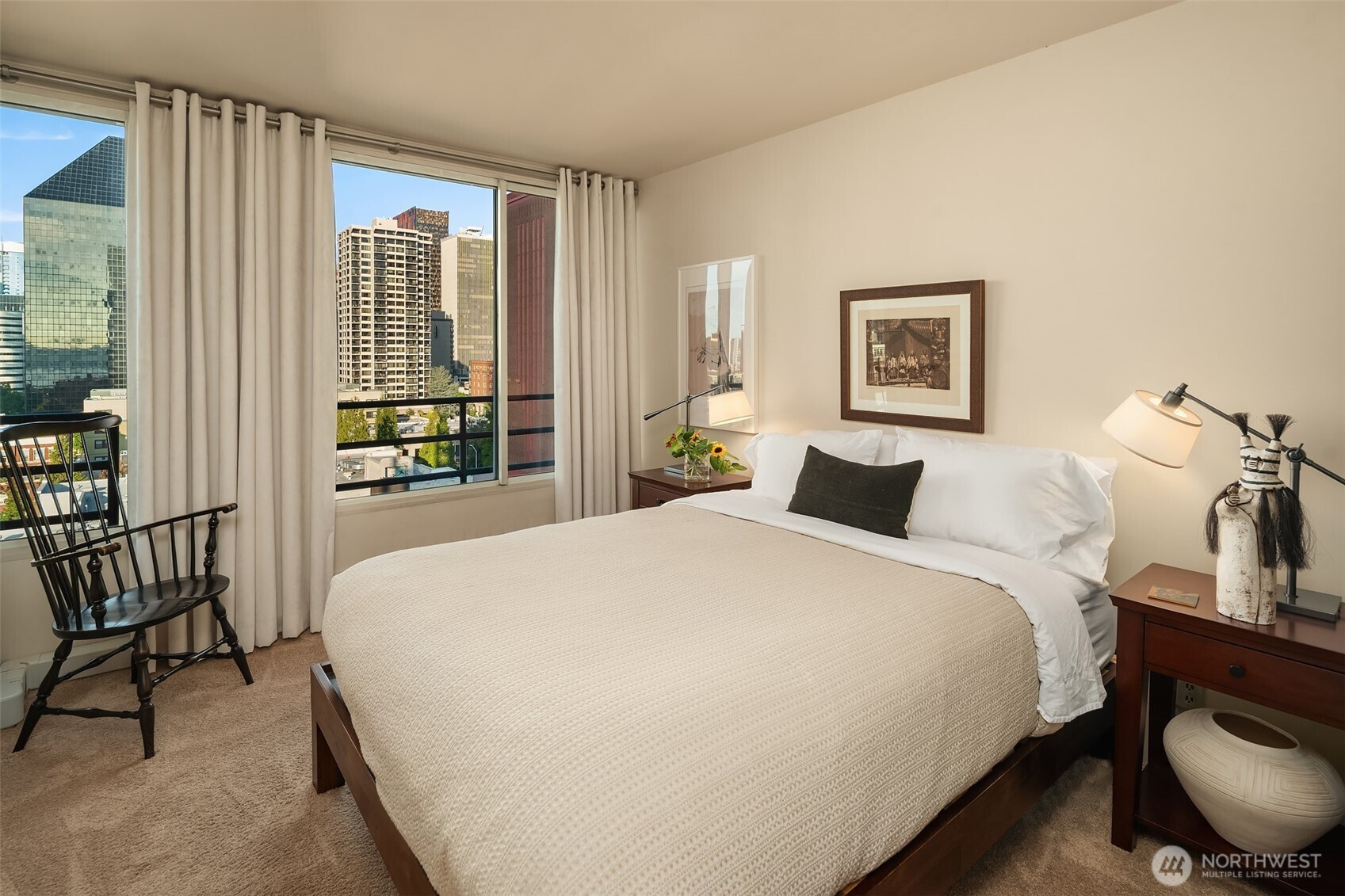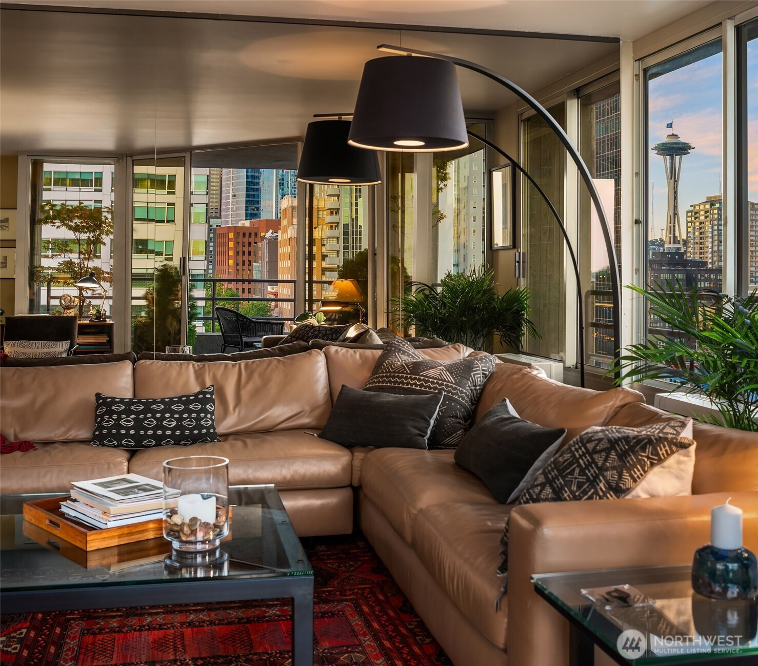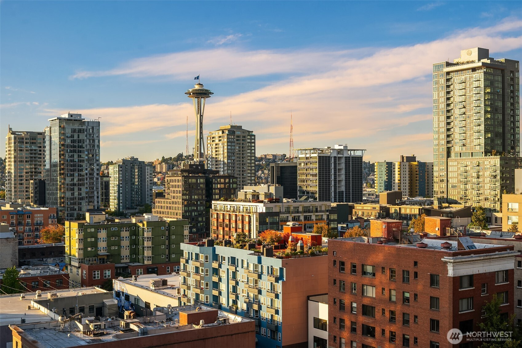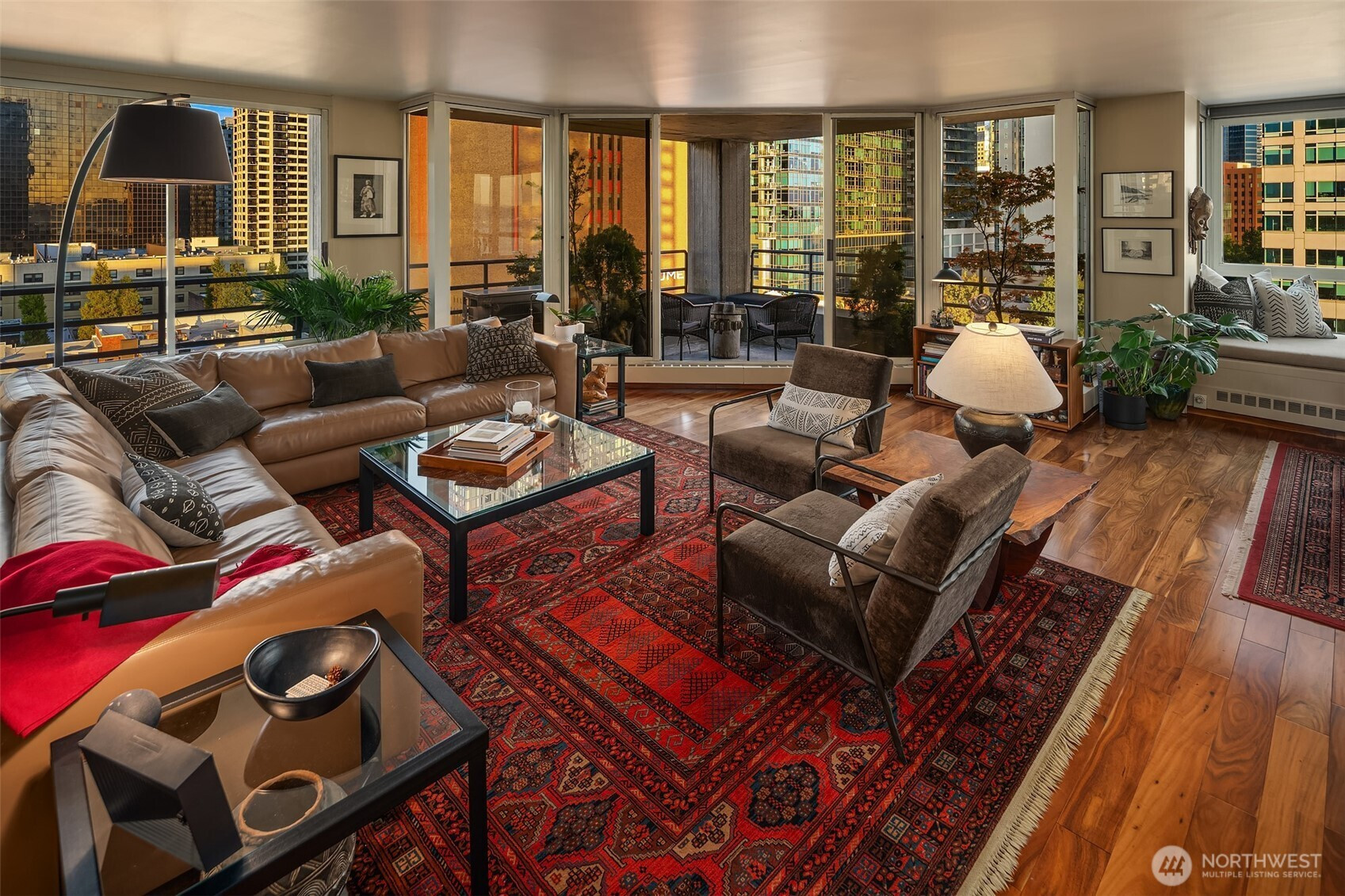 Impeccably renovated 2-bedroom / 2-bath unit at Continental Place features a neutral Northwest Contemporary Palette, with wrap-around views from the Space Needle to Mt. Rainier, the Ferris Wheel, and the ferries. A built-in window seat provides the perfect perch for watching ferries glide along the glistening waters below. A large, covered corner balcony for seating, air-conditioning, 24 hour door-staff, pool, gym, community room, sculpture garden, guest suite, pkg, and storage. Steps to the Pike Place Market, Overlook Walk, and Seattle’s new Waterfront Park.