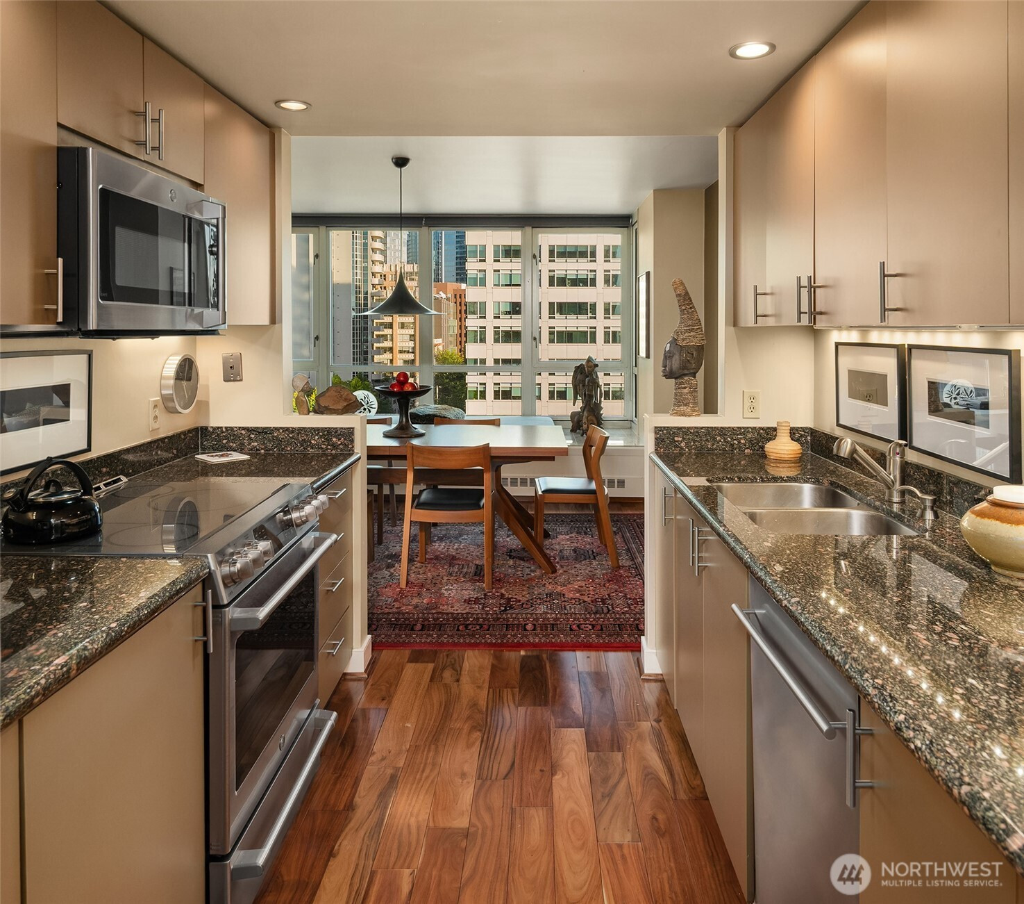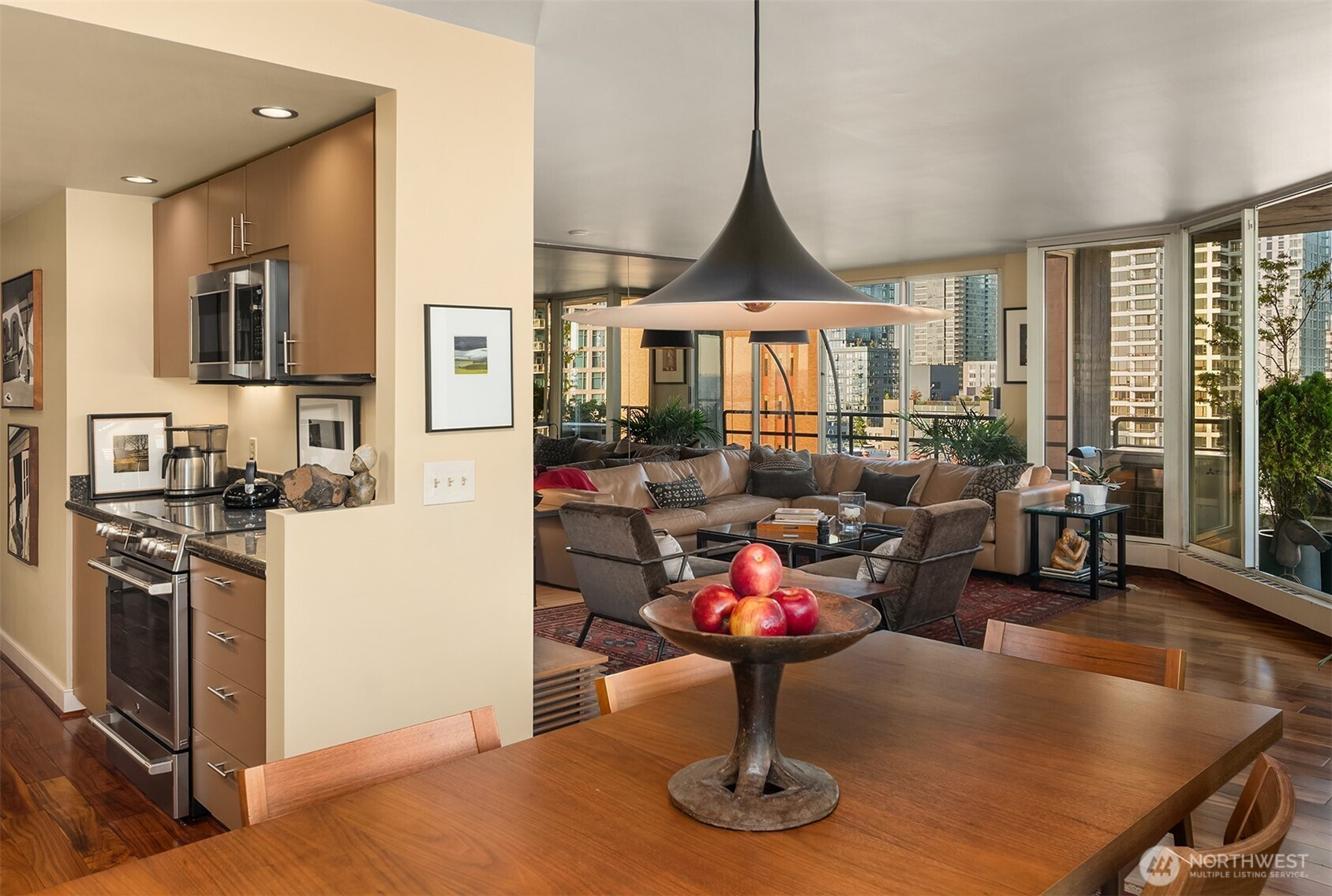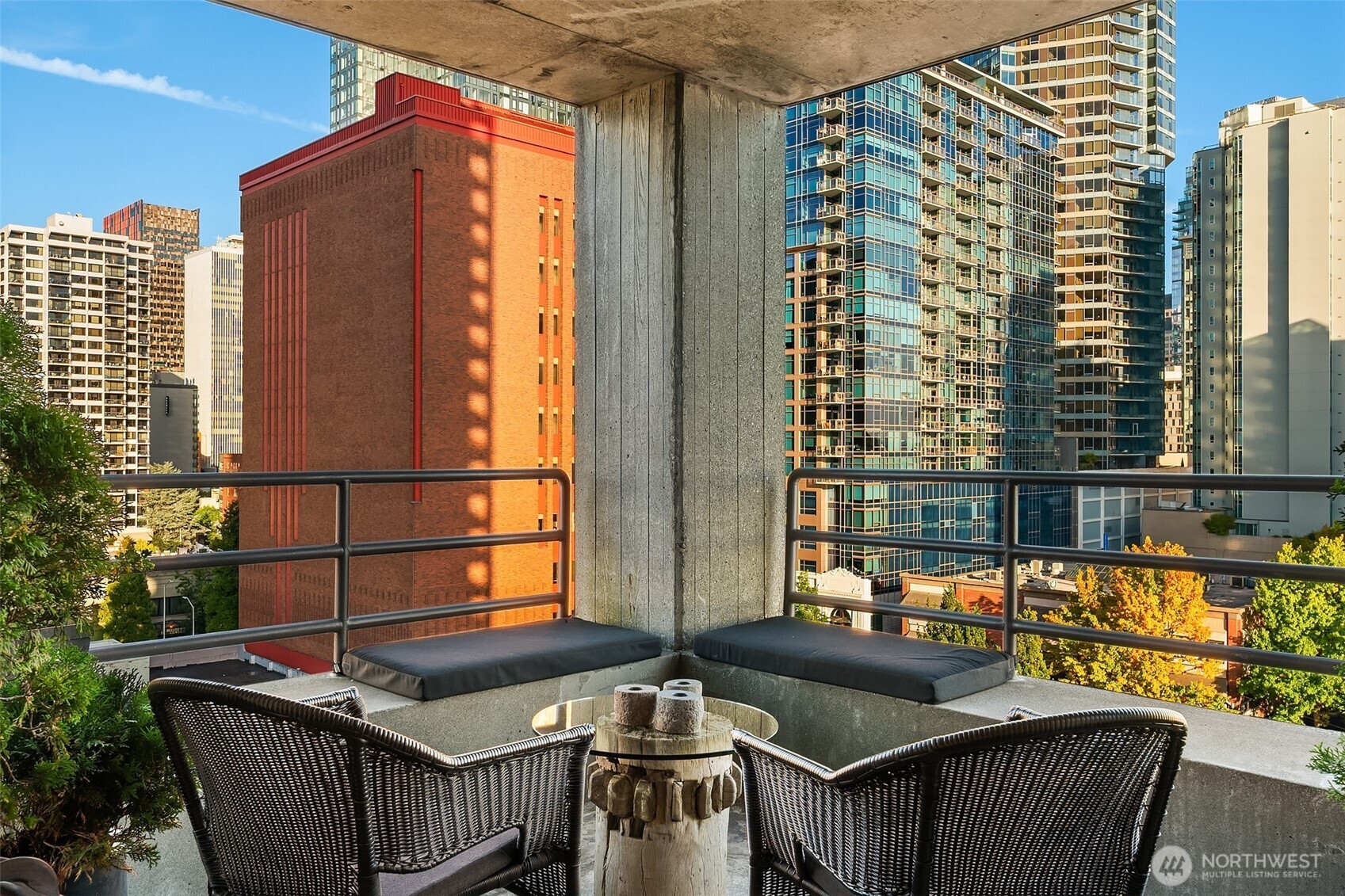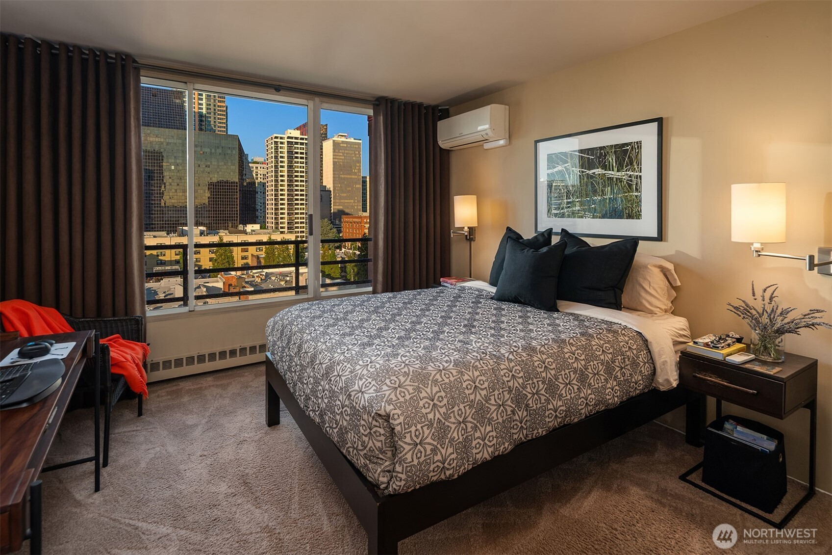 Impeccably renovated 2-bedroom / 2-bath unit at Continental Place features a neutral Northwest Contemporary Palette, with wrap-around views from the Space Needle to Mt. Rainier, the Ferris Wheel, and the ferries. A built-in window seat provides the perfect perch for watching ferries glide along the glistening waters below. A large, covered corner balcony for seating, air-conditioning, 24 hour door-staff, pool, gym, community room, sculpture garden, guest suite, pkg, and storage. Steps to the Pike Place Market, Overlook Walk, and Seattle’s new Waterfront Park.