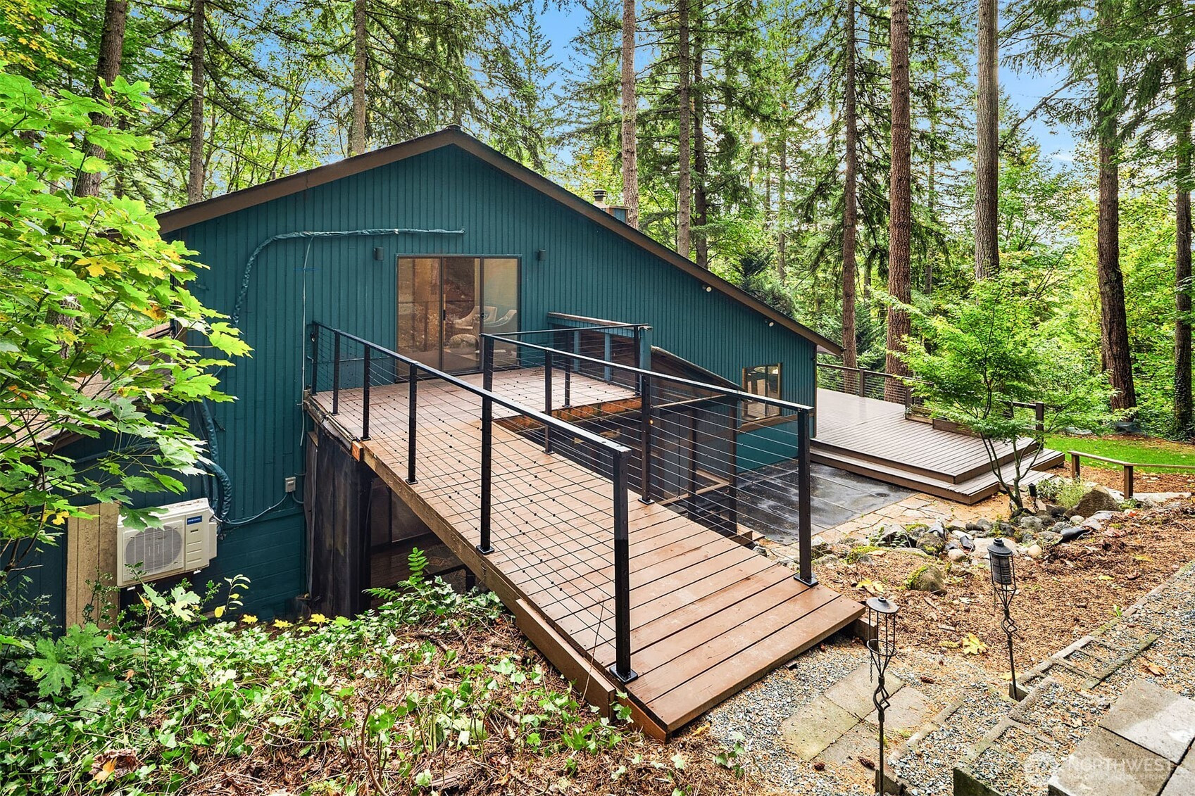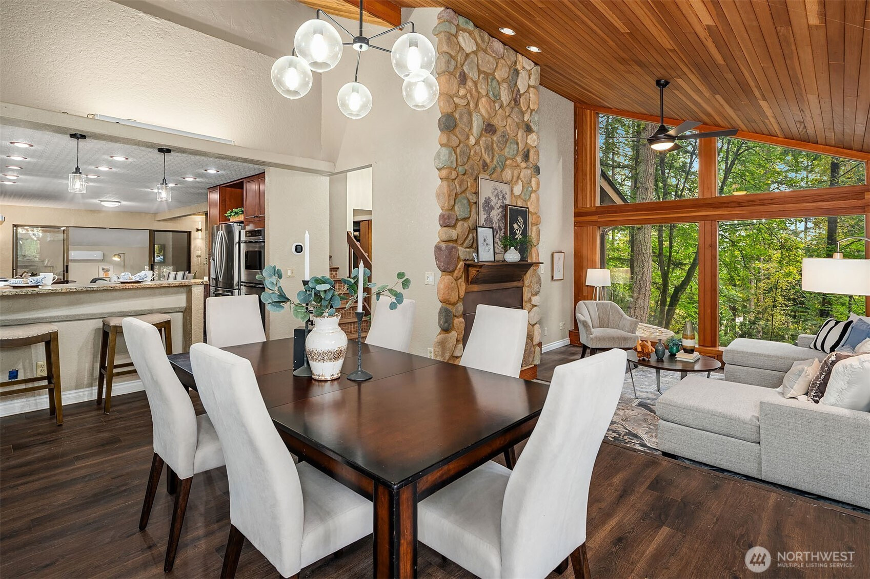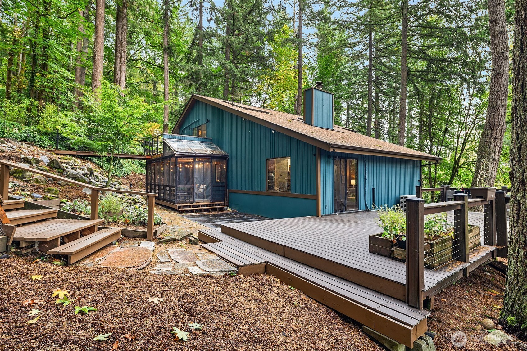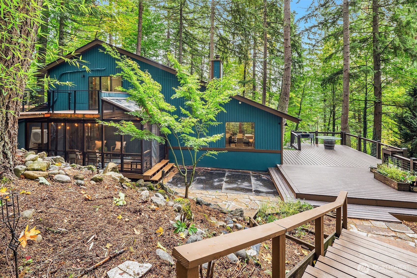 Inviting Northwest contemporary home in desirable Mirrormont. Wooded and wonderful with an expansive deck and screened porch to enjoy nature year-round. Recently updated with a new roof in 2024 and fresh interior paint in 2025, the home features a gourmet kitchen with high-end appliances, including a Wolf 6-burner range and Thermador double ovens. Spacious dining room with deck access. A charming river rock gas fireplace warms the living room with expansive windows looking out to the stunning evergreens. The primary suite offers vaulted ceiling, updated double-vanity 3/4 bath, and walk-in closet. Enjoys direct access to the upper deck and sky bridge to the upper yard with a fireplace. Highly regarded Issaquah Schools.