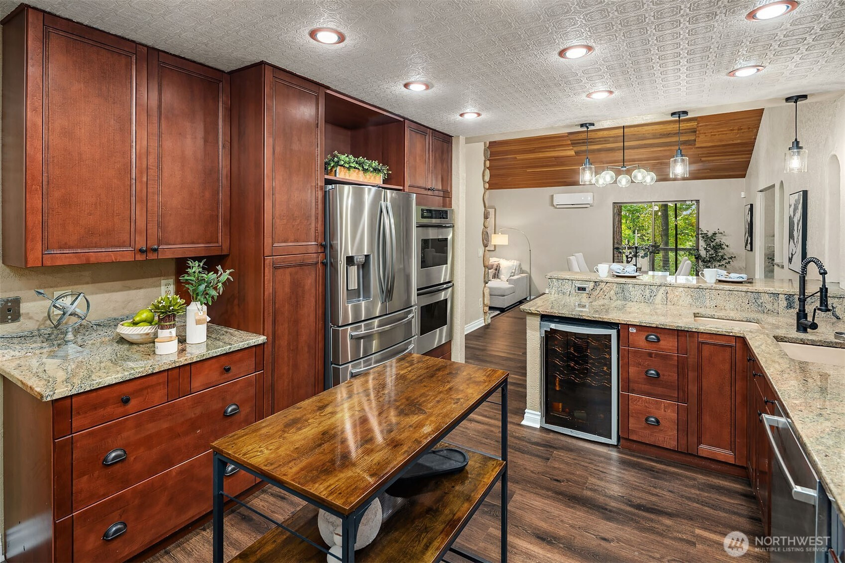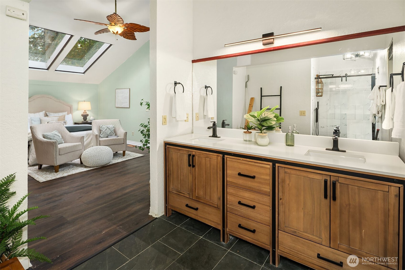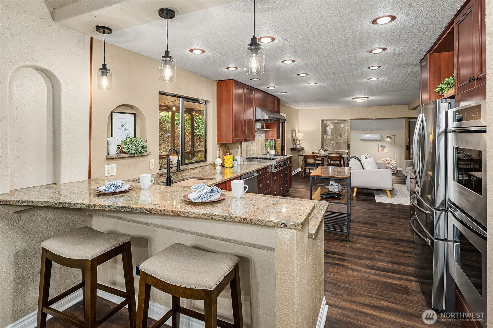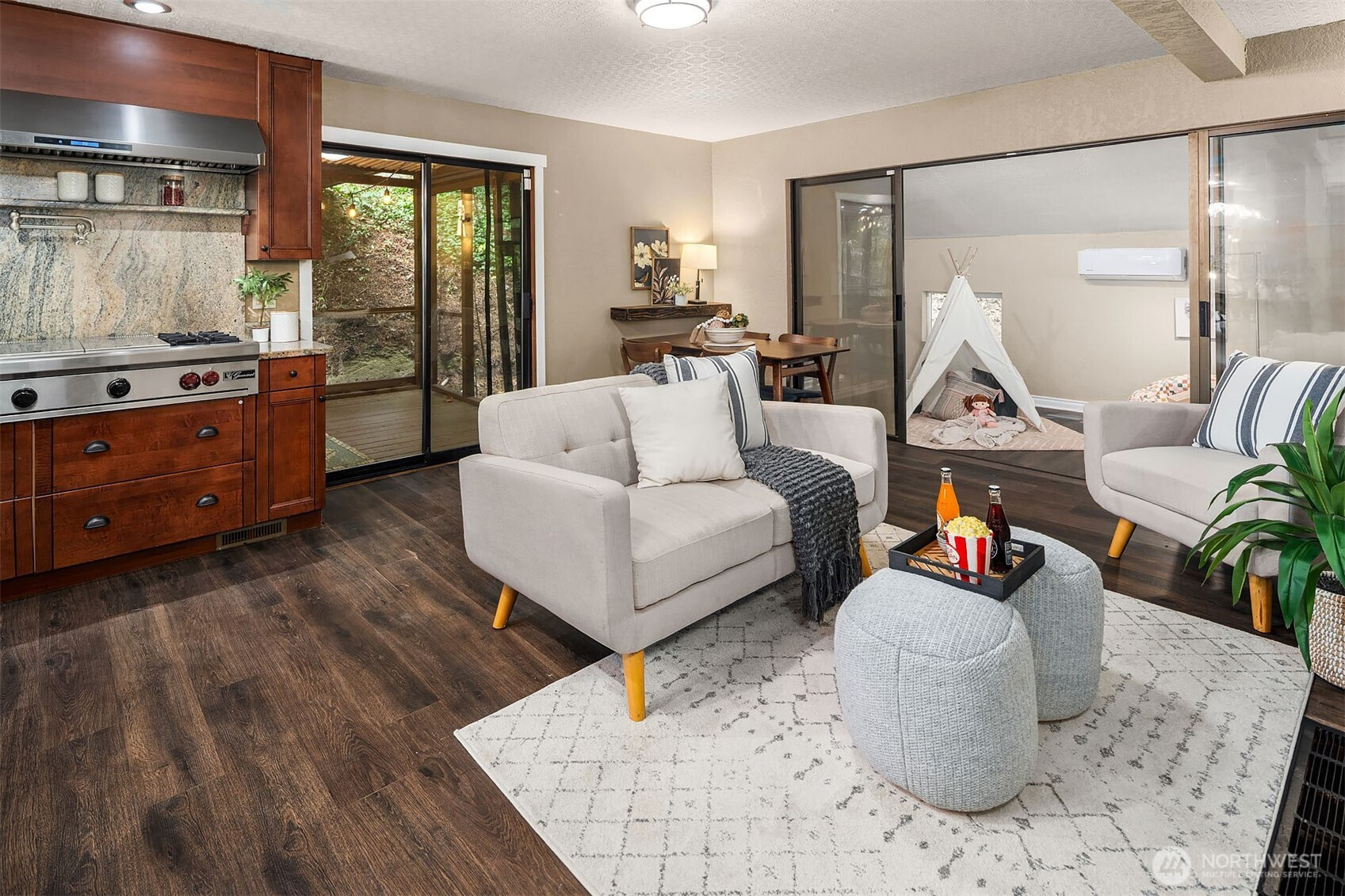 Inviting Northwest contemporary home in desirable Mirrormont. Wooded and wonderful with an expansive deck and screened porch to enjoy nature year-round. Recently updated with a new roof in 2024 and fresh interior paint in 2025, the home features a gourmet kitchen with high-end appliances, including a Wolf 6-burner range and Thermador double ovens. Spacious dining room with deck access. A charming river rock gas fireplace warms the living room with expansive windows looking out to the stunning evergreens. The primary suite offers vaulted ceiling, updated double-vanity 3/4 bath, and walk-in closet. Enjoys direct access to the upper deck and sky bridge to the upper yard with a fireplace. Highly regarded Issaquah Schools.