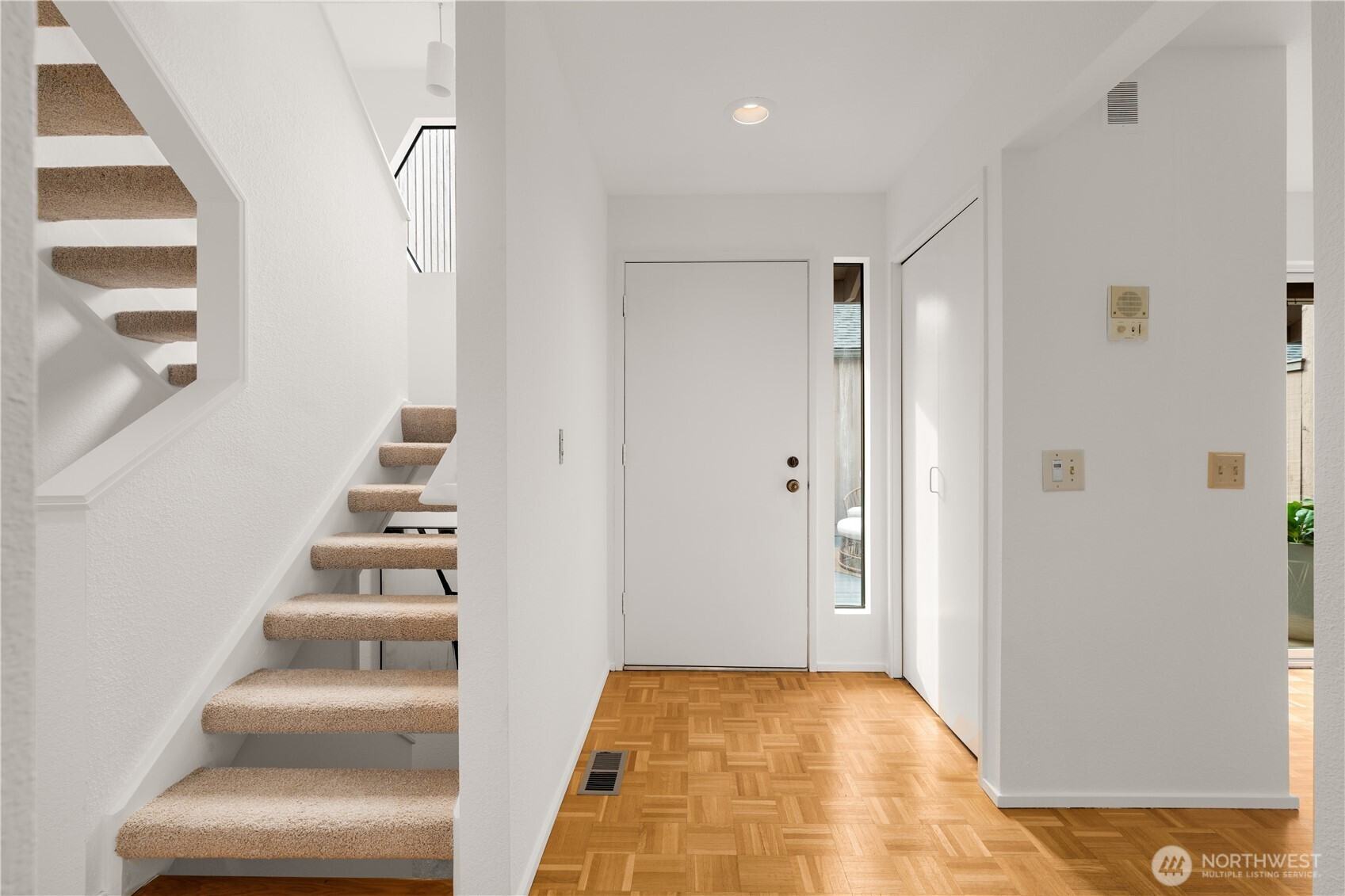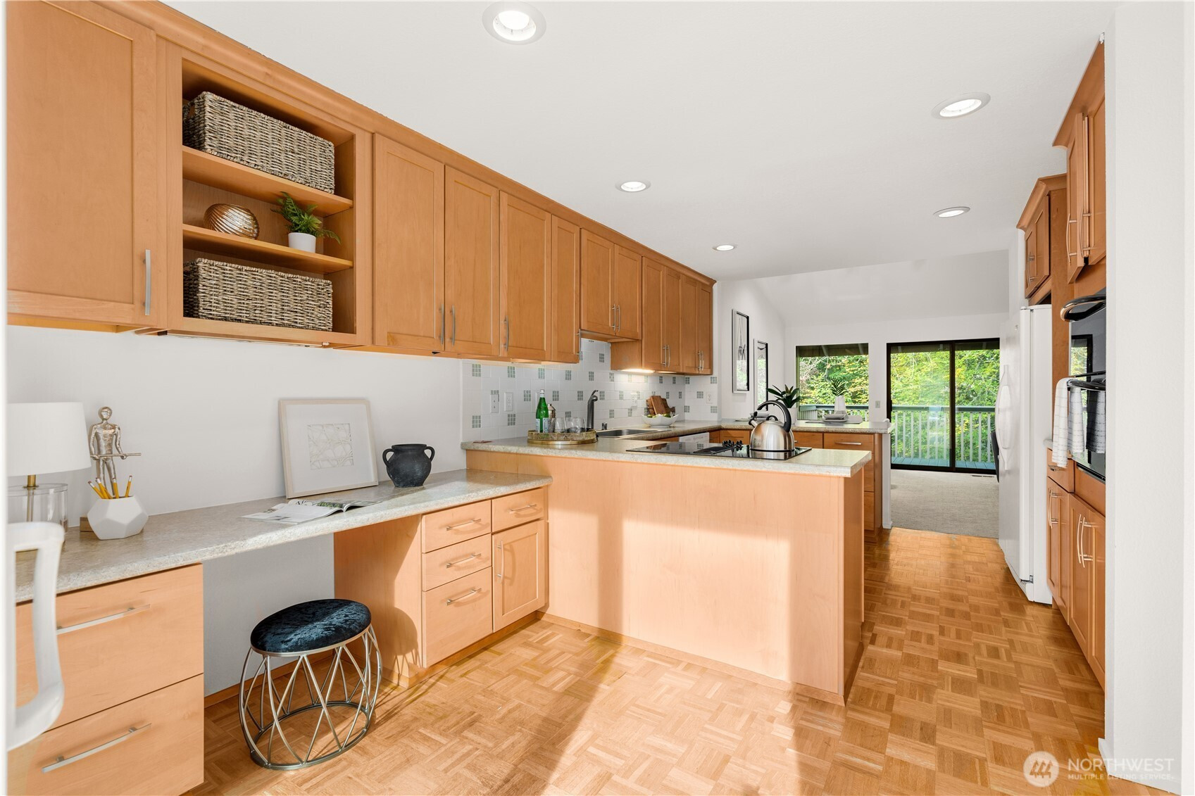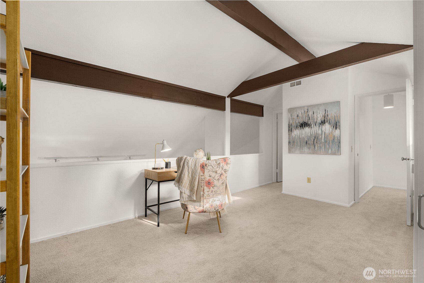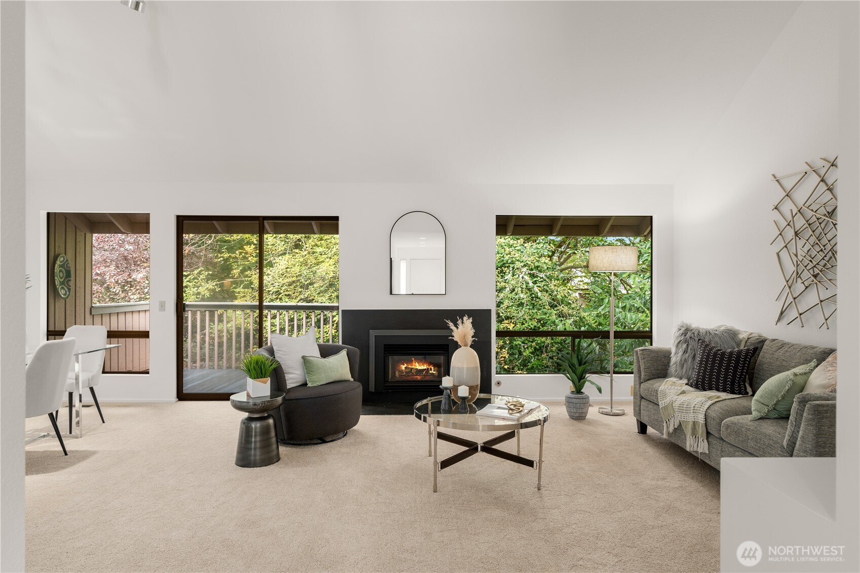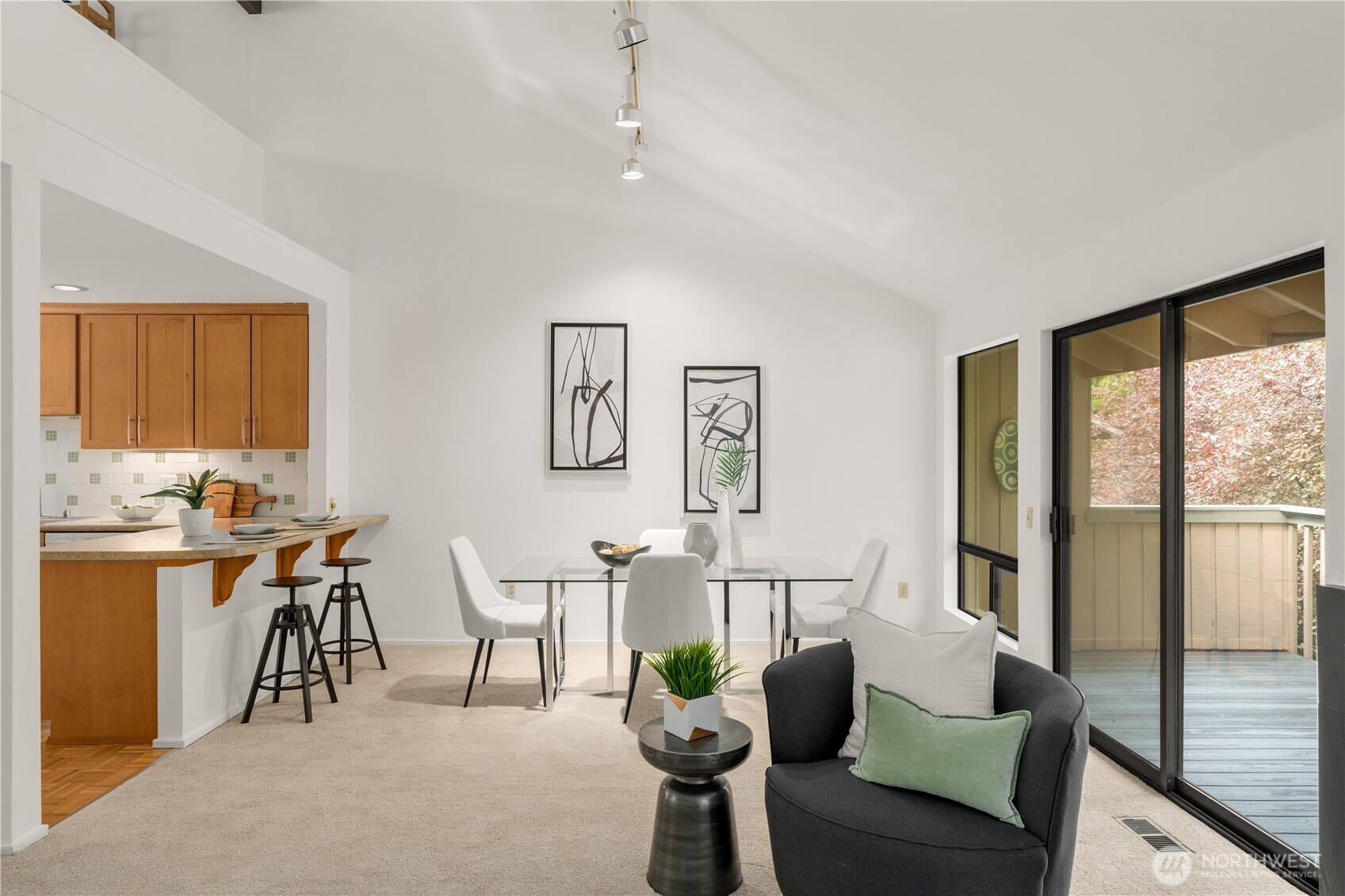 Tucked into a peaceful greenbelt with a year-round creek below, this refreshed townhome feels like a serene retreat and lives like a single-family home. Freshly painted with new carpet, you are welcomed by original hardwood parquet floors, a bright kitchen and sunny nook opening to a spacious private courtyard deck, perfect for morning coffee or evening gatherings. The vaulted living room has stylish wood beams, a modern gas fireplace insert and opens to a treetop deck. Two restful bedrooms, including primary suite, and a sunny loft with its own bath offer flexible space for work or other endeavors and great guest space. A spacious separate 2 car garage and tons of closet space round out the livability of this home.